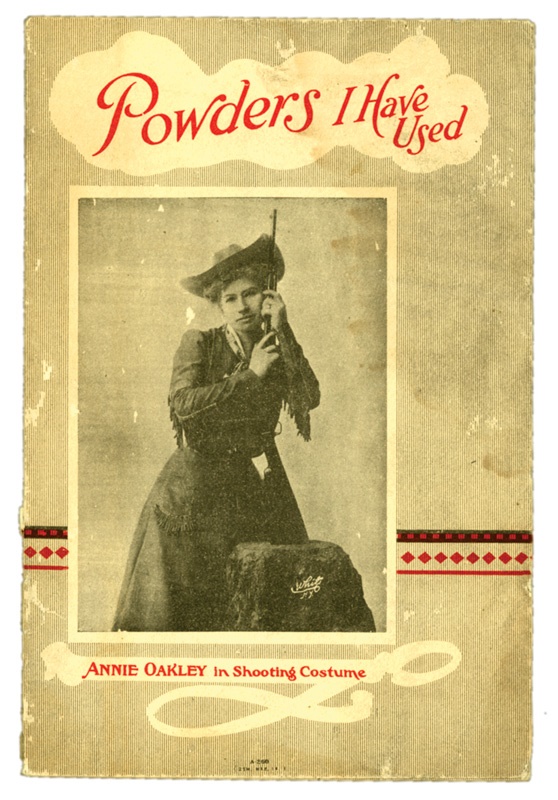 1914 advertising booklet, co-created by the Schultze and Lesmok gunpowder companies, features the silver screen legend and expert rifle & shotgun markswoman, Annie Oakley. The “Little Sure Shot” (given name Phoebe Anne Moses) achieved worldwide fame as a member of Buffalo Bill’s Wild West Show. Book is entitled, “Powders I Have Used”, and serves as an instructional guide for different kinds of gunpowder, as told by Annie Oakley. Inside pages contain several photos of Annie Oakley, including one from her private shooting grounds at her home in Florida, as well as in the Arena. Cover is VG, inside pages EX.