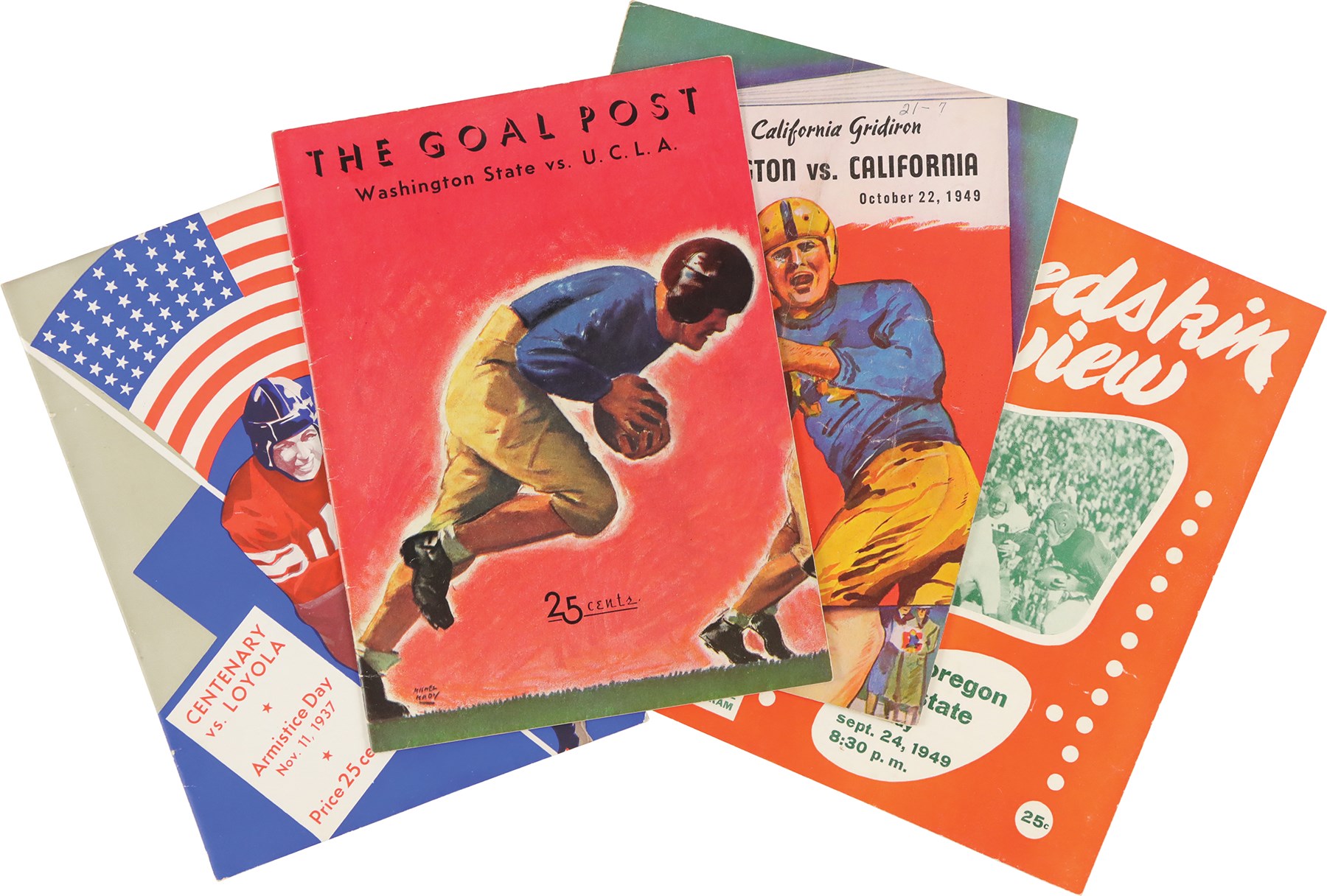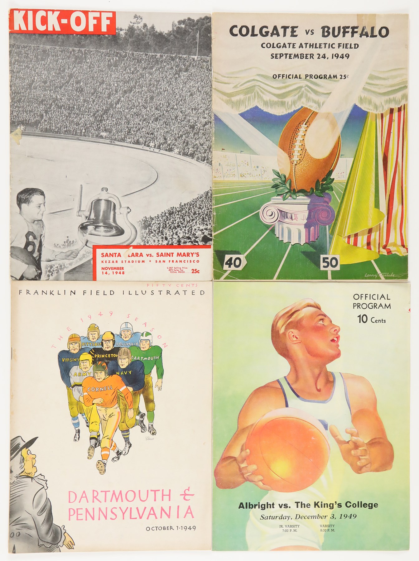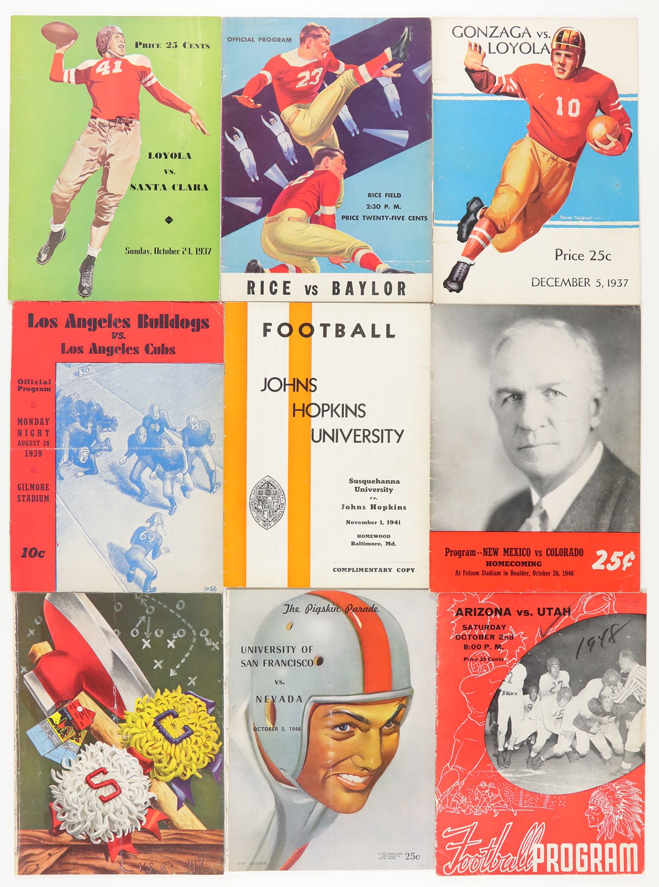 1937-49 College Football Program Collection of (17) programs. The collection includes: 10/23 1937 Washington State vs UCLA; 10/24/1937 Loyola vs Santa Clara; 11/11/1937 - Armistice Day Centenary vs Loyola; 11/27/1937 Rice vs Baylor; 12/5/1937 Gonzaga vs Loyola (all 1937 programs have back cover paper loss); 8/28/1939 Los Angeles Bulldogs vs Los Angeles Cubs American Professional League - Back Cover Unattached - Program Creased and Worn; 11/1/1941 Susquehanna vs Johns Hopkins; 10/26/1946 New Mexico vs Colorado; 11/22/1947 California vs Stanford - Jim Turner; 10/2/1948 Arizona vs Utah - water stain edge; 10/3/1948 University of San Francisco vs Nevada - Richard Stanfel - cover crease; 11/14/1948 Santa Clara vs Saint Mary's - Willard Sherman; 9/24/1949 Oregon State vs Utah - back cover stains; 9/24/1949 Colgate vs Buffalo - first page cut; 10/1/1949 Dartmouth vs Pennsylvania; 10/22/1949 Washington vs California - Don Coryell; Jim Turner; Don Heinrich; Hugh McElhenny - scattered cover creases; and 12/3/1949 Albright vs King's College - Basketball. The programs all exhibit general wear throughout.