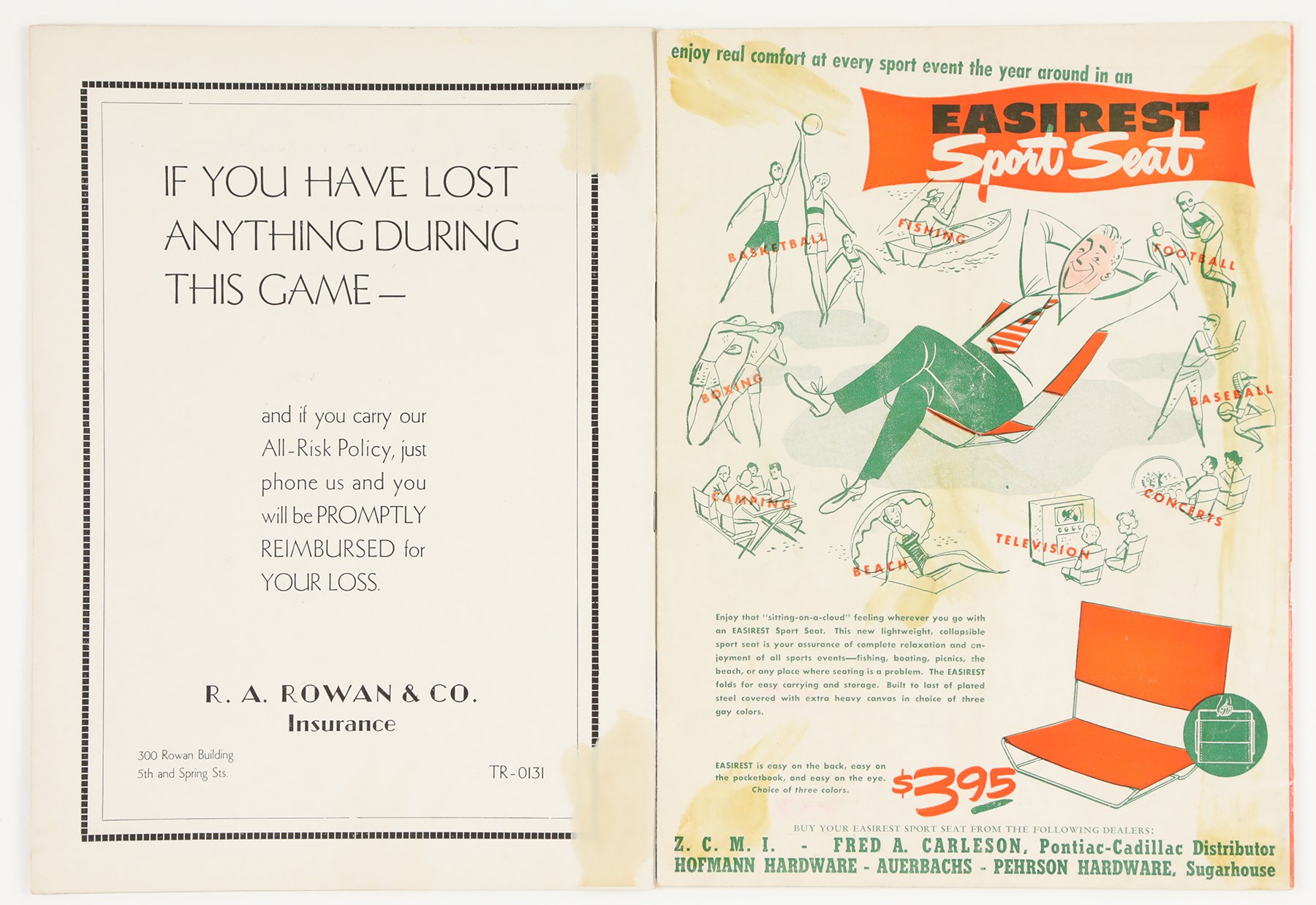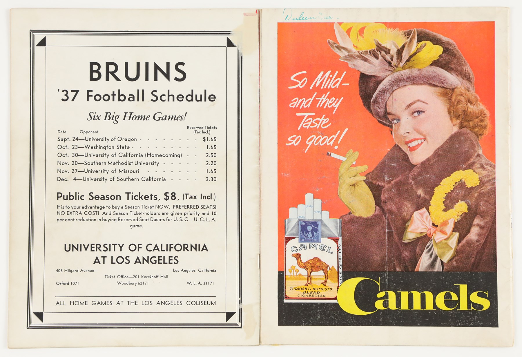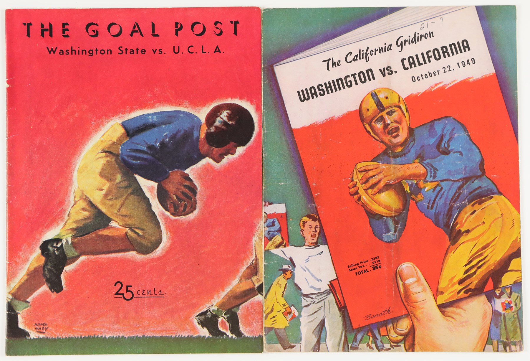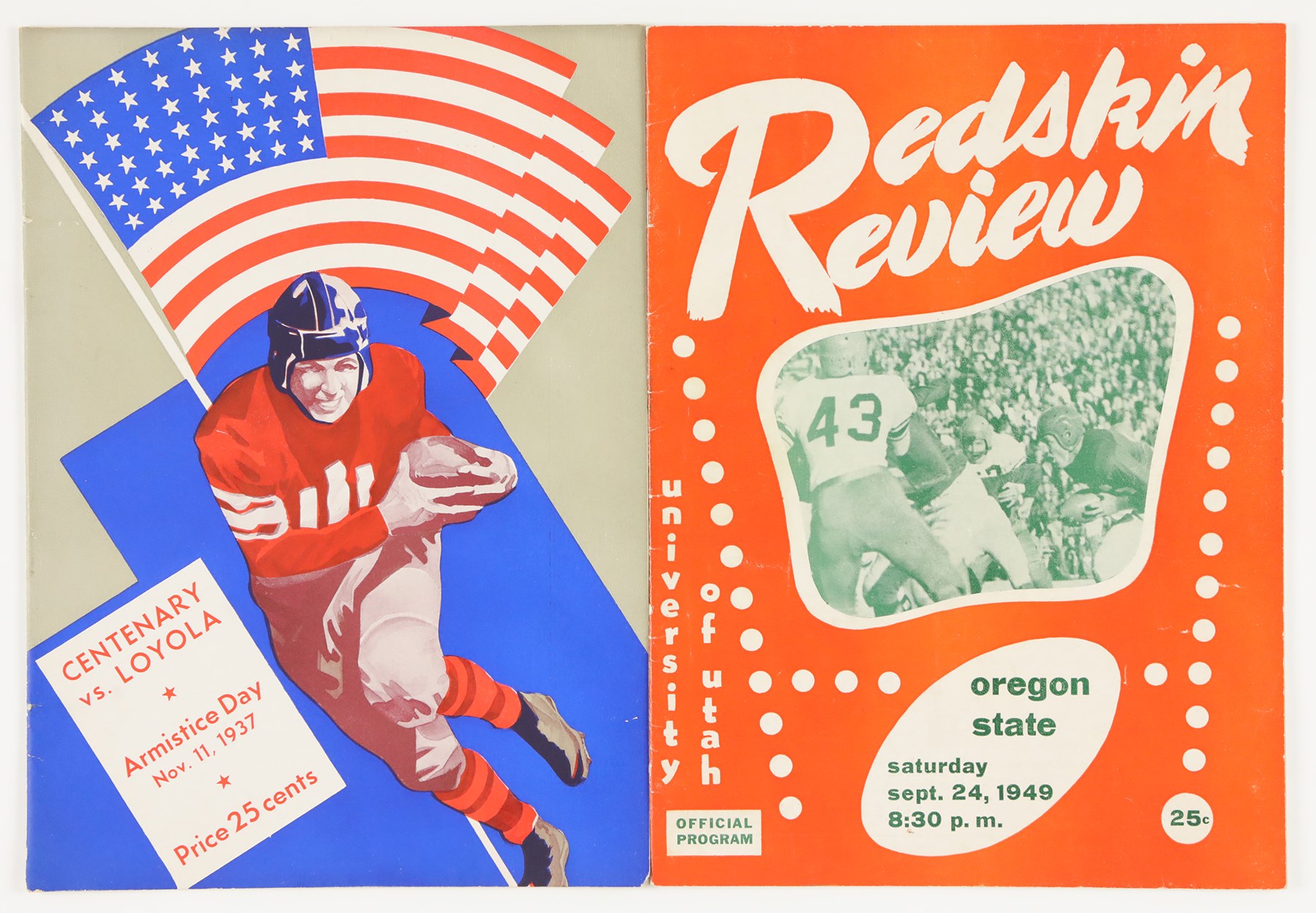 1937-49 College Football Program Collection of (17) programs. The collection includes: 10/23 1937 Washington State vs UCLA; 10/24/1937 Loyola vs Santa Clara; 11/11/1937 - Armistice Day Centenary vs Loyola; 11/27/1937 Rice vs Baylor; 12/5/1937 Gonzaga vs Loyola (all 1937 programs have back cover paper loss); 8/28/1939 Los Angeles Bulldogs vs Los Angeles Cubs American Professional League - Back Cover Unattached - Program Creased and Worn; 11/1/1941 Susquehanna vs Johns Hopkins; 10/26/1946 New Mexico vs Colorado; 11/22/1947 California vs Stanford - Jim Turner; 10/2/1948 Arizona vs Utah - water stain edge; 10/3/1948 University of San Francisco vs Nevada - Richard Stanfel - cover crease; 11/14/1948 Santa Clara vs Saint Mary's - Willard Sherman; 9/24/1949 Oregon State vs Utah - back cover stains; 9/24/1949 Colgate vs Buffalo - first page cut; 10/1/1949 Dartmouth vs Pennsylvania; 10/22/1949 Washington vs California - Don Coryell; Jim Turner; Don Heinrich; Hugh McElhenny - scattered cover creases; and 12/3/1949 Albright vs King's College - Basketball. The programs all exhibit general wear throughout.