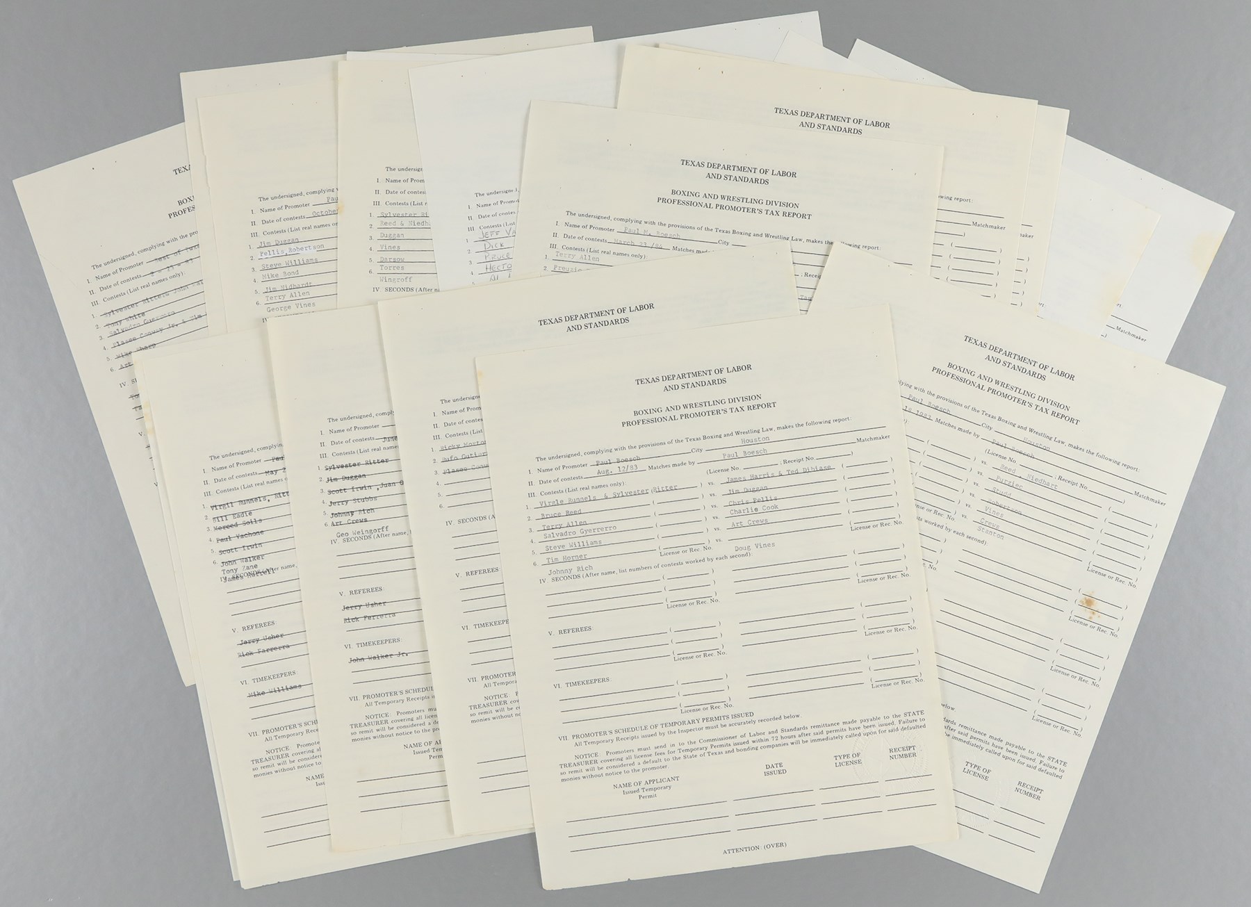 Lot of (25) 1980s Texas Wrestling promoter's tax report sheets (8.5x11"), including Hall of Fame wrestling legends. Two of the pages are signed by Vice-President of Texas Wrestling, Peter Birkholz. Some wrestlers mentioned on the front page of the tax sheets include, Tony White (Tony Atlas), Ernie Ladd, Jim Duggan, Ted DiBiase, Bruce Reed, Billy Graham, Dick Slater, Magnum TA, King Kong Bundy, Junkyard Dog, Gino Hernandez, and more. There are staple holes in the top left corners of the pages. Pages are in very good to excellent condition overall.