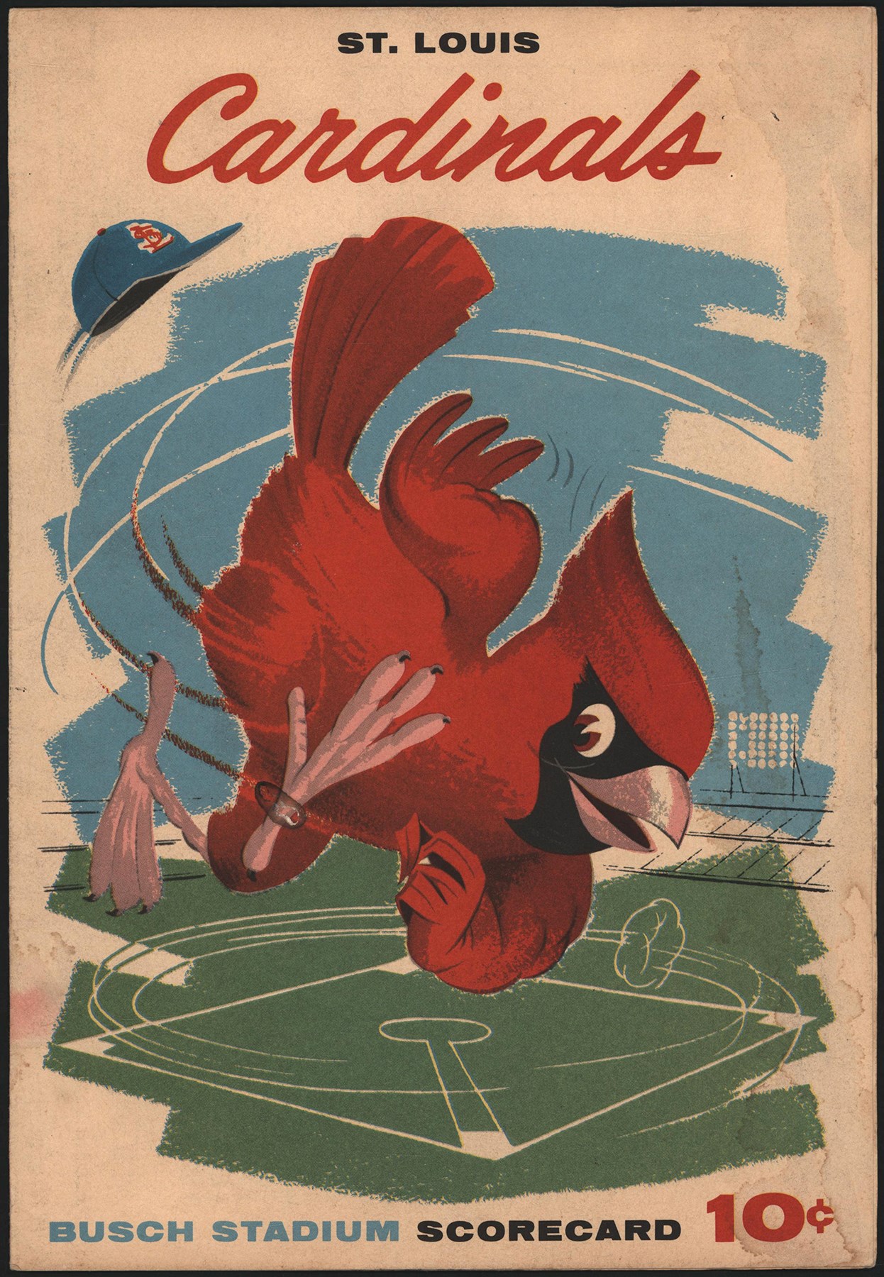 The offered scorecard is made of thin card stock. The cover page reads, "ST. LOUIS CARDINALS/BUSCH STADIUM/SCORECARD 10 c[ents]." The scorecard has darkened, but not to excess, over the ensuing years. The cover page has staple holes and a few small stains. The inside pages show a few staple holes and a few stains, one obvious stain, but not in the scoring area. The back page is solely a beer advertisement - not surprisingly, for, (what else?) Busch Beer. This back page does have significant staining, most likely from glue remnants, and also some small spots of paper loss and staple holes, but no baseball related information is on this back cover. A hand-scored scorecard for the first game in history for any team is very rare, and this offering makes a great addition to the sports collection of any baseball aficionado.
