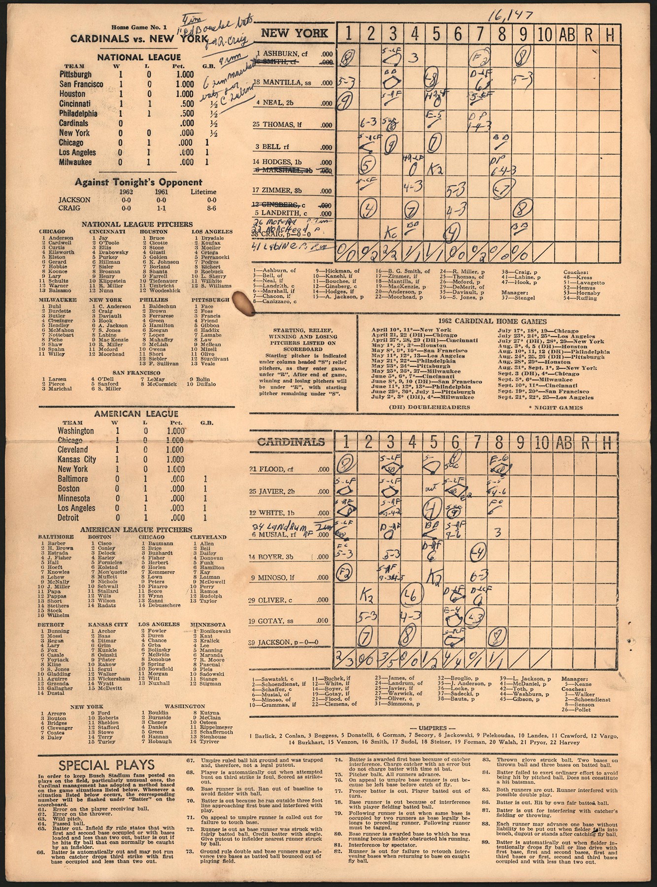 Presented is a very scarce, historic scorecard, fully scored, from the first regular season game in the history of the New York Mets. The game took place on Wednesday night, April 11, 1962, in St. Louis, Missouri, at Busch Stadium I. The Mets were an expansion team, and to attract fans, they had loaded their roster with big name players who were past their prime and thus available in the expansion draft or through trades. The Mets' first game was supposed to be a day game at St. Louis on the day before, but that game was rained out. The New York lineup included leadoff man Richie Ashburn, a center fielder and future hall of Famer, and four former Brooklyn Dodgers, Hall of Famer Gil Hodges, Charlie Neal, Don Zimmer, and starting pitcher Roger Craig. A fifth former Brooklyn Dodger, Clem Labine, pitched in this game in relief. The Cardinals defeated the Mets by 11-4, with Larry Jackson getting a complete game win, and Craig taking the loss.