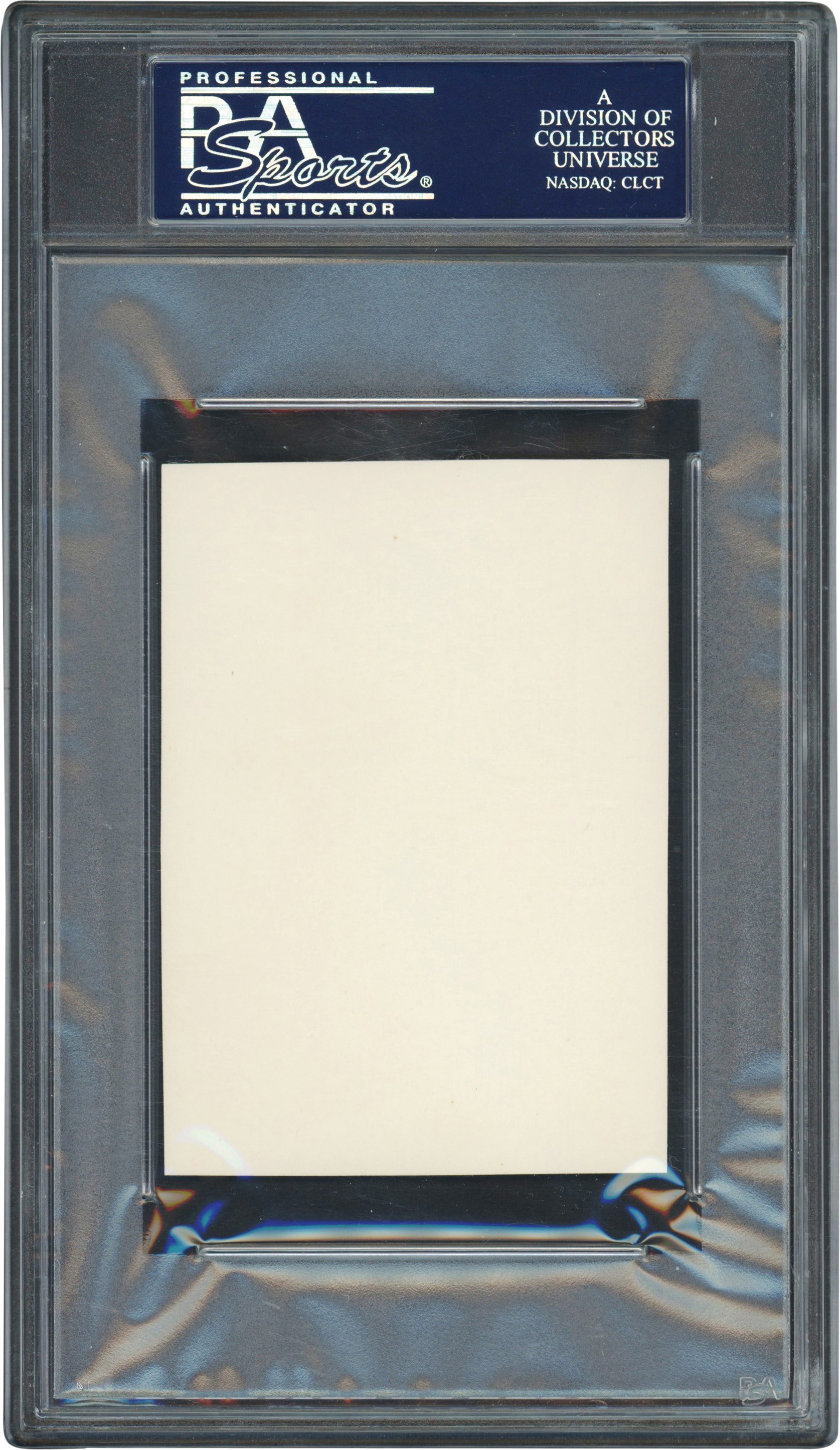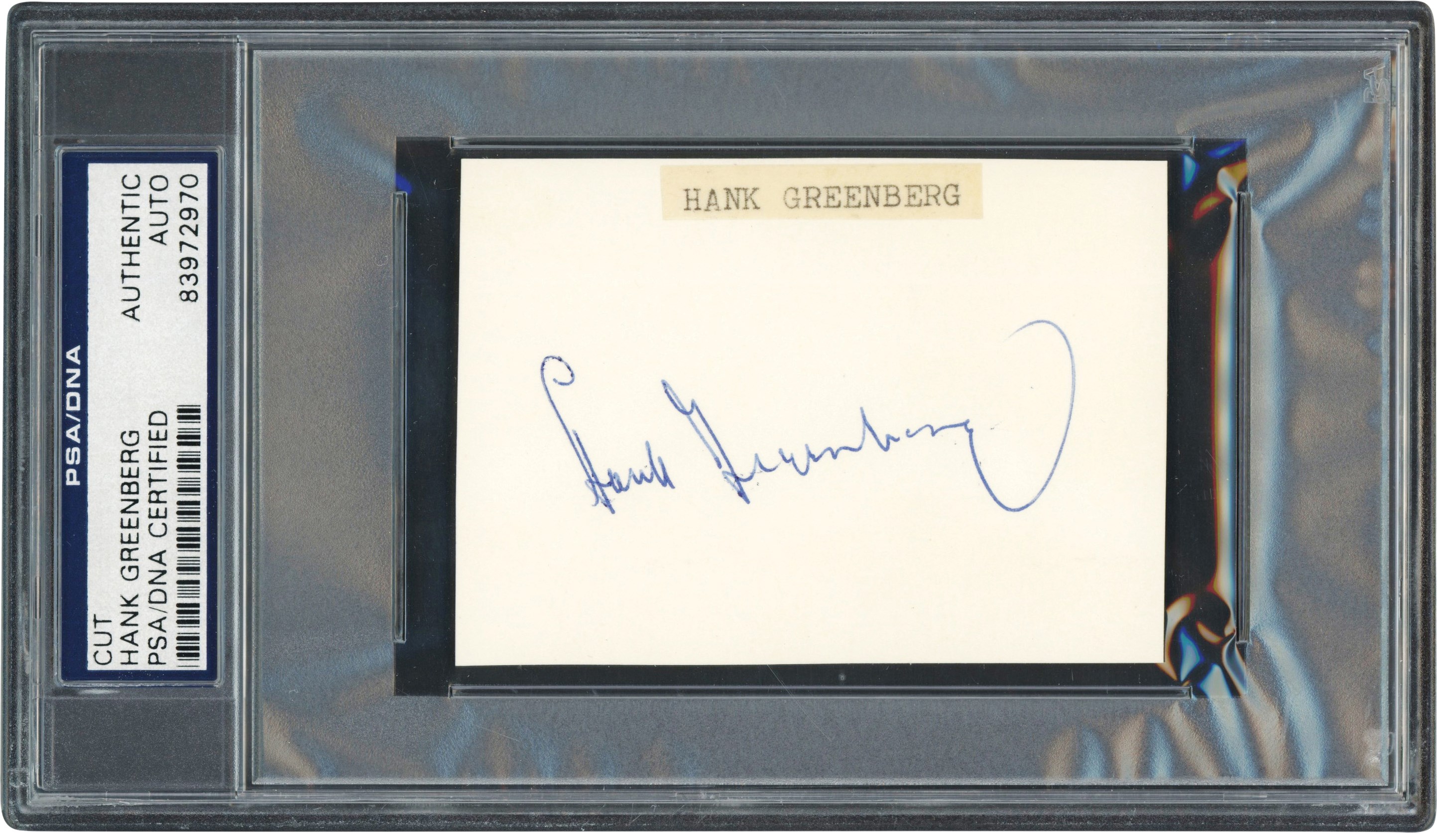 The cut signature is on a piece of white paper or light card stock measuring 2.5x3.5". Greenberg signed a bold signature, about an 8/10, in blue fountain ink. Above Greenberg's signature is "HANK GREENBERG" typed by an unknown person on a narrow strip of paper about 1.5" long. The cut signature has been encapsulated and PSA/DNA Certified "AUTHENTIC AUTO" (83972970). The offering is in EXCELLENT condition.