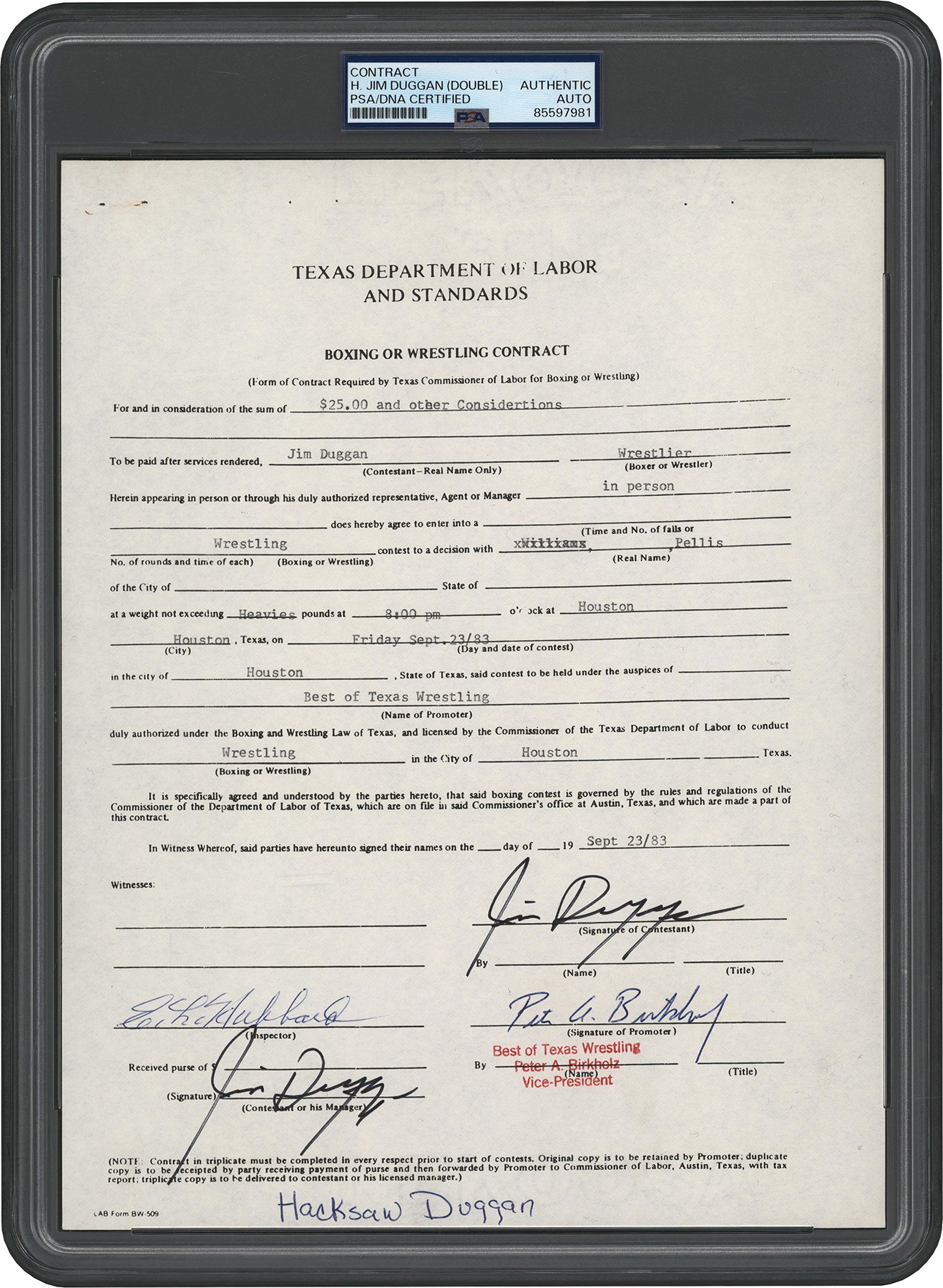 Presented is a 1983 Jim "Hacksaw" Duggan double-signed wrestling contract with Best of Texas Wrestling. The contract is for a wrestling match in Houston, Texas, for Friday, Sept. 23, 1983. Born James Edward Duggan in 1954 in Glens Falls, New York, Duggan played three sports in high school, wrestling, football, and baseball. He attended Southern Methodist University on a football scholarship. After failing to make the Atlanta Falcons, Duggan became a professional wrestler. Over a long wrestling career that began in the 1970s, Duggan was often a comical wrestler, often wrestling on the undercard. Later, he often wrestled as a villain, and for a time wrestled as Big Jim Duggan in the contiguous United States and as The Convict in Hawaii, where he wore a mask. Duggan once was part of a story line in which he feuded with Butch "Hacksaw" Reed, alleging that Reed has stolen Duggan's nickname. Duggan won the first ever Royal Rumble in 1988, and he was once a WWE heavyweight champion. Hacksaw Duggan is now semi-retired from the ring.