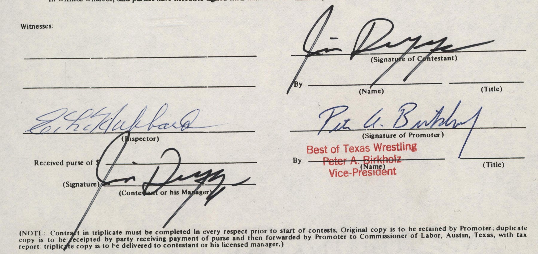 Lot # 292: 1983 "Hacksaw" Jim Duggan Double-Signed Texas Wrestling Fight Contract for Tag-Team Match Against King Kong Bundy & One Man Gang (PSA)