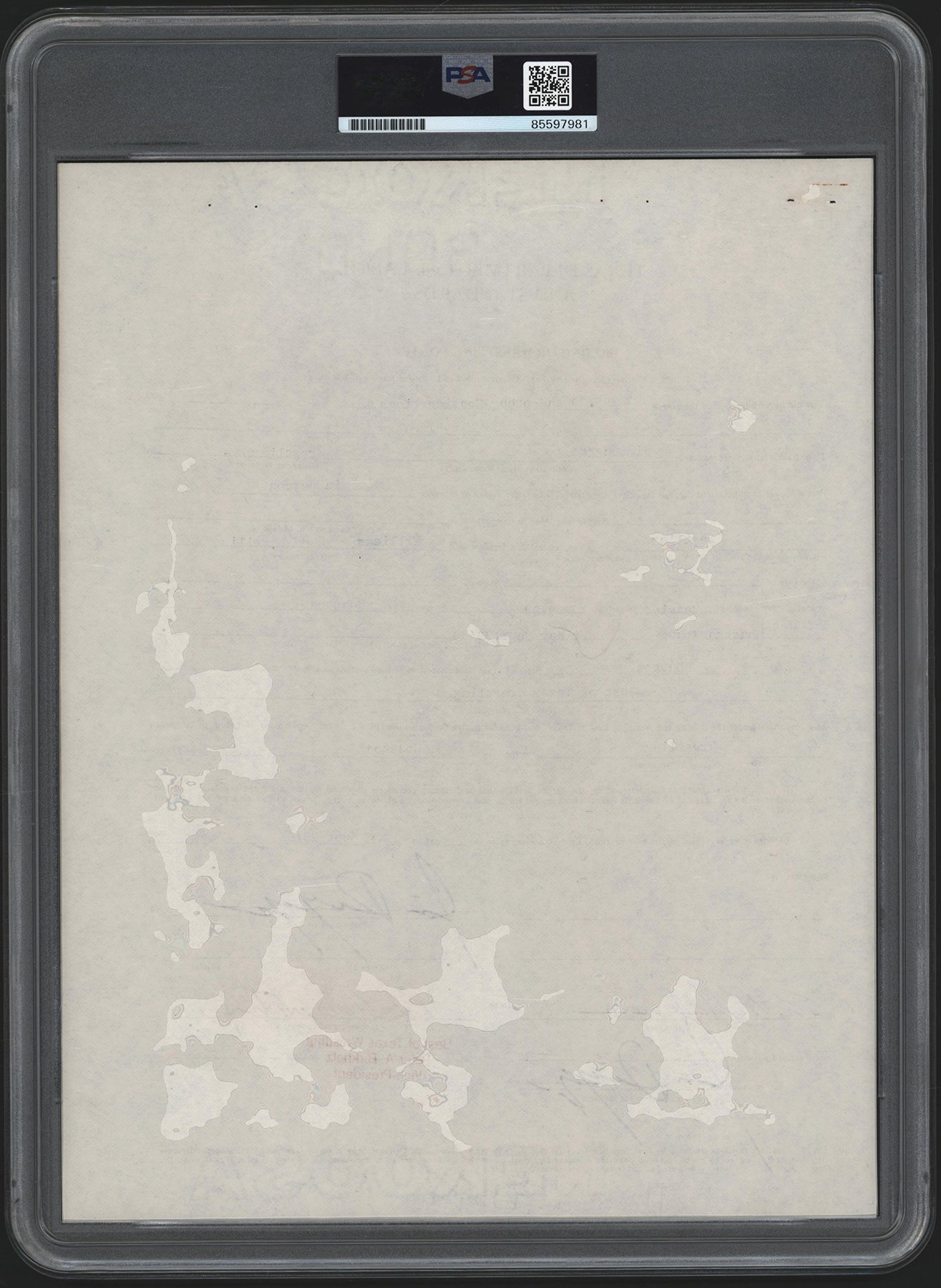 The contract measures 8.5x11". The contract page is headed "TEXAS DEPARTMENT OF LABOR AND STANDARDS/BOXING OR WRESTLING CONTRACT." The fee is listed on the contract as "$25.00 and other considerations." The contract states that the fight was for "xxx, Pellis," and Pellis may be a misspelling for "Pallies" which was King Kong Bundy's legal last name. The signed contract has pinholes in the top left corner. It is overall EXCELLENT condition. Using a fine tip black marker, Duggan signed the contract as "Jim Duggan." the contact has been encapsulated and PSA/DNA Certified as "AUTHENTIC AUTO."