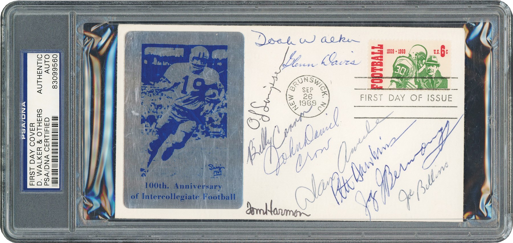 Fittingly, since the first recognized college football game was held between Rutgers and Princeton and played at Rutgers, in New Brunswick, New Jersey, on September 26, 1869, the envelope is postmarked "SEP 26 1969/NEW BRUNSWICK NJ." The signed first day cover has been encapsulated and PSA/DNA Certified as "AUTHENTIC AUTO." The FIRST DAY ISSUE is in EXCELLENT condition.