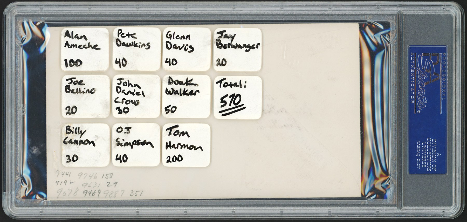 Presented is a multi-signed cover signed by ten Heisman Trophy winners: Alan Ameche, University of Wisconsin, Madison; Joe Bellino, Navy; Glenn Davis, Army; O.J. Simpson, USC; Doak Walker, TCU; Billy Cannon, LSU; Pete Dawkins, Army; Jay Berwanger, University of Chicago; Tom Harmon, Michigan; John David Cow, Texas A&M.