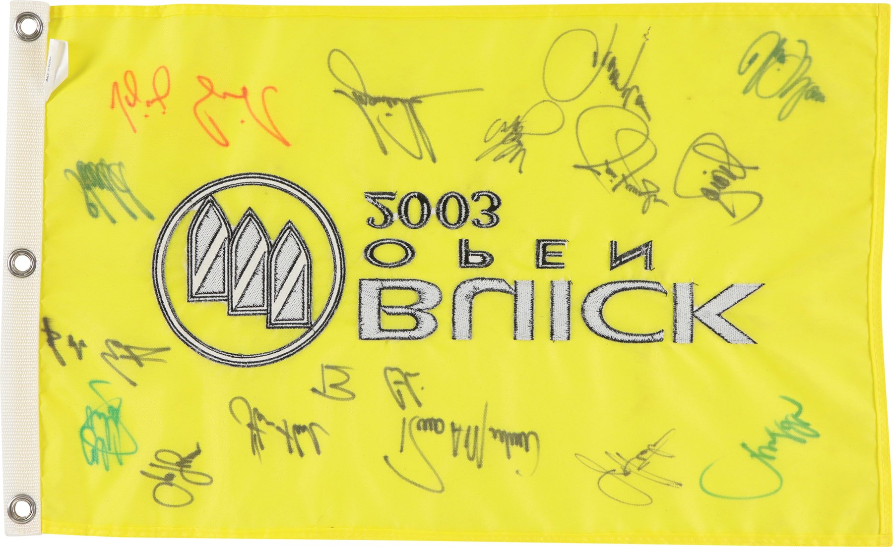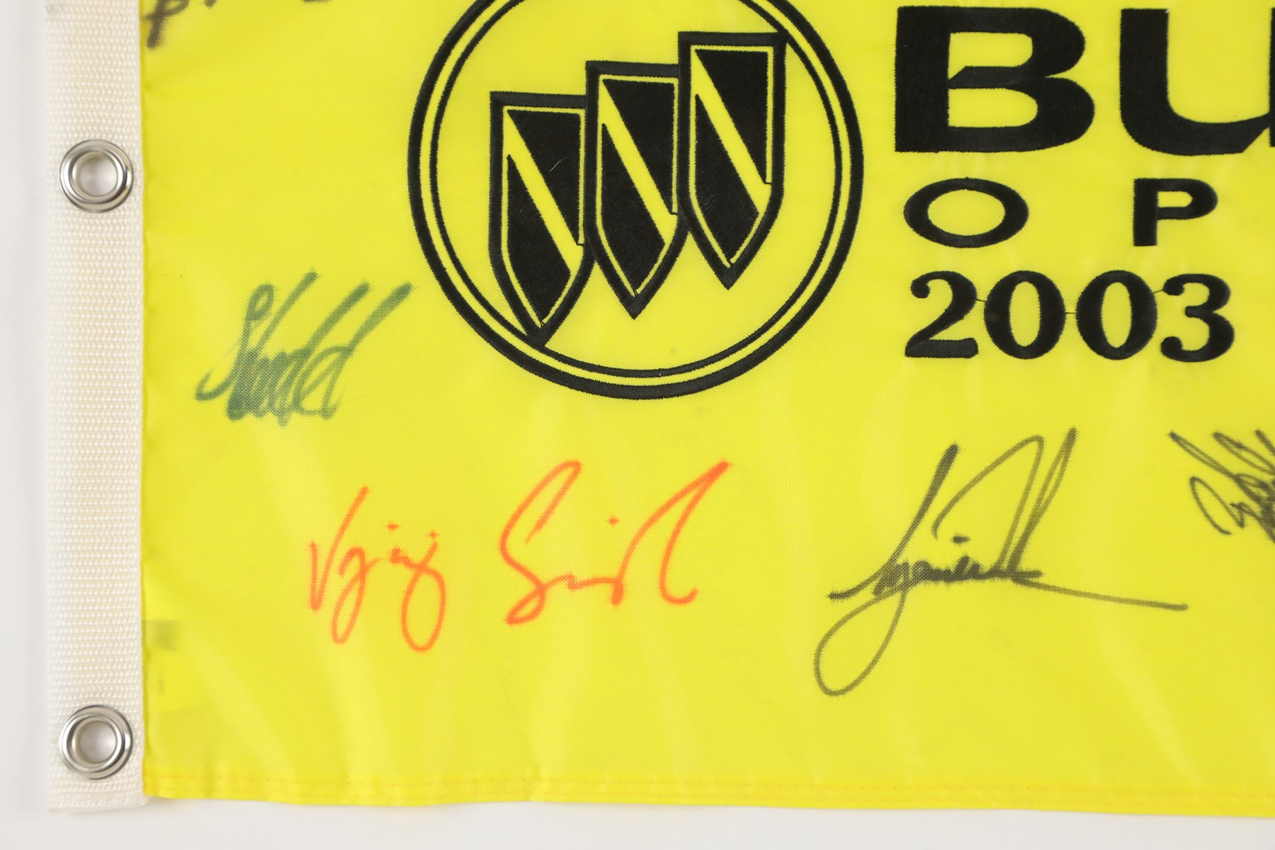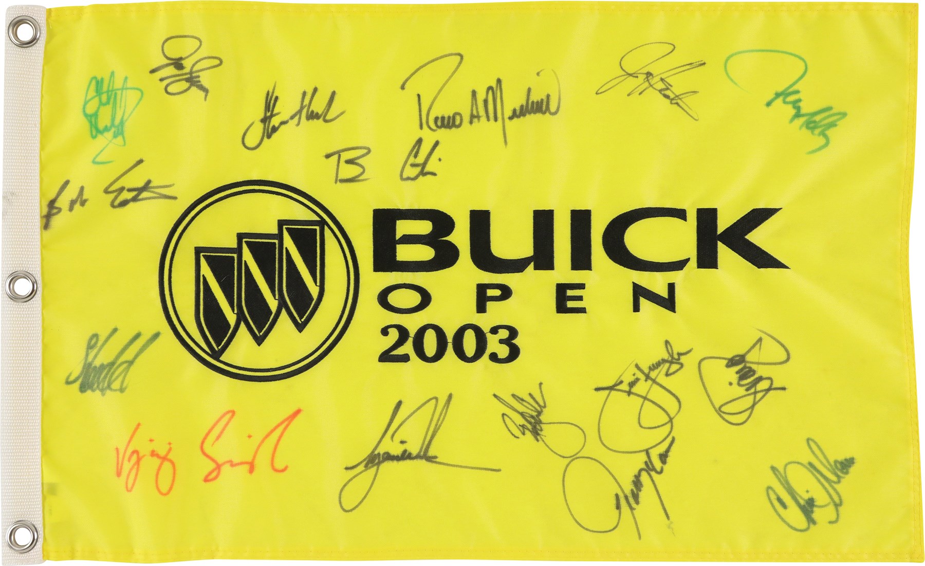 Presented is a 2003 Buick Open flag (22x13.5") signed by 16 golfers, including Tiger Woods, Vijay Singh, Charles Howell, Bob Estes, Jeff Sluman, Steve Flesch, Ben Curtis, Rocco Mediate, John Huston, Jerry Kelly, Stuart Appleby, Billy Andrade, Jim Furyk, Scott McCarron, Craig Perks, and Chris DiMarco. Furyk won the Buick Open in 2003. This flag is a perfect keepsake to remember the tournament. Includes a full LOA from PSA.
