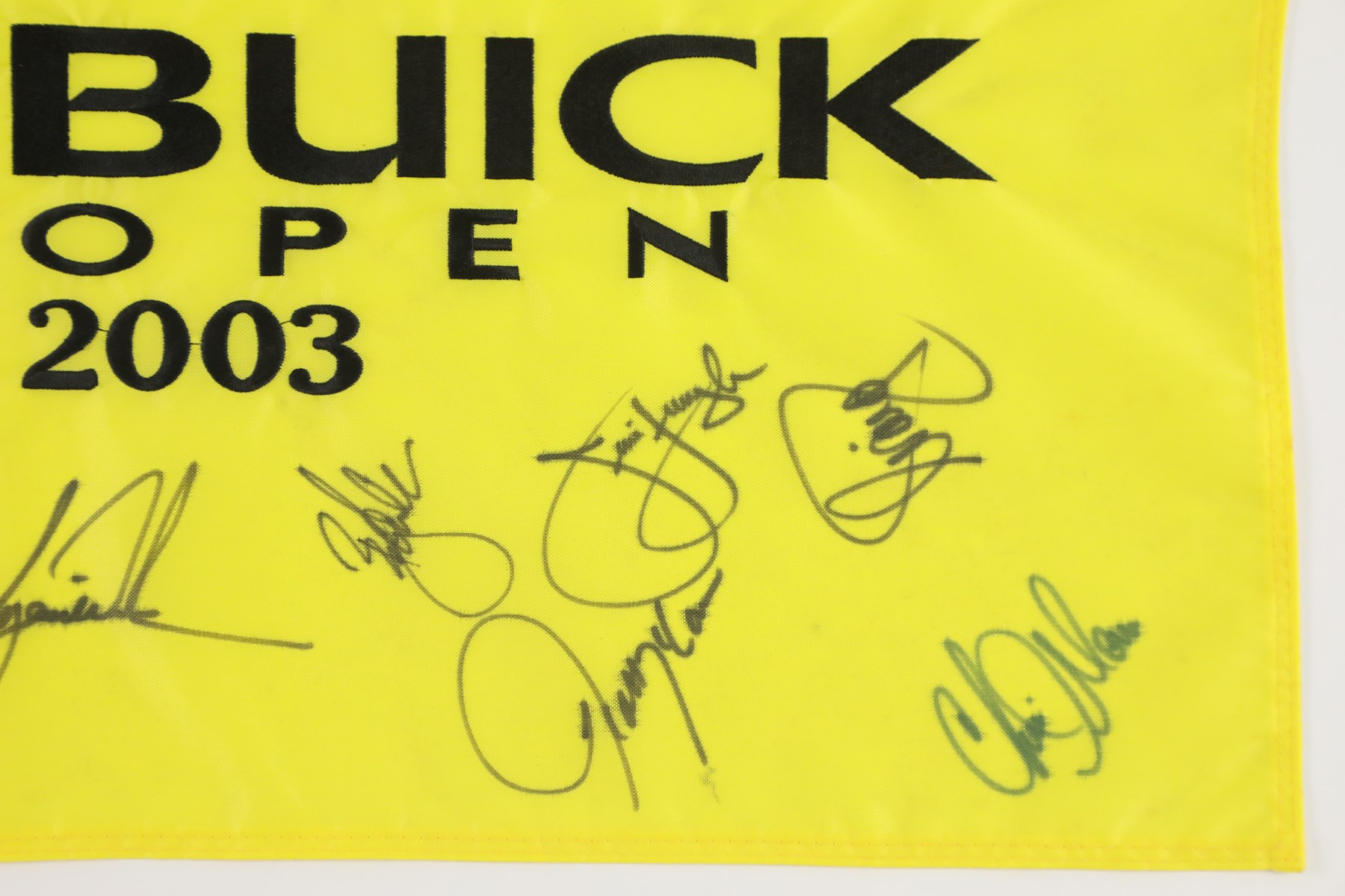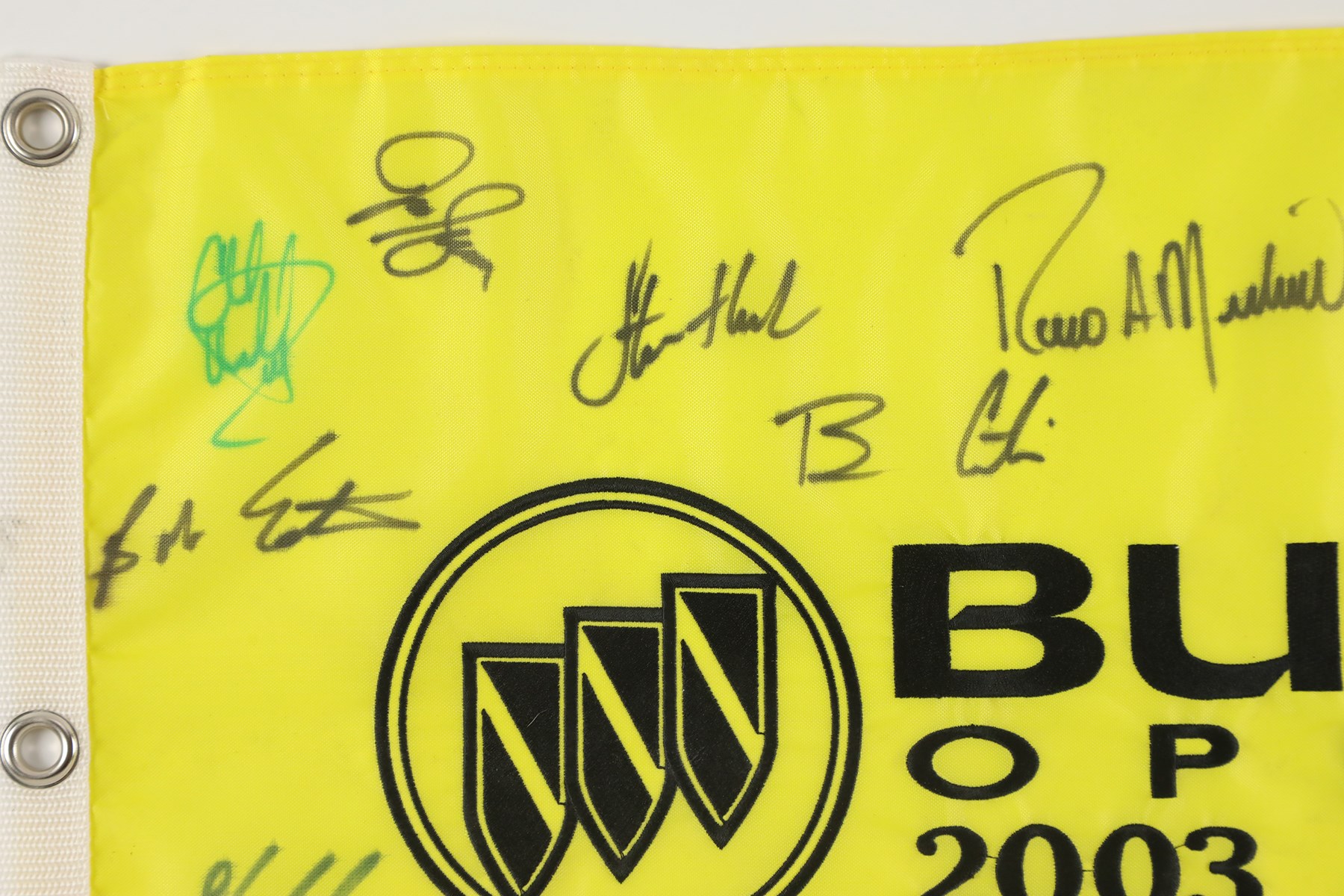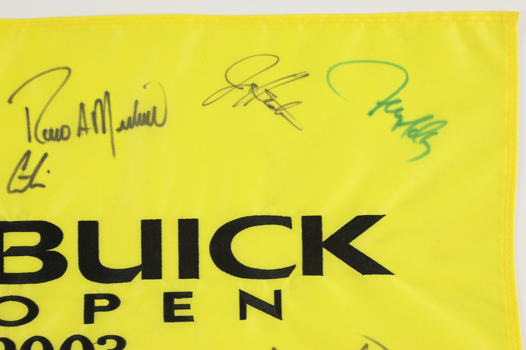 Presented is a 2003 Buick Open flag (22x13.5") signed by 16 golfers, including Tiger Woods, Vijay Singh, Charles Howell, Bob Estes, Jeff Sluman, Steve Flesch, Ben Curtis, Rocco Mediate, John Huston, Jerry Kelly, Stuart Appleby, Billy Andrade, Jim Furyk, Scott McCarron, Craig Perks, and Chris DiMarco. Furyk won the Buick Open in 2003. This flag is a perfect keepsake to remember the tournament. Includes a full LOA from PSA.