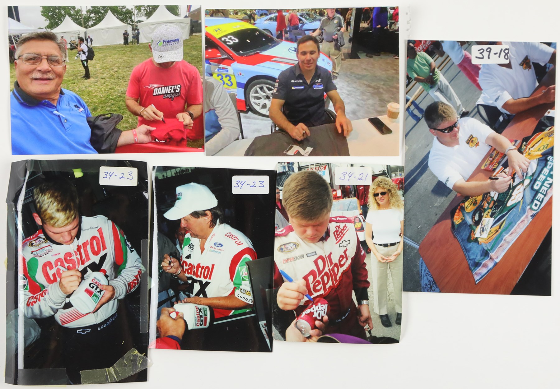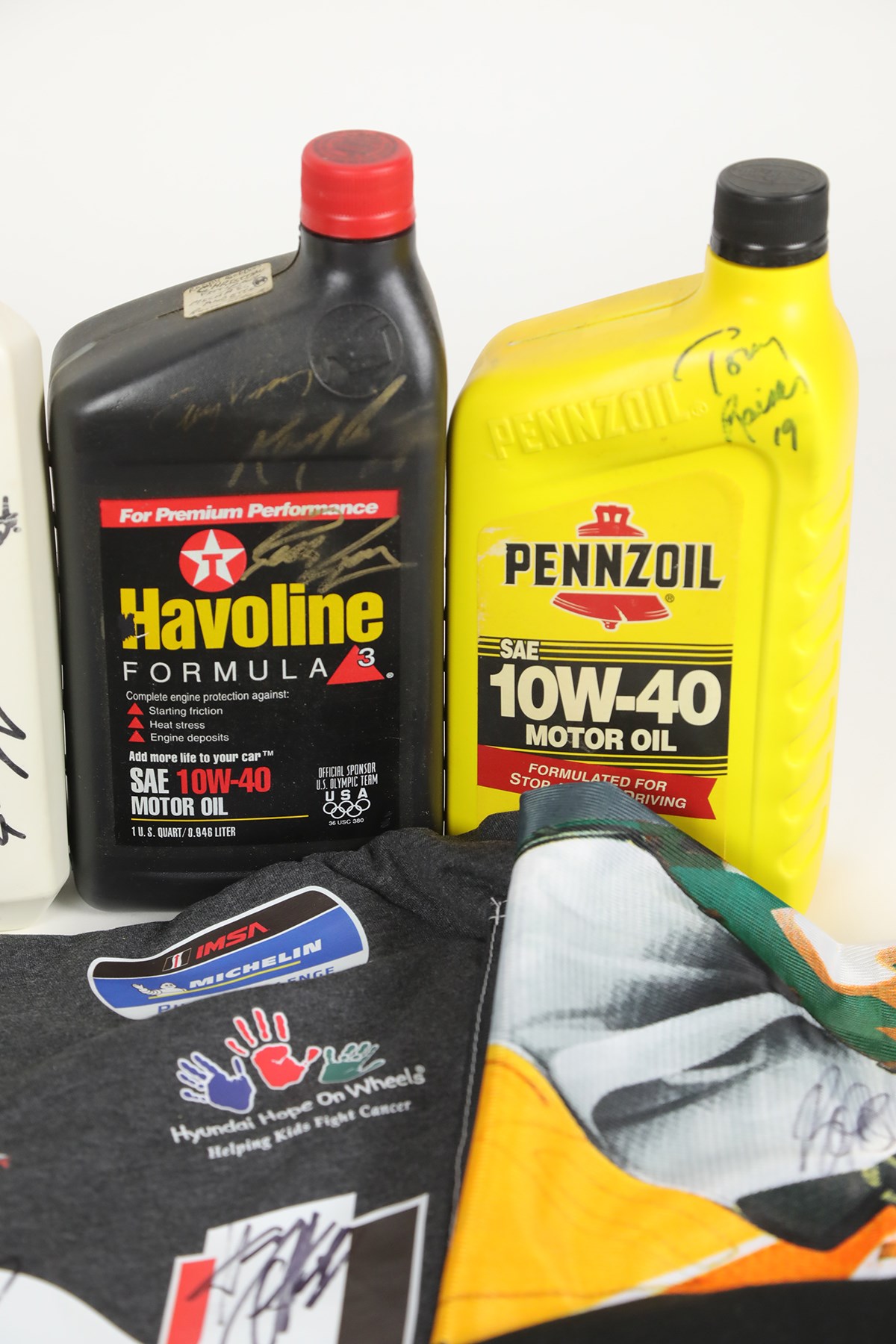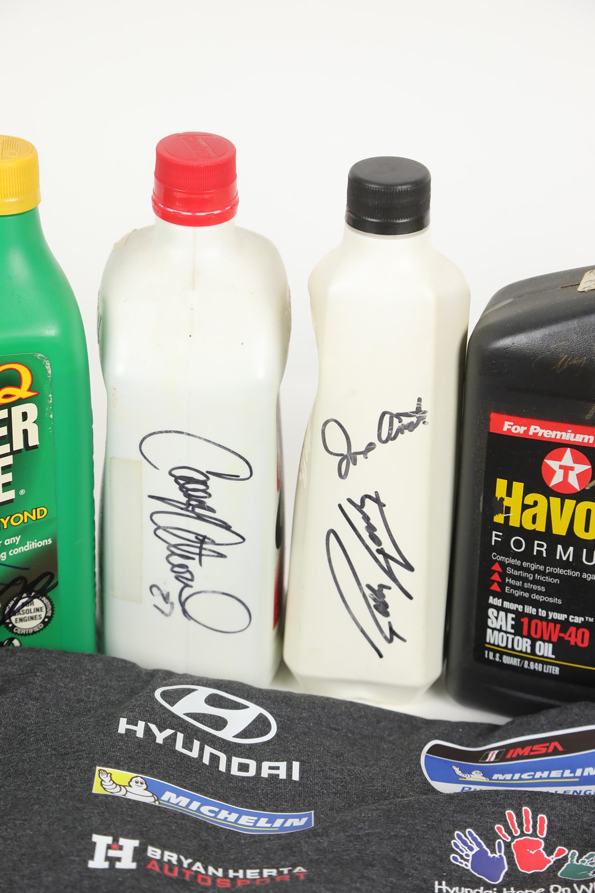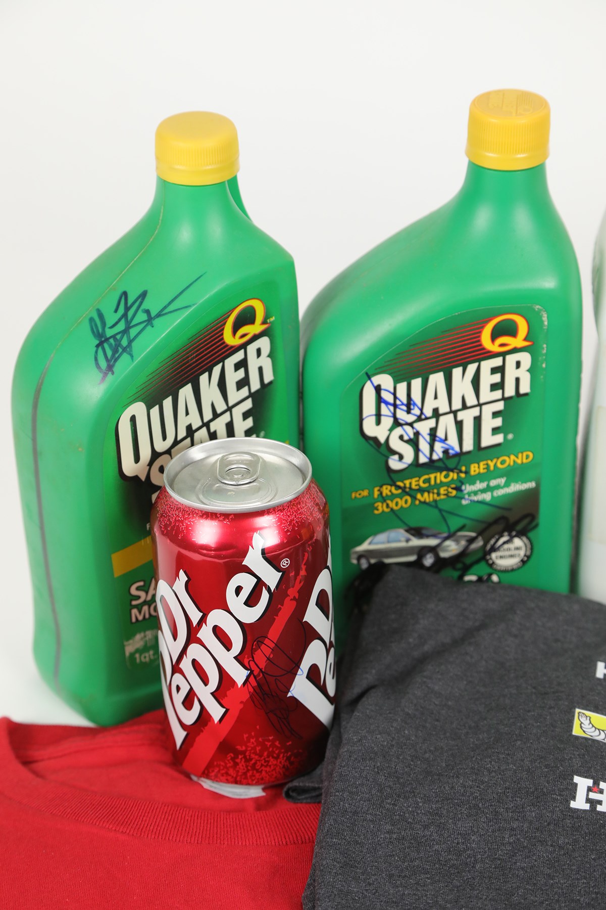 Signed racing collection features oil cans, t-shirts and more! Highlights include John Force; Robby Gordon; Casey Atwood; Bobby Hamilton Jr.; Daniel Suarez; and Zachary Tinkle. In-person signed collection comes with photographs taken by the autograph hound to ensure authenticity.