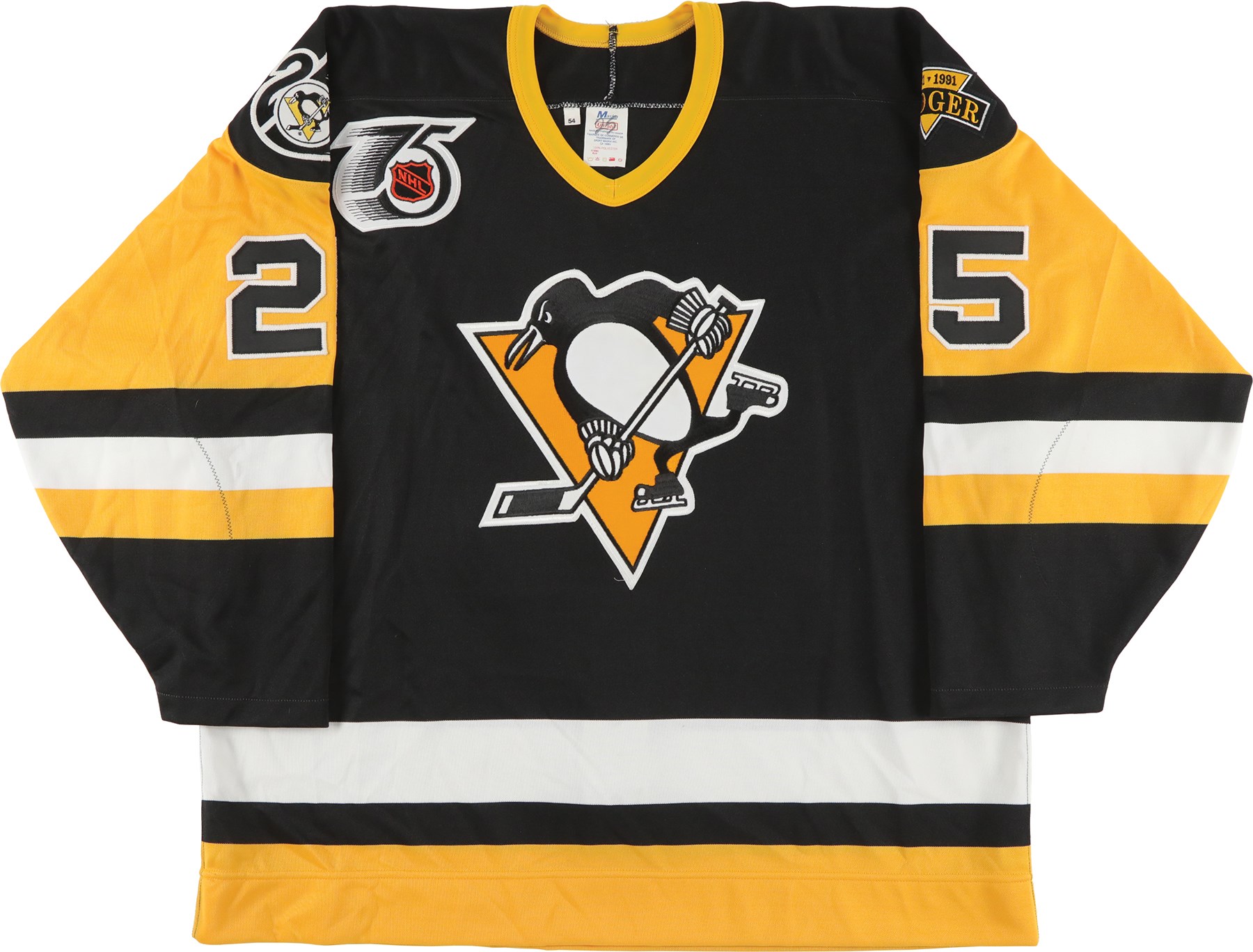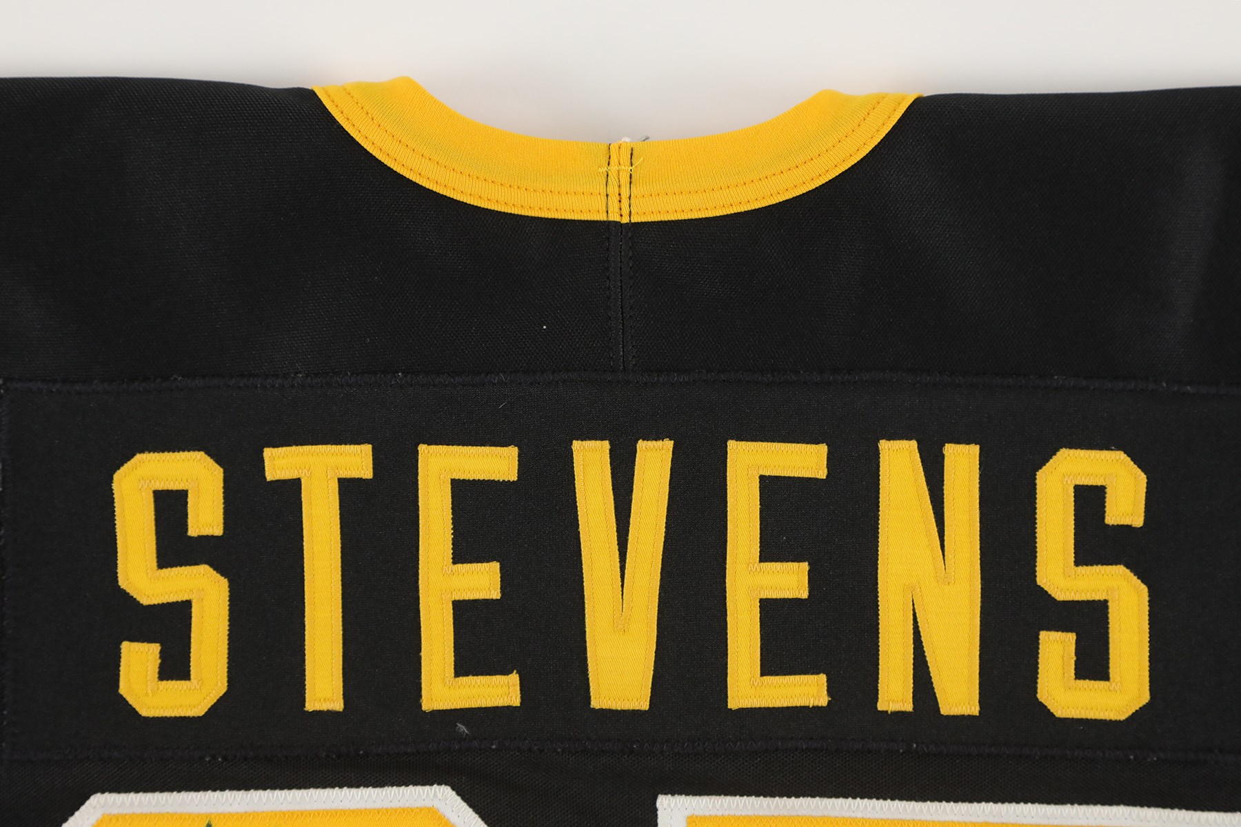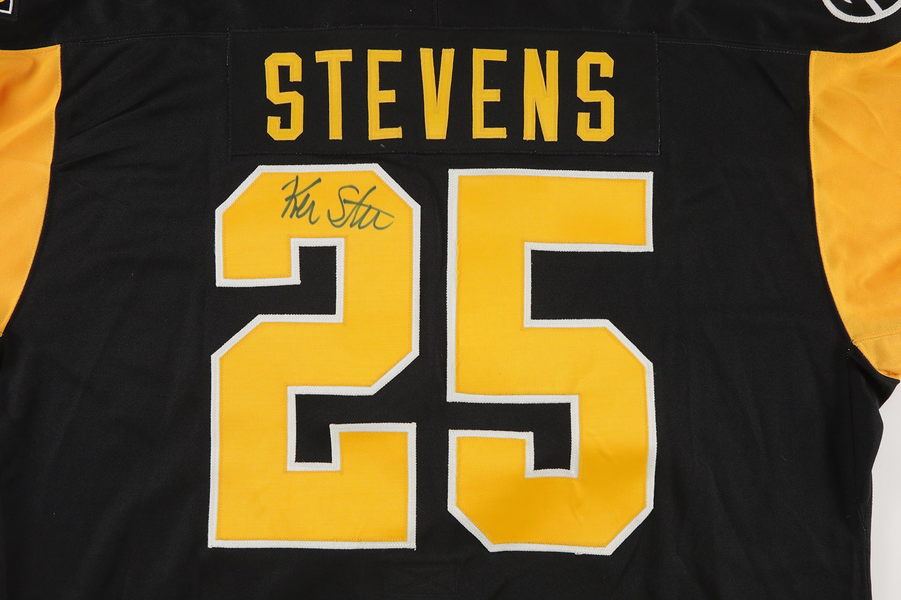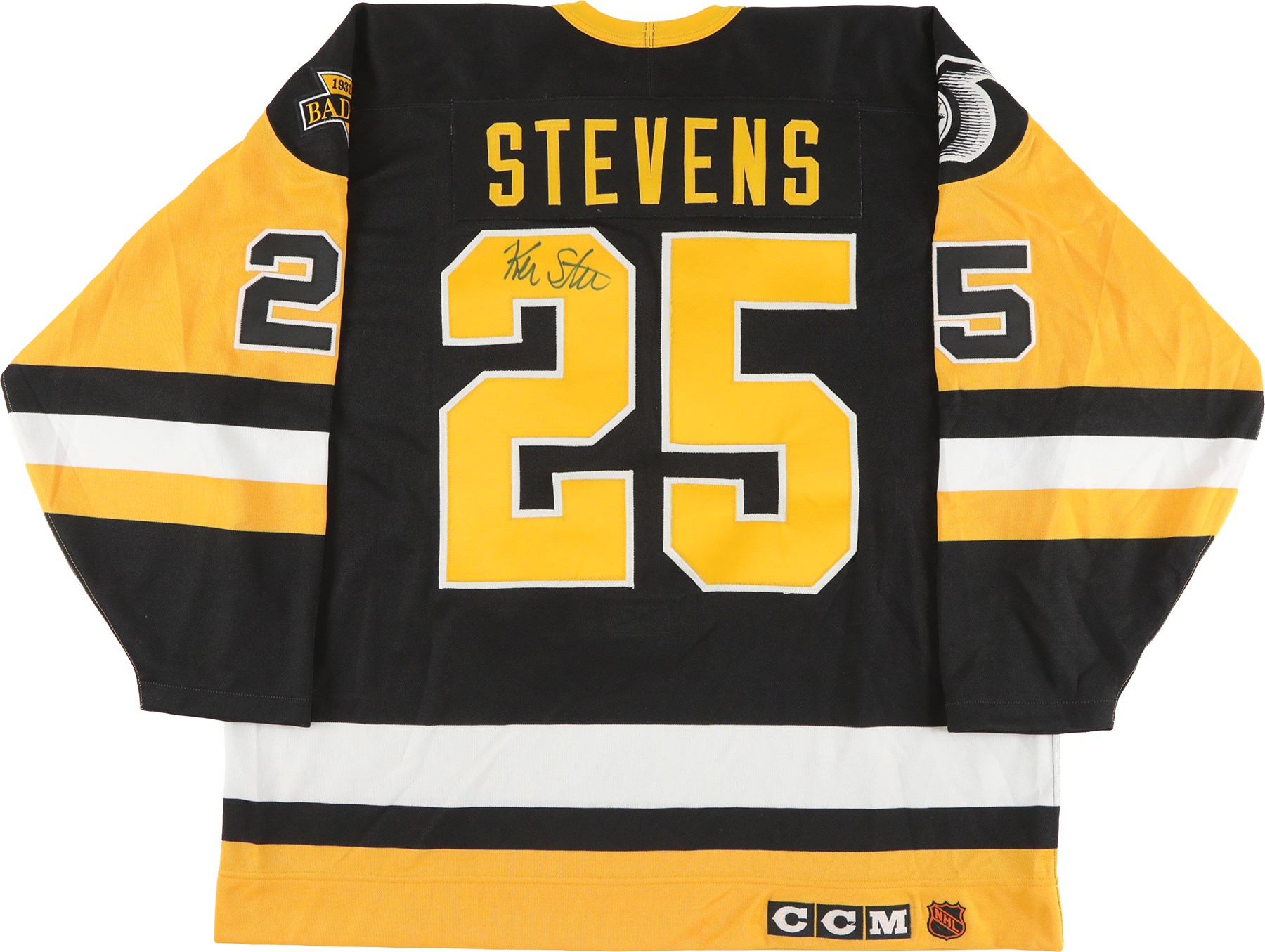 The offered signed, polyester jersey has both a Maska manufacturer's (with his number "25" written in black marker by an unknown hand) and a size "54" tag in the collar. On the chest is the Penguins logo. Both sleeves have "25" in sewn-on black numerals with white trim. The left sleeve has a patch reading, "1931-1991 BADGER." The patch was created to honor Bob Johnson, the head coach of the Stanley Cup winning Penguins in 1990-91 and formerly associated with the University of Wisconsin Badgers. Johnson was also the head coach the next season before he passed away in November of 1991. The right sleeve has an NHL 75th Anniversary patch. Inside is a fight strap. On back is a black sewn-on nameplate with "STEVENS" in sewn-on gold lettering. Below the nameplate is "25" in sewn-on gold numerals with white trim. On the back, outside tail are two tags: A sewn-on "CCM" and a sewn-on "NHL" tag. The jersey does not show signs of wear. Stevens signed his name in blue marker on the "2" numeral section of his "25" on back. The signature actually appears to be a neat but quickly written signature that appears as "Ken Stev" or "Ken Stu." The jersey is in EXCELLENT condition.