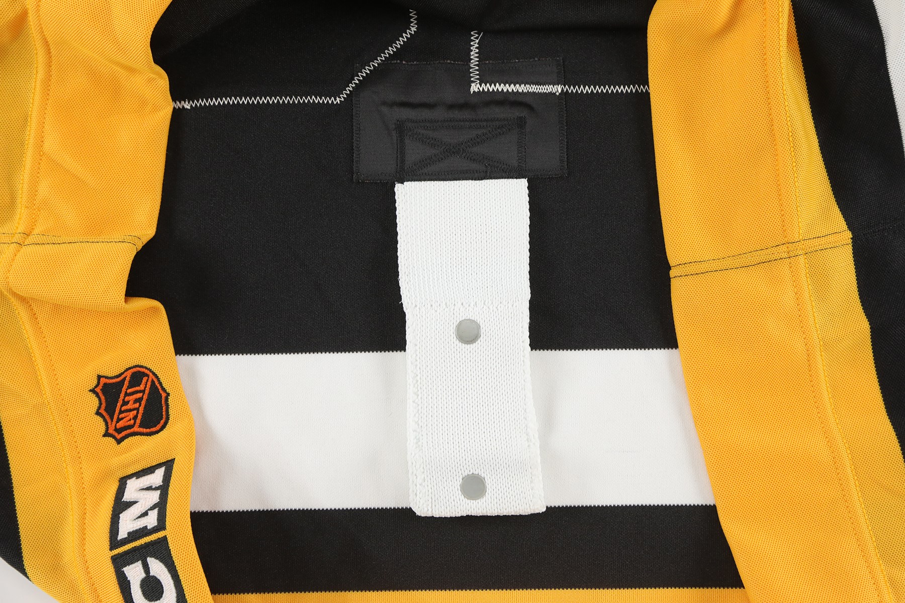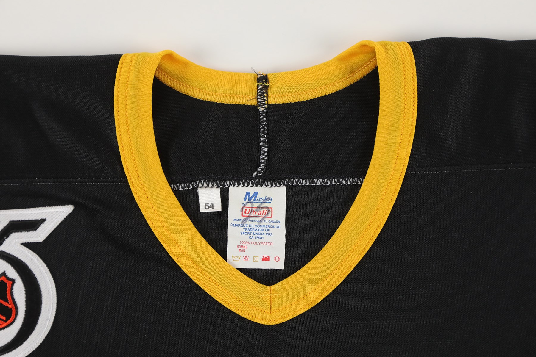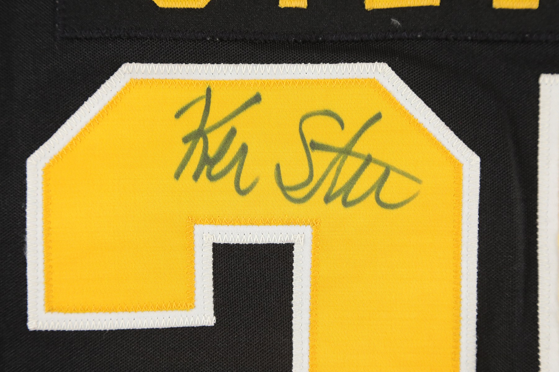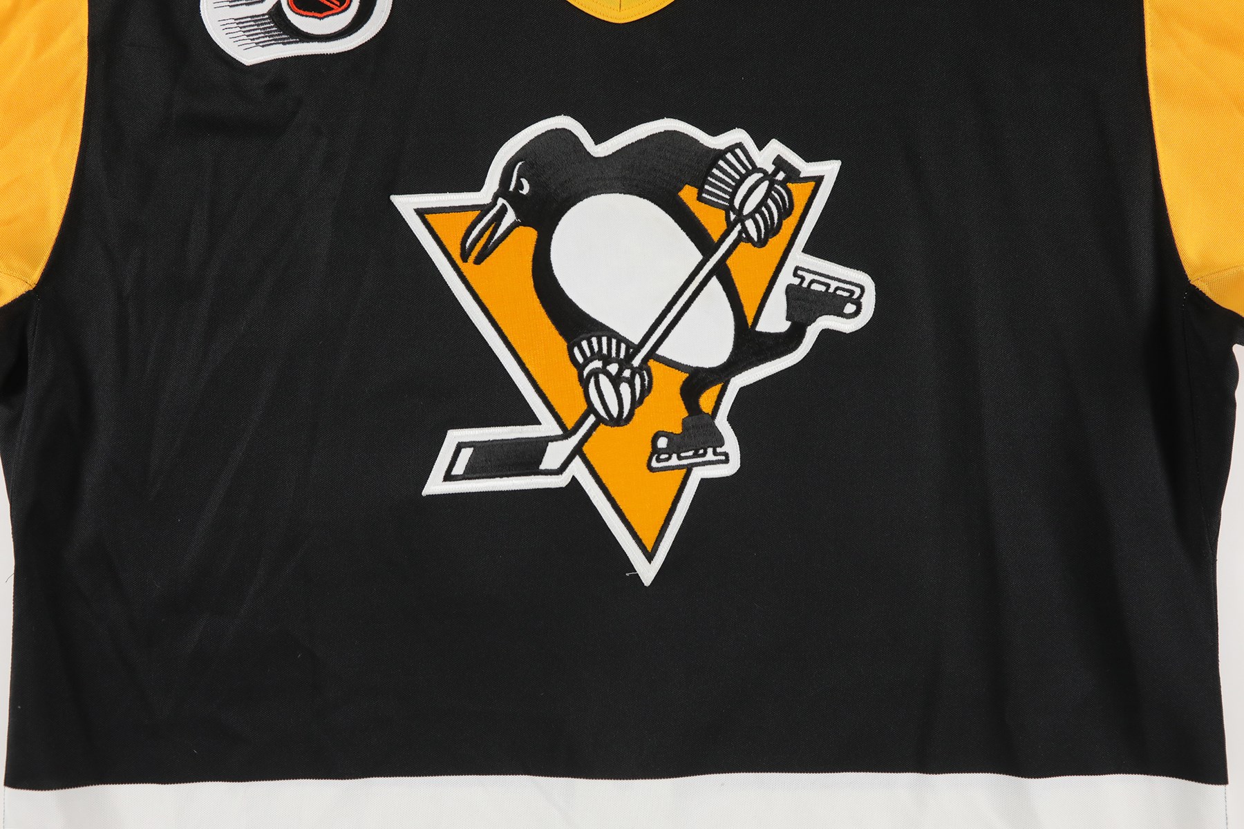 The offered signed, polyester jersey has both a Maska manufacturer's (with his number "25" written in black marker by an unknown hand) and a size "54" tag in the collar. On the chest is the Penguins logo. Both sleeves have "25" in sewn-on black numerals with white trim. The left sleeve has a patch reading, "1931-1991 BADGER." The patch was created to honor Bob Johnson, the head coach of the Stanley Cup winning Penguins in 1990-91 and formerly associated with the University of Wisconsin Badgers. Johnson was also the head coach the next season before he passed away in November of 1991. The right sleeve has an NHL 75th Anniversary patch. Inside is a fight strap. On back is a black sewn-on nameplate with "STEVENS" in sewn-on gold lettering. Below the nameplate is "25" in sewn-on gold numerals with white trim. On the back, outside tail are two tags: A sewn-on "CCM" and a sewn-on "NHL" tag. The jersey does not show signs of wear. Stevens signed his name in blue marker on the "2" numeral section of his "25" on back. The signature actually appears to be a neat but quickly written signature that appears as "Ken Stev" or "Ken Stu." The jersey is in EXCELLENT condition.