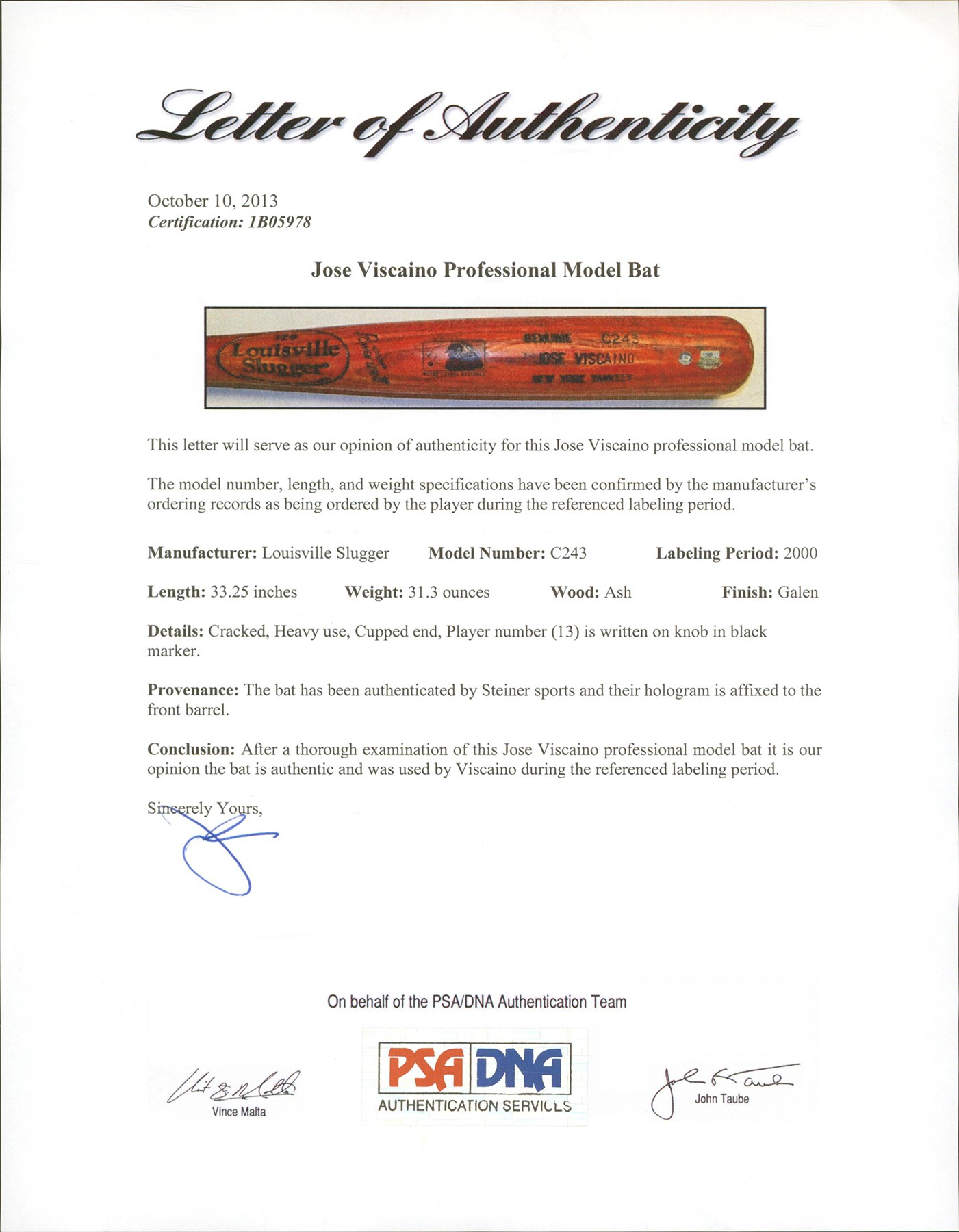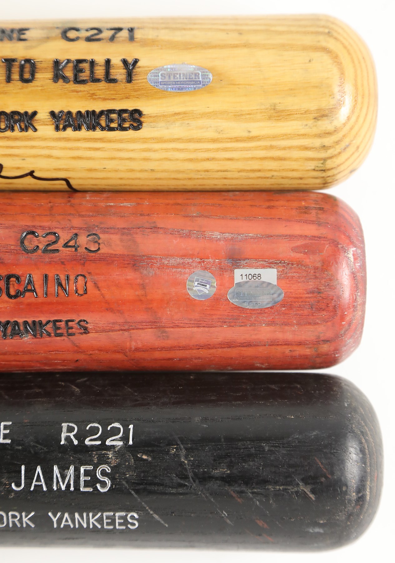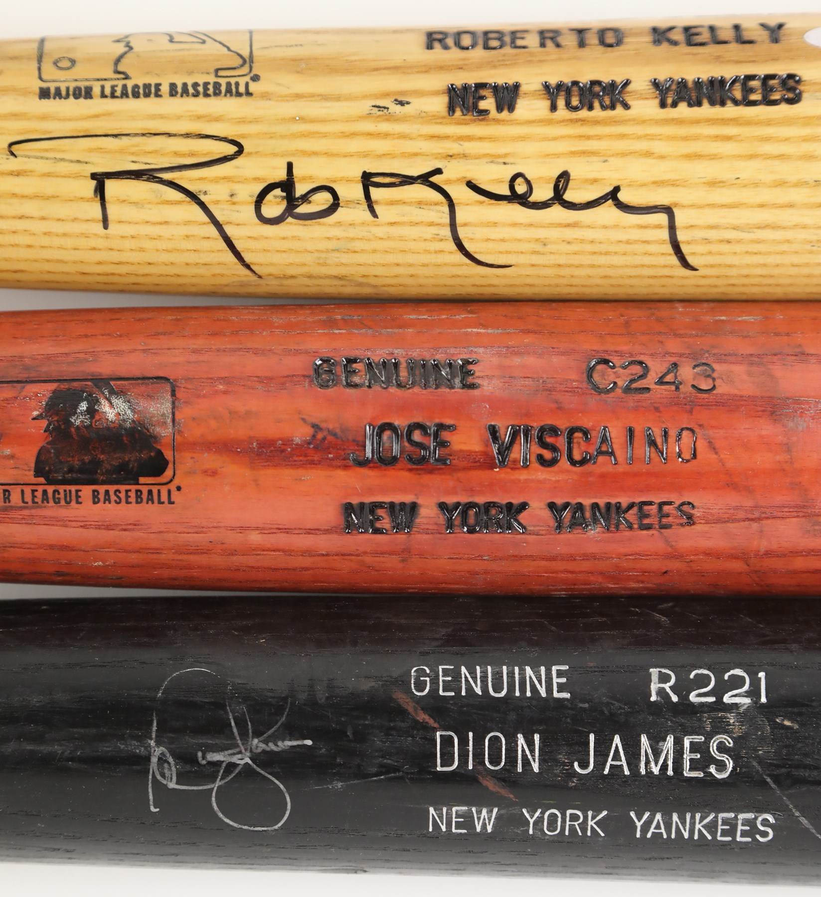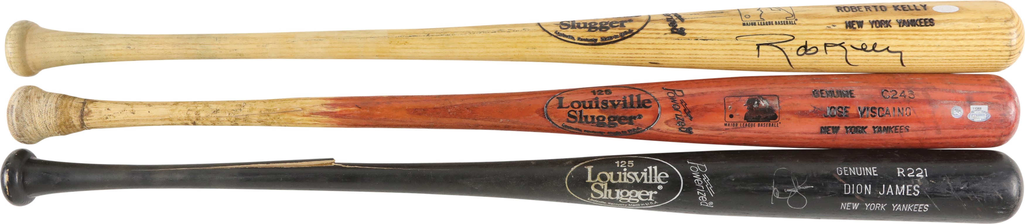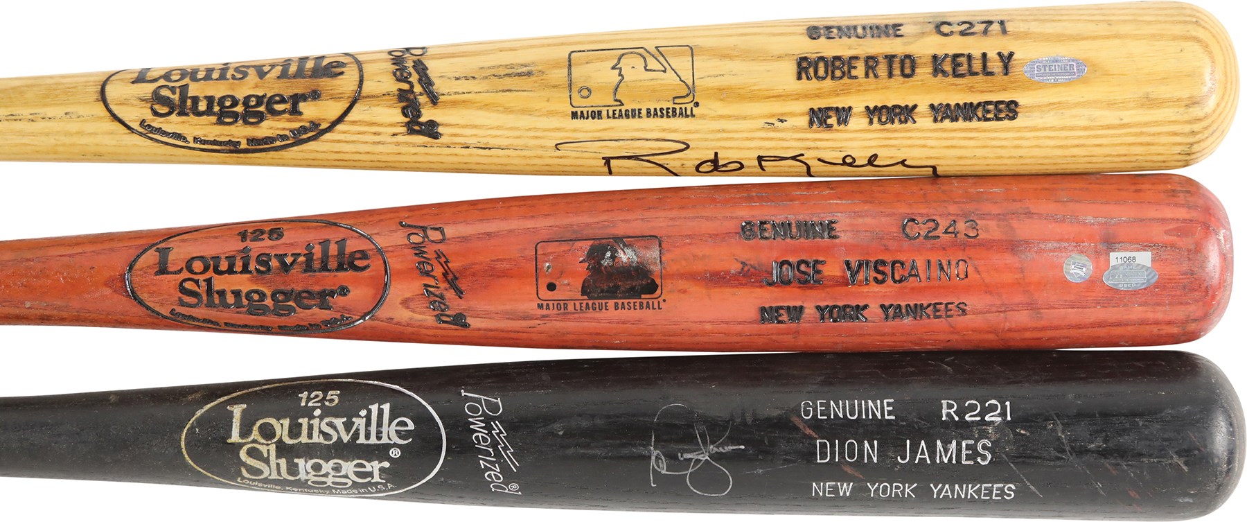 1990s-2000s New York Yankees World Series Champion and stars game used bat lot. Included are bats used and signed by Jose Vizcaino, Roberto Kelly, and Dion James. The bat used by Vizcaino is a 33.25" Louisville Slugger model C243 from the Yankees World Champion 2000 season. The bat is cracked and shows excellent signs of use. "13" is written on the knob of the bat in black ink. The bat used by Kelly is a 34" Louisville Slugger C271 model. It has been signed by Kelly with a black Sharpie marker, and Kelly's number 19 is written on the knob of the bat in black ink. The James bat is a 34" Louisville Slugger R221 model. The bat shows heavy signs of use and the handle is cracked. James signed the bat with silver ink. The Vizcaino and Kelly bats have Steiner hologram stickers on them. The Vizcaino bat includes a full PSA LOA.