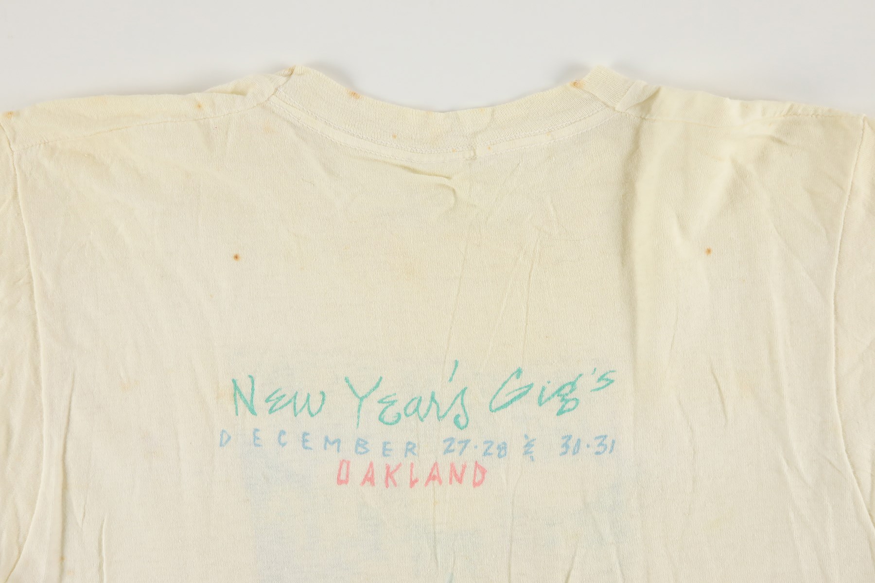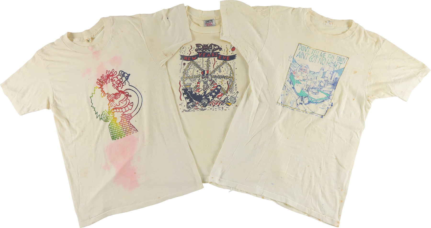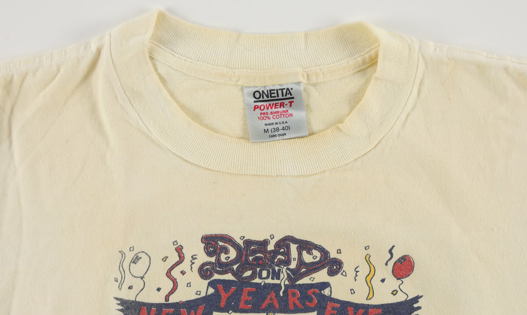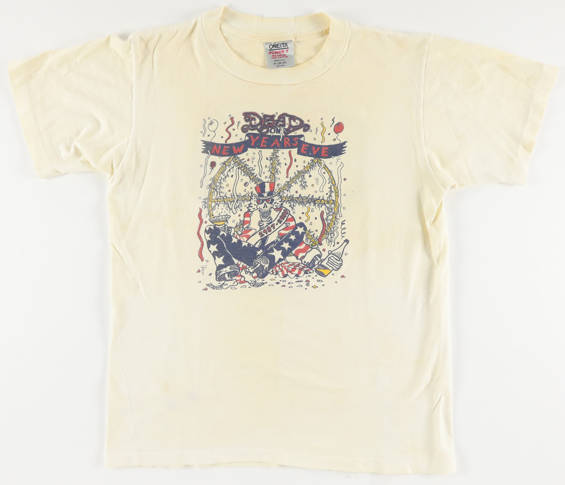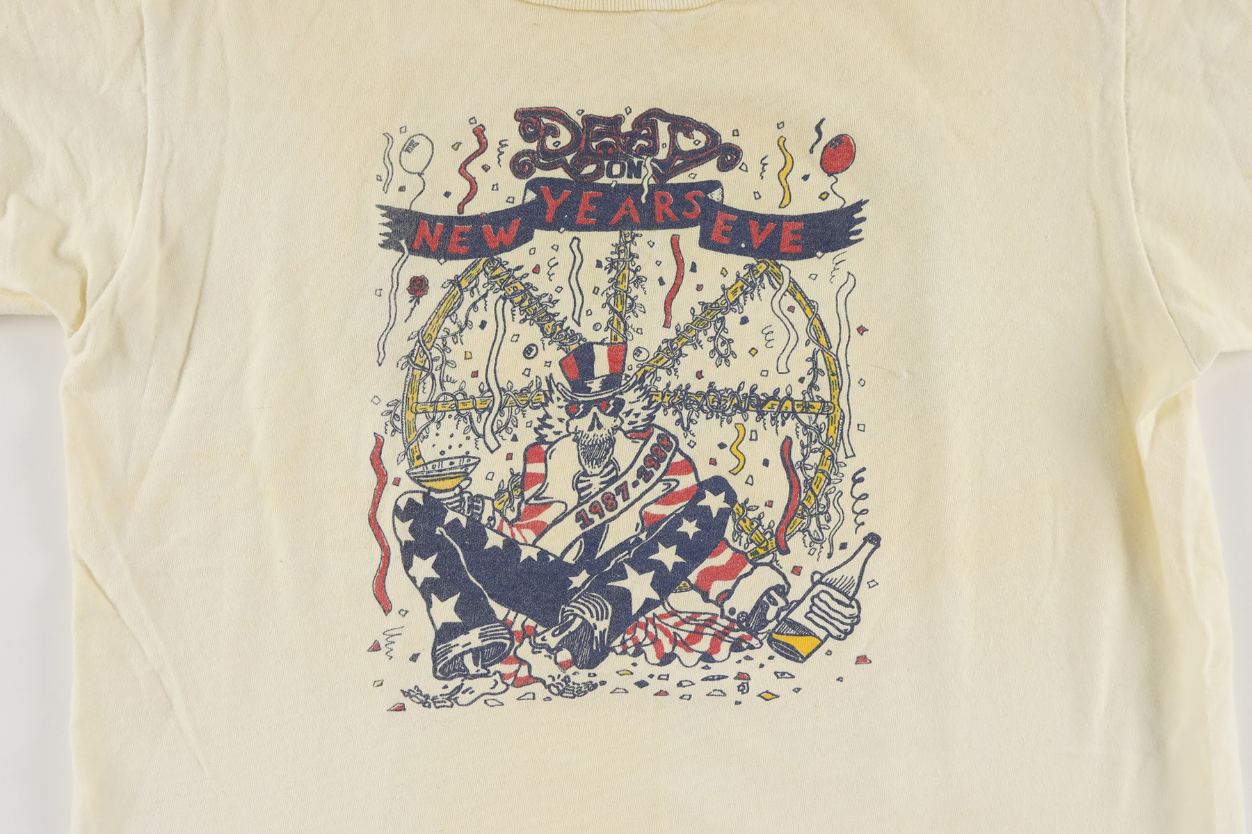 1) 1980s Grateful Dead New Year's Gigs in Oakland shirt featuring Jerry Garcia, Ice Cream kid, Dancing Bear - size L (42-44). Staining throughout on back and front. 2) 1970s Grateful Dead ice cream kid logo shirt - size L (42-44). Color bleeding on front with some staining on front and back. 3) 1988 Dead on New Years Eve shirt - size M (38-40). Minor toning with two stains on back bottom right.
