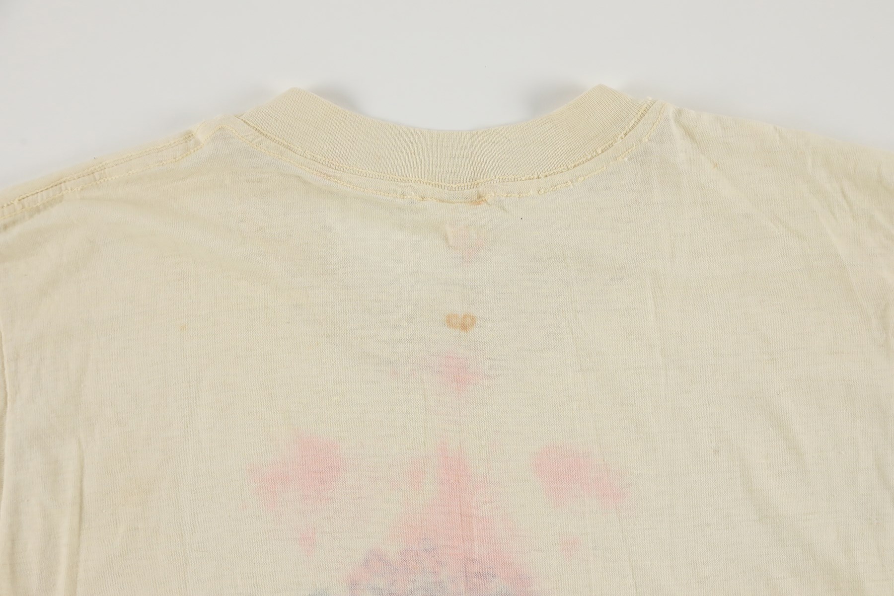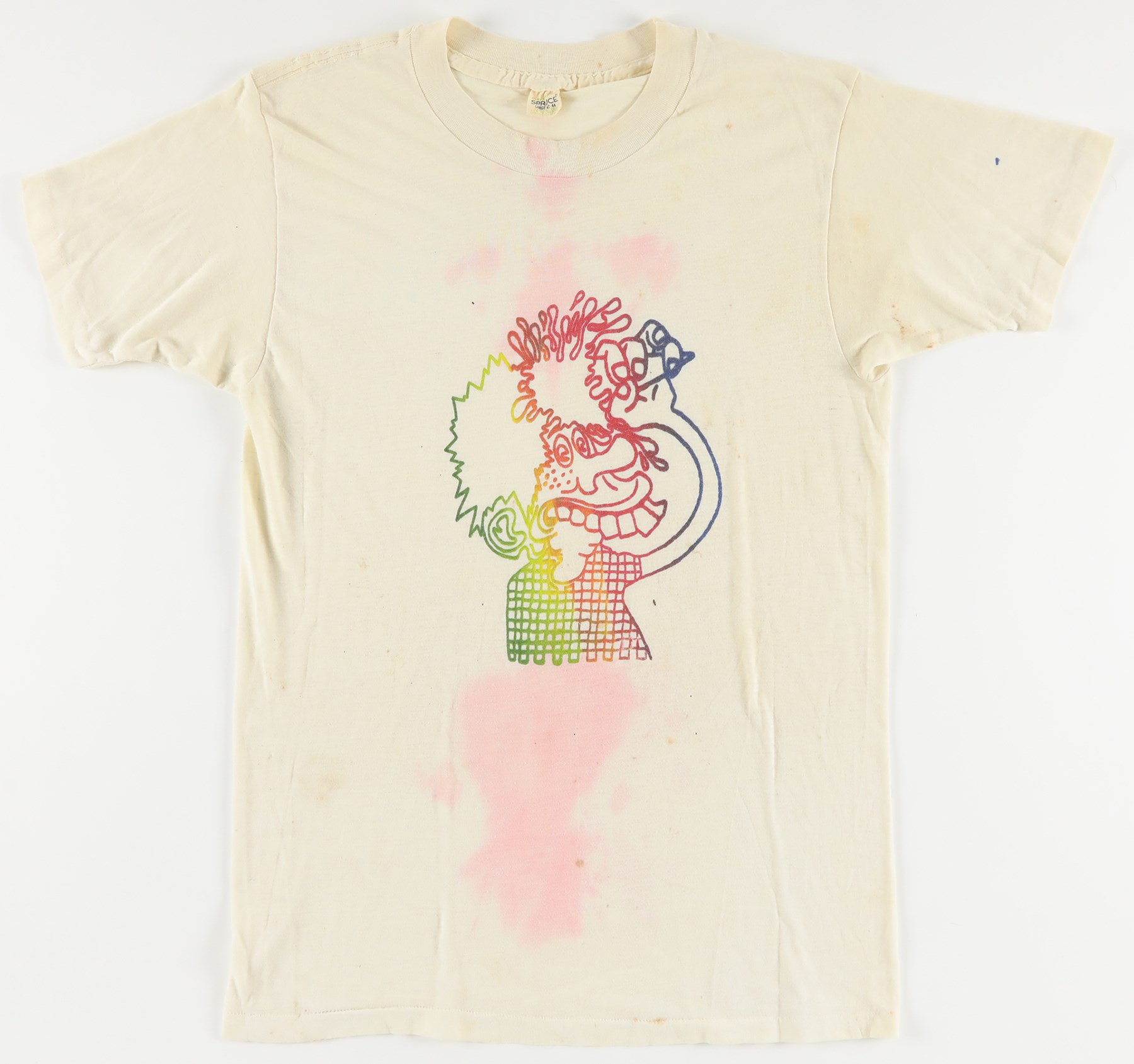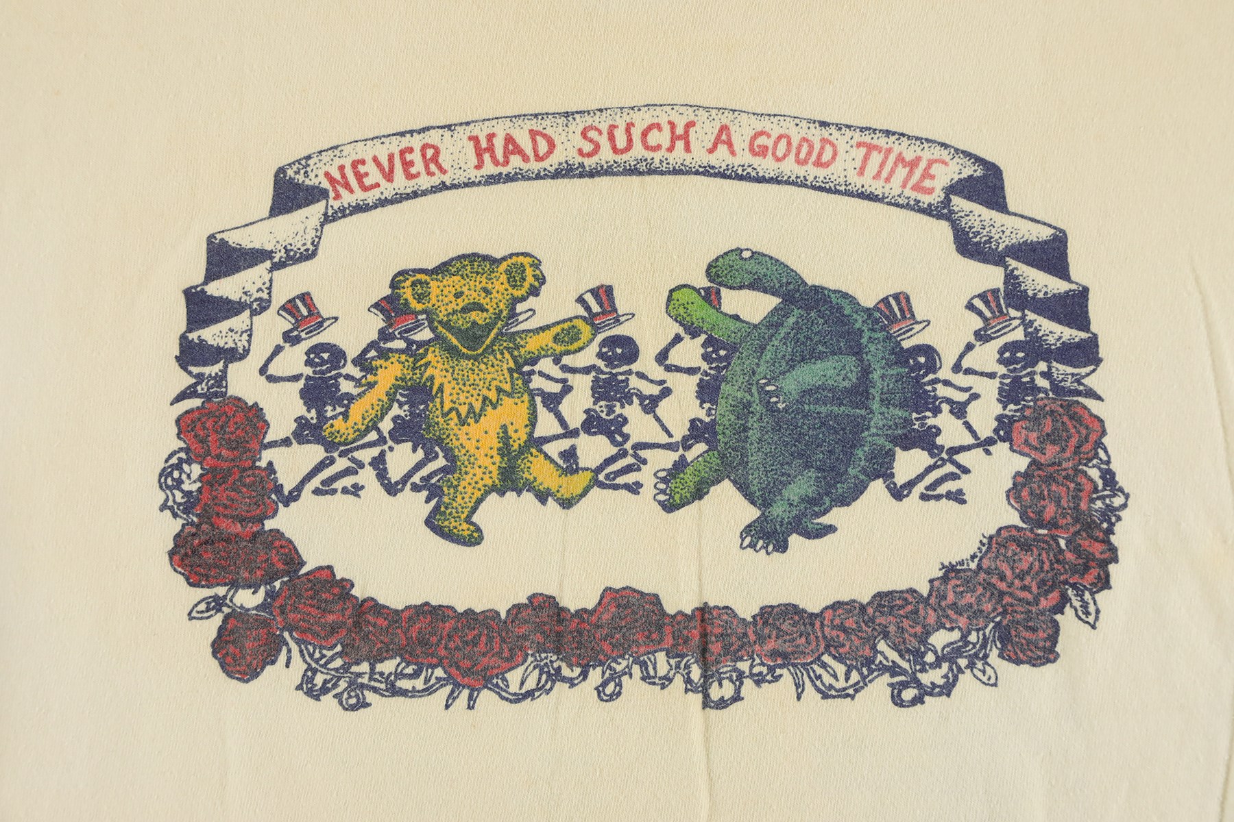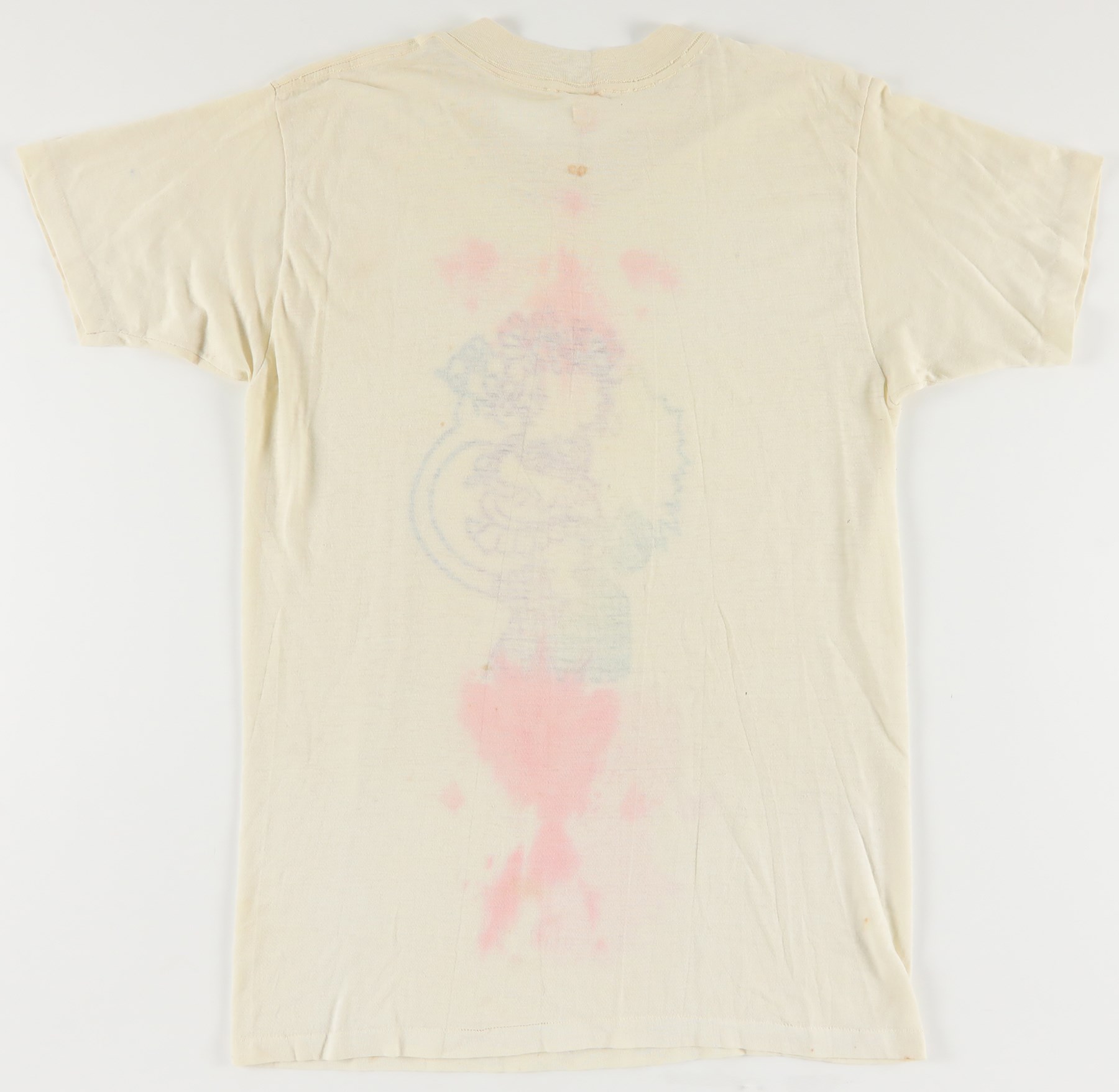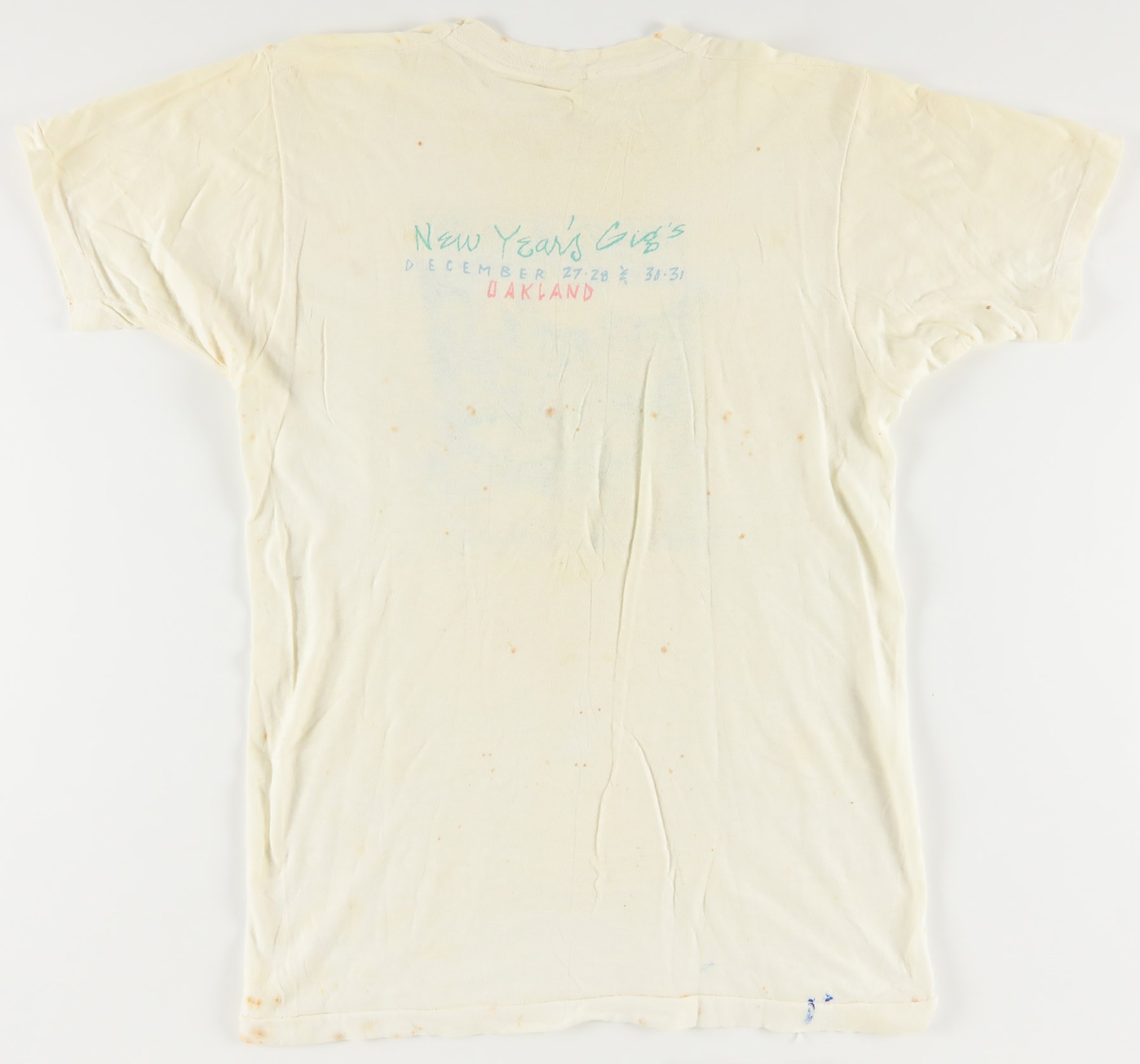 1) 1980s Grateful Dead New Year's Gigs in Oakland shirt featuring Jerry Garcia, Ice Cream kid, Dancing Bear - size L (42-44). Staining throughout on back and front. 2) 1970s Grateful Dead ice cream kid logo shirt - size L (42-44). Color bleeding on front with some staining on front and back. 3) 1988 Dead on New Years Eve shirt - size M (38-40). Minor toning with two stains on back bottom right.