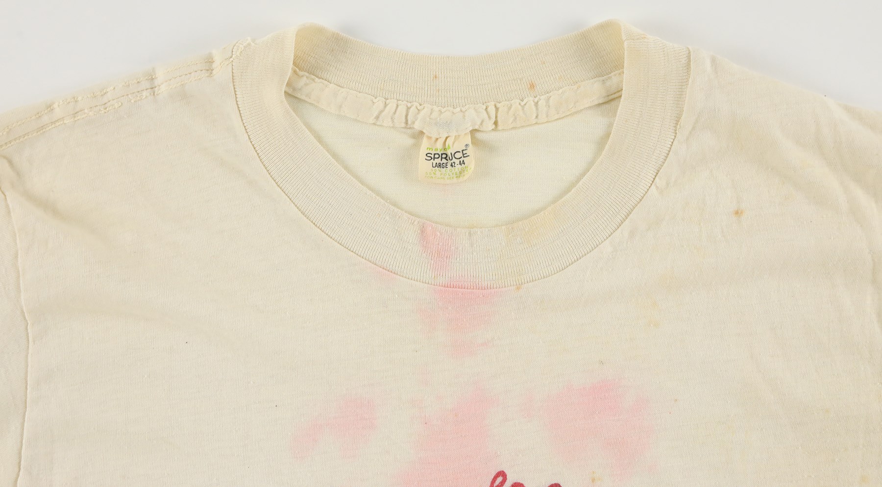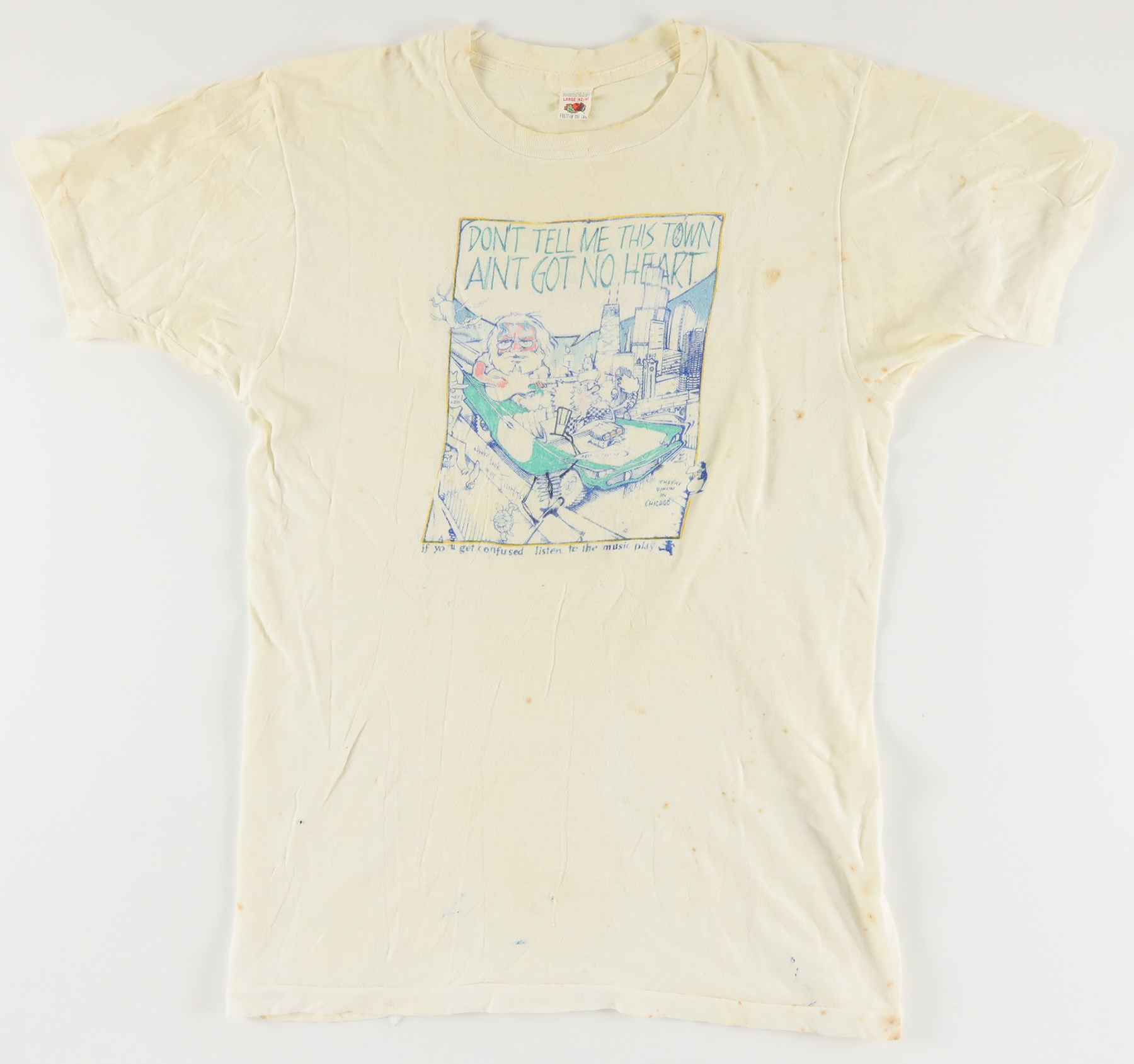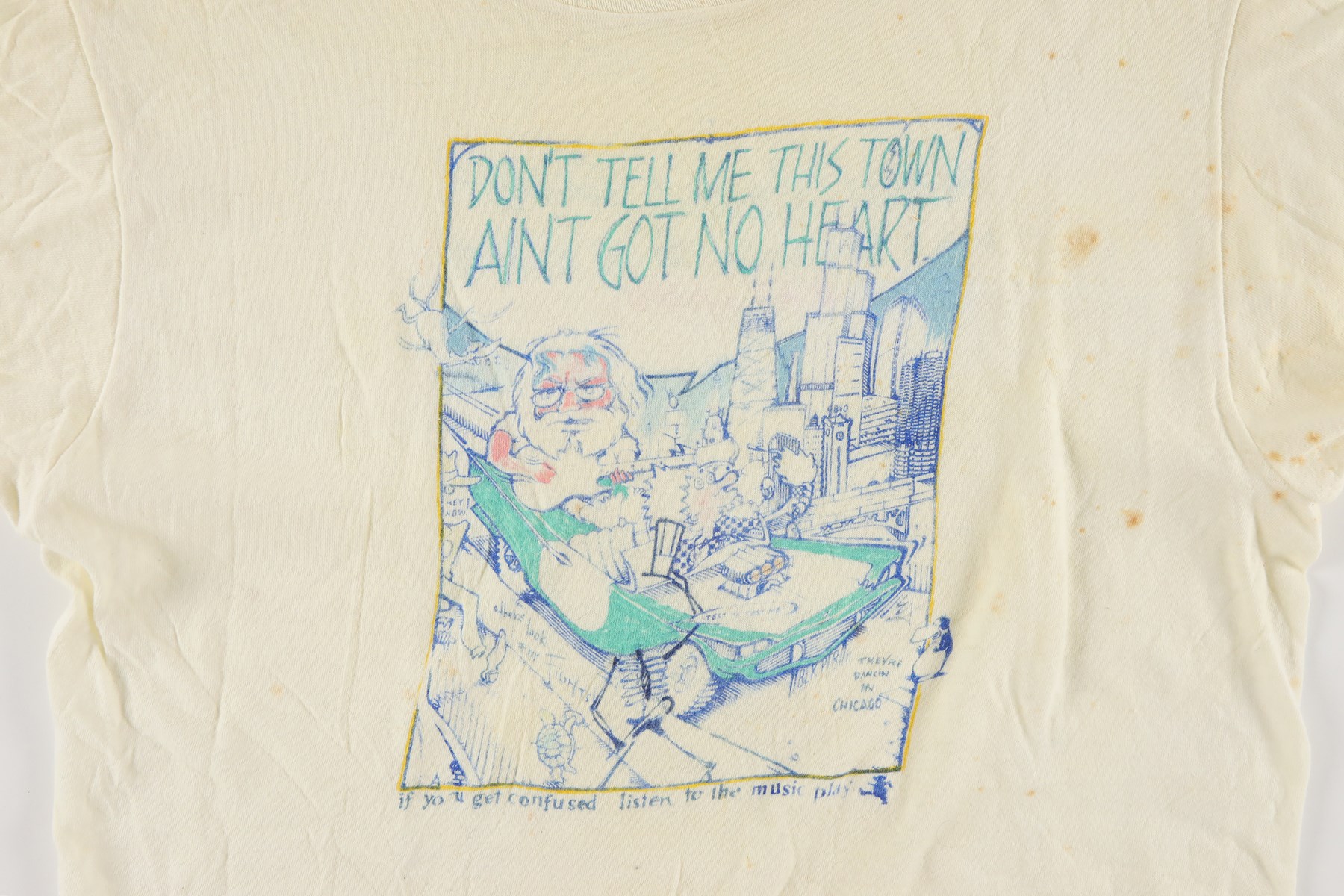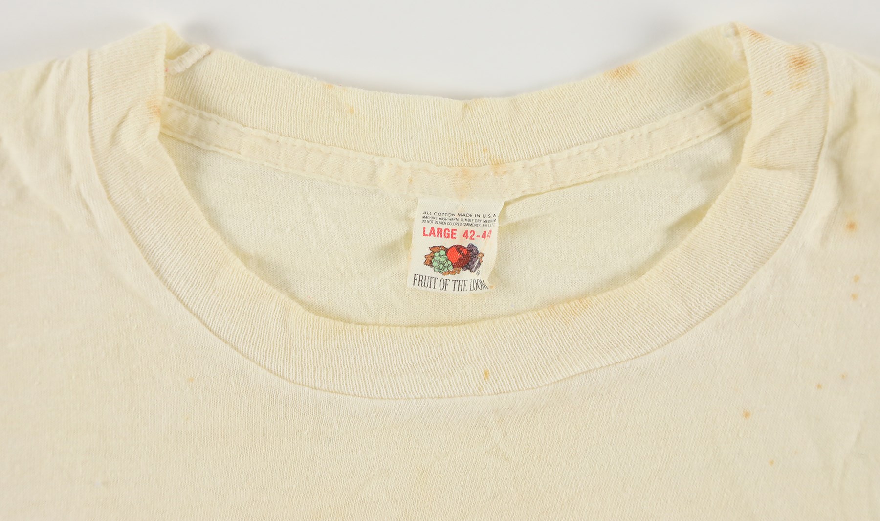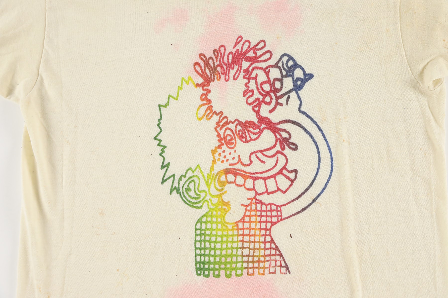 1) 1980s Grateful Dead New Year's Gigs in Oakland shirt featuring Jerry Garcia, Ice Cream kid, Dancing Bear - size L (42-44). Staining throughout on back and front. 2) 1970s Grateful Dead ice cream kid logo shirt - size L (42-44). Color bleeding on front with some staining on front and back. 3) 1988 Dead on New Years Eve shirt - size M (38-40). Minor toning with two stains on back bottom right.