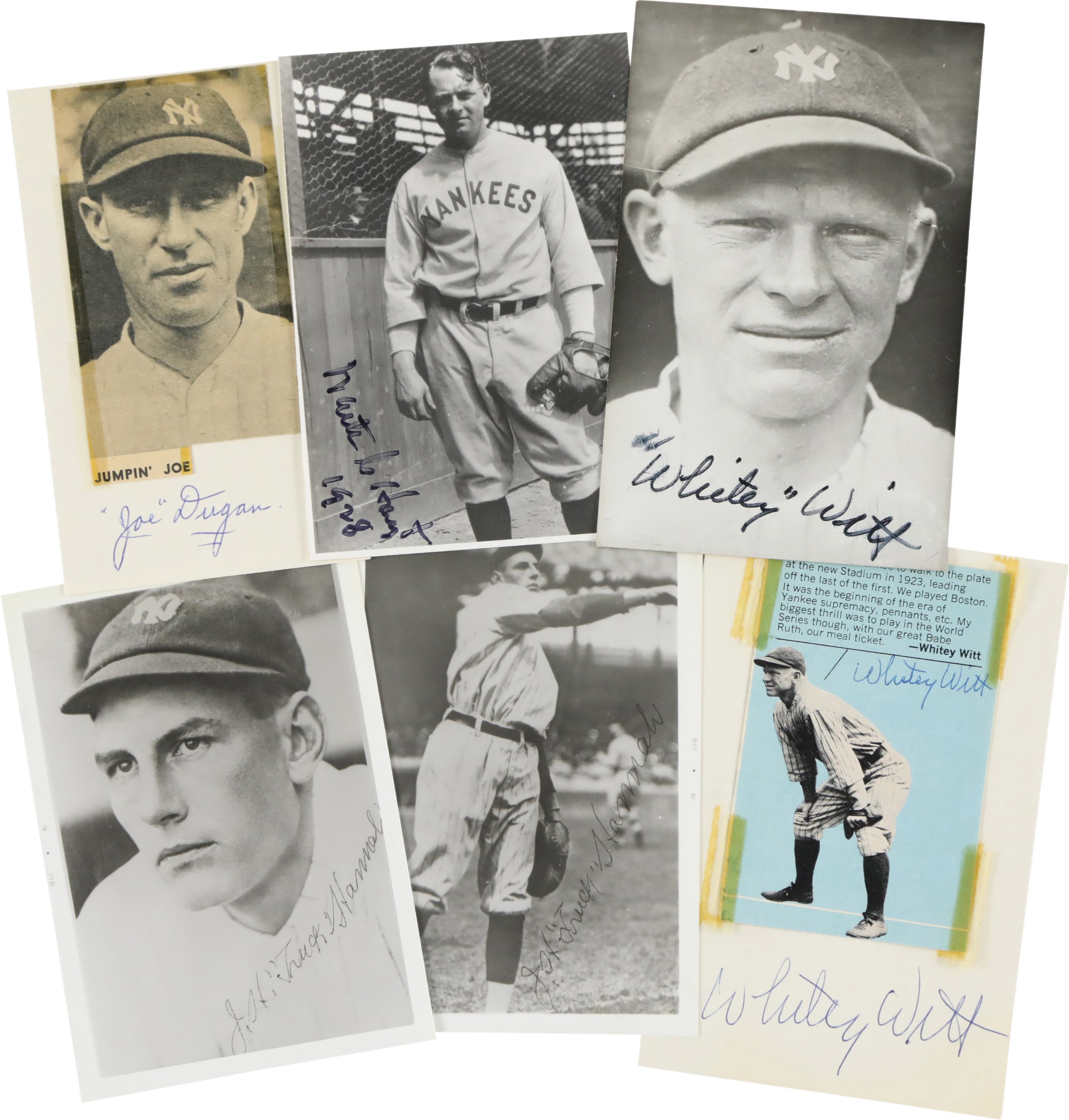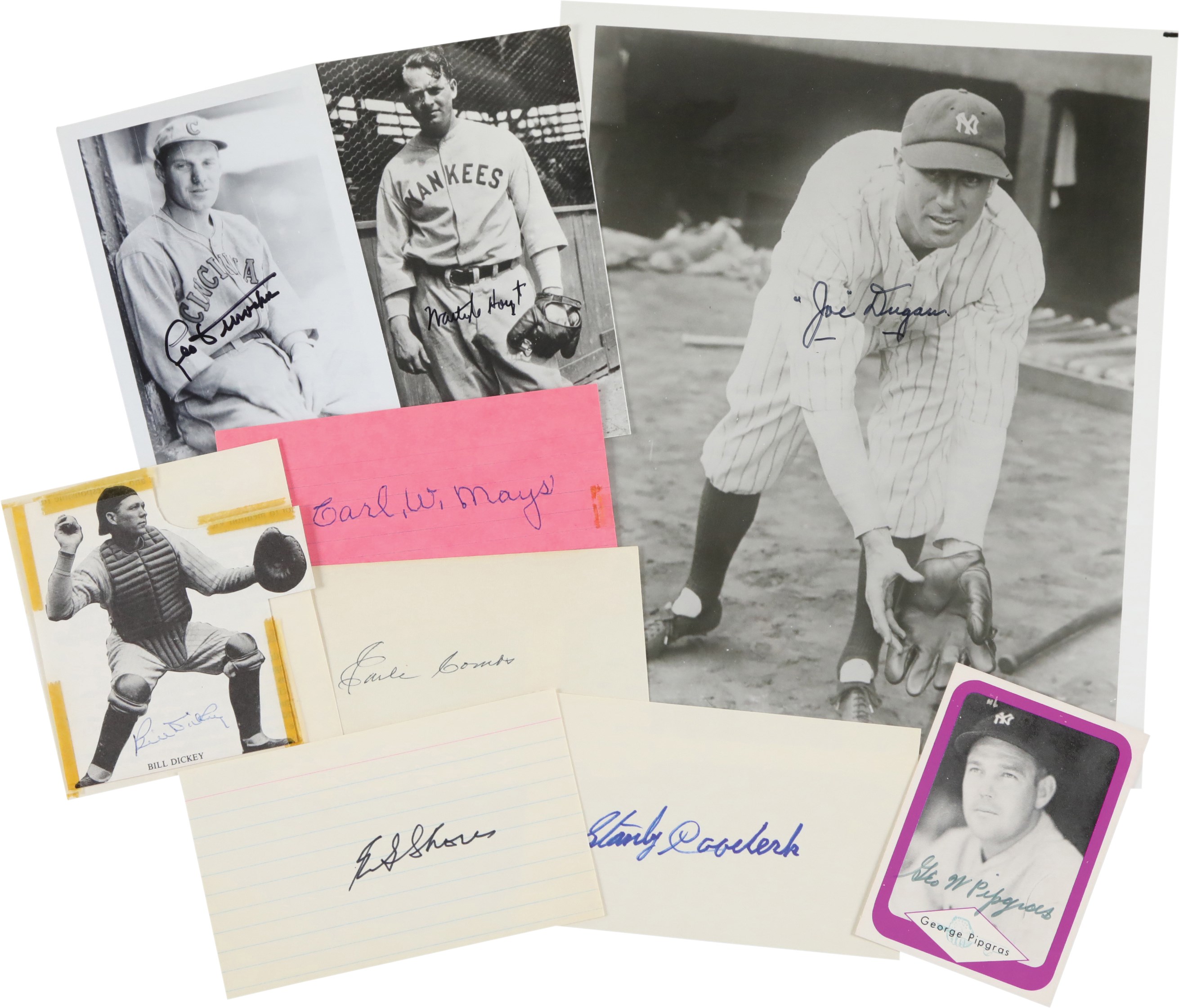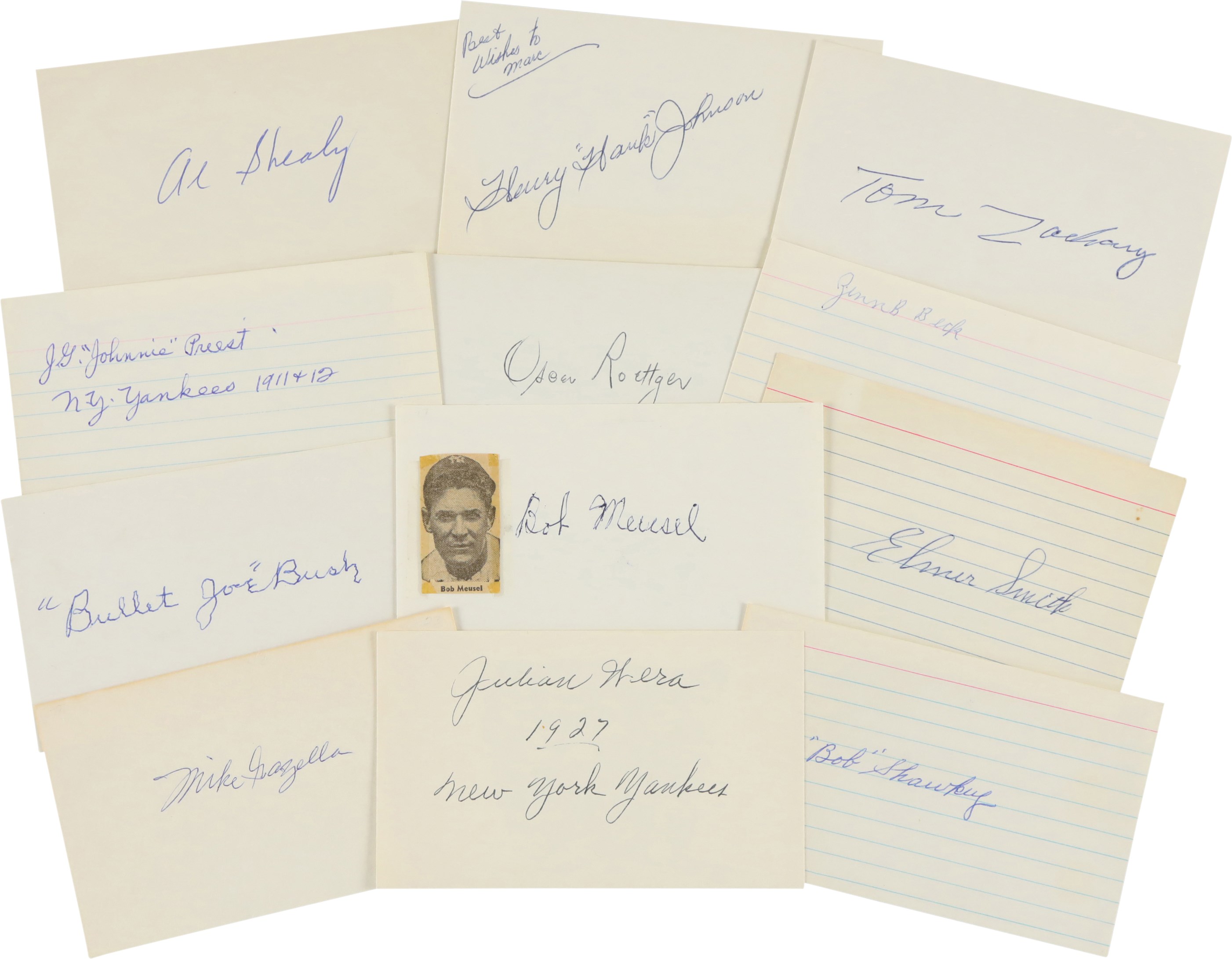 Large collection of fifty-seven various items signed by one or more individuals who played with the New York Yankees primarily during the 1920s. Many members of the 1927 New York Yankees are represented here, as well as several players who played with the Yankees during the 1910s. Also featured are a number of signatures belonging to players who played very briefly with the Yankees, but who accomplished memorable feats with other clubs, such as Ernie Shore and Elmer Smith. This is our consignor's childhood collection, with all the signatures having been obtained by him either in person at signing shows during the 1970s/early 1980s or by correspondence with the player. As such, several of the pieces are personalized "To Marc" or a family member. The signatures, scripted in a variety of inks, average 8/10. Excellent condition overall. Because some of the signatures were obtained by mail, one most allow for the possibility of a few secretarial examples in the collection.