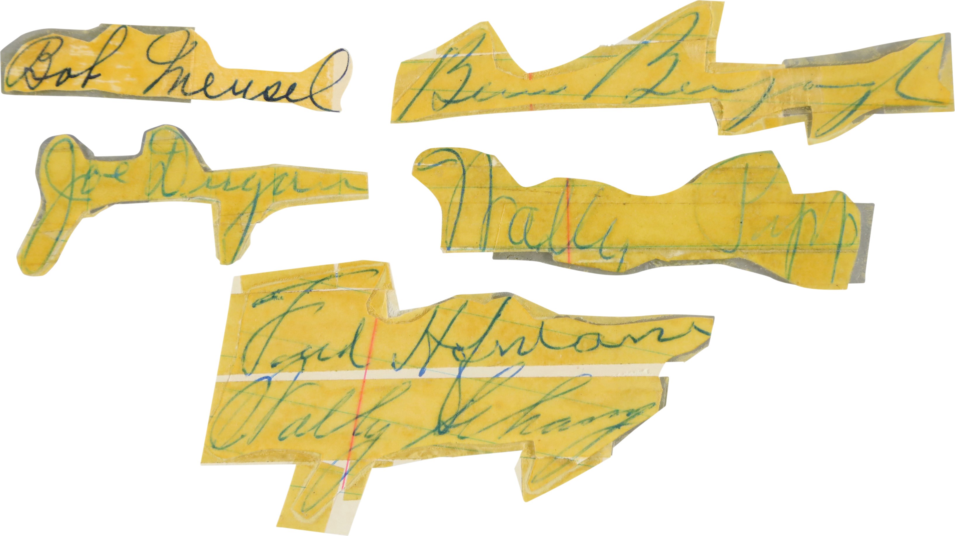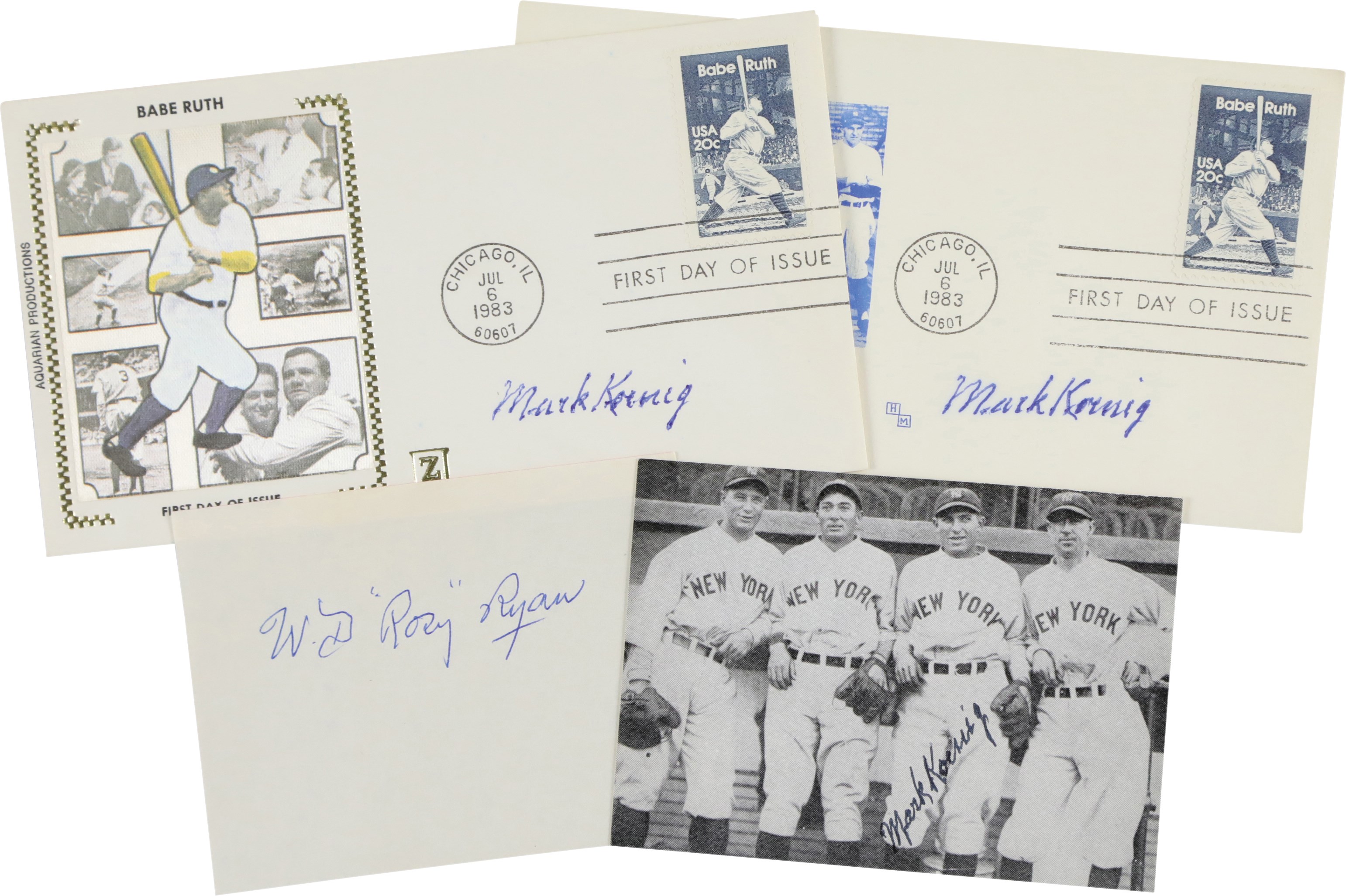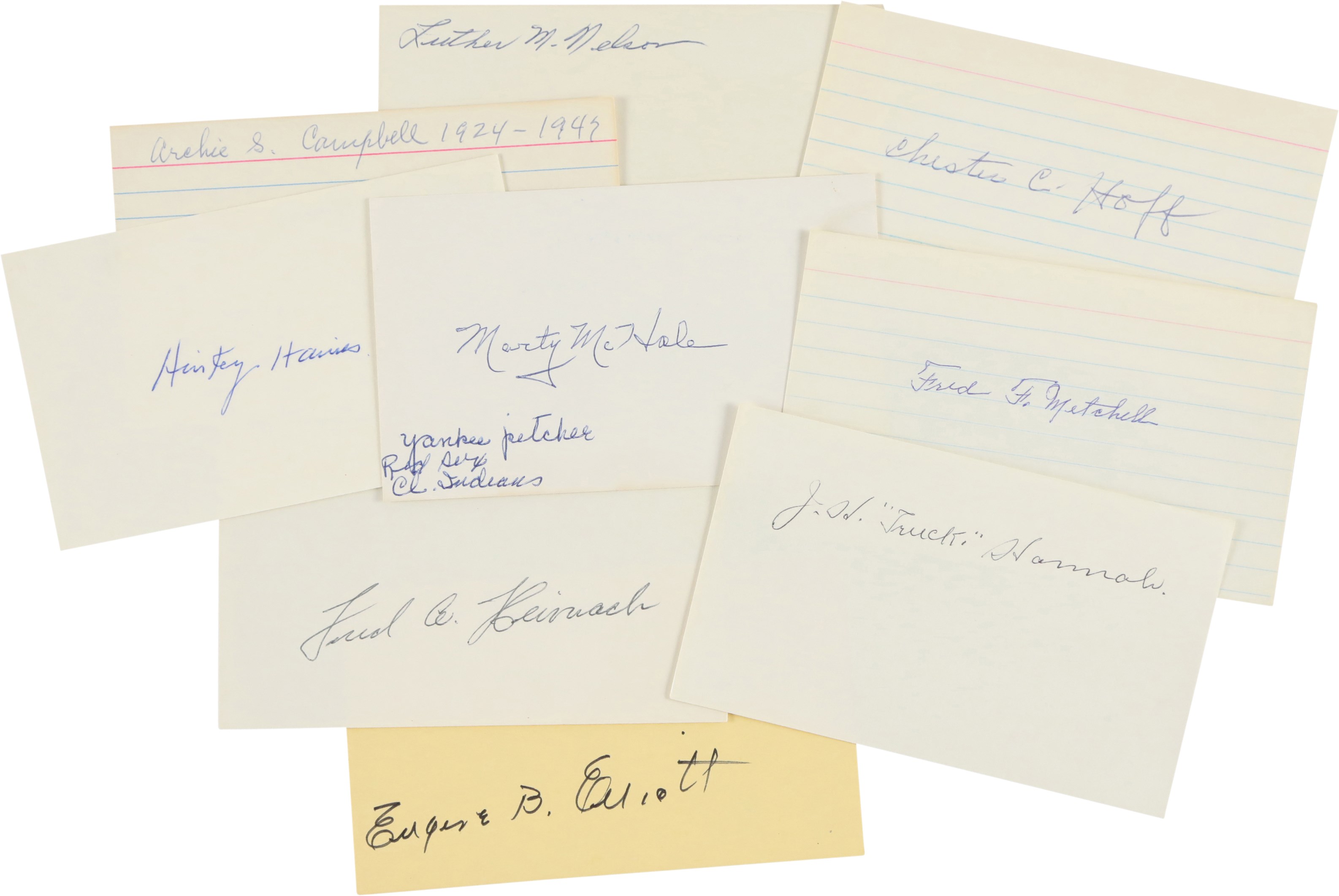 Large collection of fifty-seven various items signed by one or more individuals who played with the New York Yankees primarily during the 1920s. Many members of the 1927 New York Yankees are represented here, as well as several players who played with the Yankees during the 1910s. Also featured are a number of signatures belonging to players who played very briefly with the Yankees, but who accomplished memorable feats with other clubs, such as Ernie Shore and Elmer Smith. This is our consignor's childhood collection, with all the signatures having been obtained by him either in person at signing shows during the 1970s/early 1980s or by correspondence with the player. As such, several of the pieces are personalized "To Marc" or a family member. The signatures, scripted in a variety of inks, average 8/10. Excellent condition overall. Because some of the signatures were obtained by mail, one most allow for the possibility of a few secretarial examples in the collection.