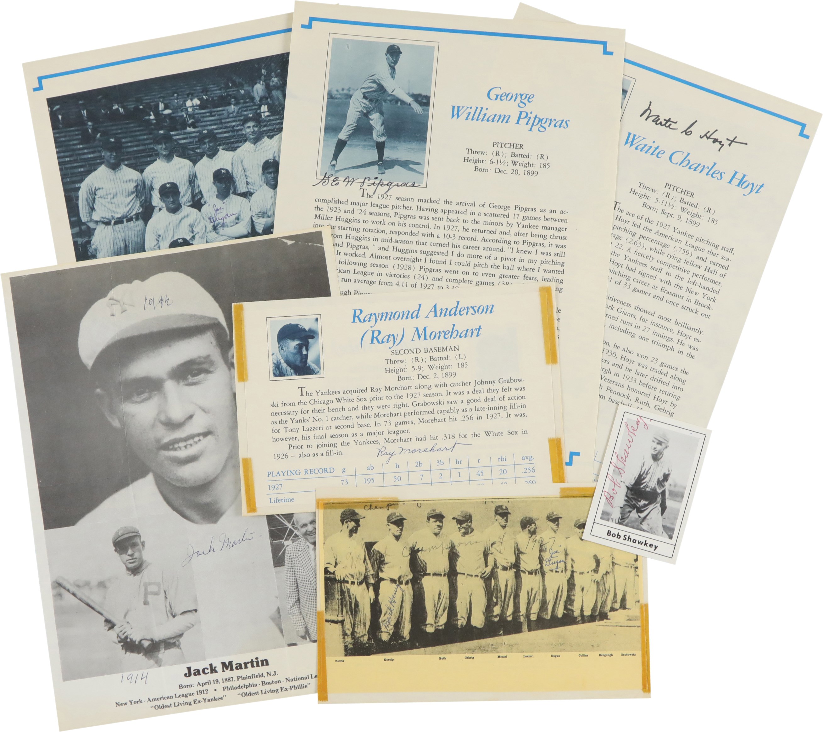 Magazine Pages (6): Joe Dugan (both sides of a single page), Waite Hoyt (both sides of a single page), George Pipgras, Jack Martin, Ray Morehart (trimmed) and Joe Dugan/Mark Koenig (together on a trimmed page)