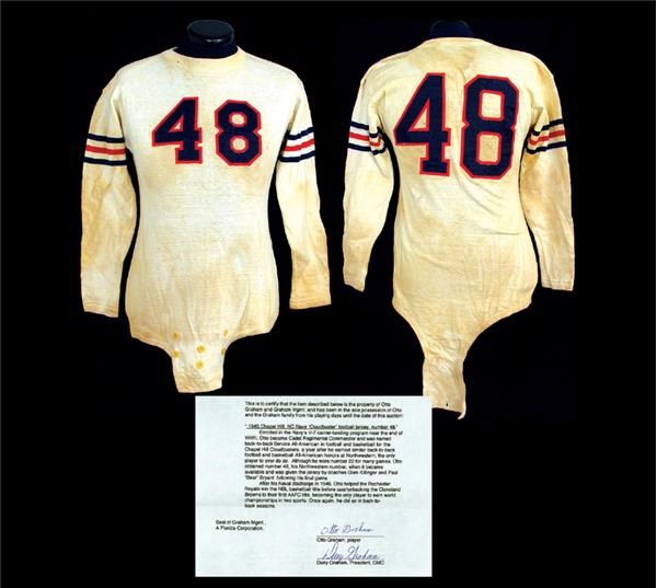 Leaving a mark the size of Cleveland, Ohio, Otto Graham became the first star on the Cleveland Browns and its first Hall of Fame inductee in 1965. But stardom for Graham started in college, playing football and basketball on a scholarship to Northwestern. He earned All-American honors in both sports while finishing third in the voting for the Heisman in ‘43. He is the only player to accomplish this feat in two sports. After graduating from Northwestern, Graham enrolled in the Navy’s V-7 carrier-landing program and was named back-to-back Service All-American in football and basketball. He would go on to win the NBL basketball title with the Rochester Royals, a franchise which flourishes today as the Sacramento Kings. But it was what he did for the Cleveland Browns that made him a legend and earned him a spot among the sports immortals. He made the world take notice after he led the expansion Browns team to an NFL Championship in their very first year in the NFL. During his ensuing 10-year NFL career with the Browns, Graham threw for a total of over 23,000 yards, losing just 20 total games and winning 7 league championships out of 10 appearances. Consider this not just a jersey, but a once in a lifetime opportunity to own a piece of the legacy of one of the most marvelous, multi-talented athletes in the history of sports. This jersey is also the only one of its kind, bearing the number Otto wore at Northwestern, #48. He wore the #22 for most of his games with the Navy Cloudbusters due to the fact that #48 was already taken, but Graham obtained the #48 as soon as it became available. Notably, this is one of only two jerseys, which Otto Graham kept from his entire playing career, making this a nearly impossible acquisition and a truly special piece (his other jersey was also sold by Lelands in a previous auction). Button crotch style white wool jersey bears his #48 on the front and the back and shows extensive signs of game use and wear with stadium dirt caked into the fabric. Tagging on the inside of the front piece is “Rawlings” with [size] 42 and care tags. LOA from Otto and son, Duey Graham.