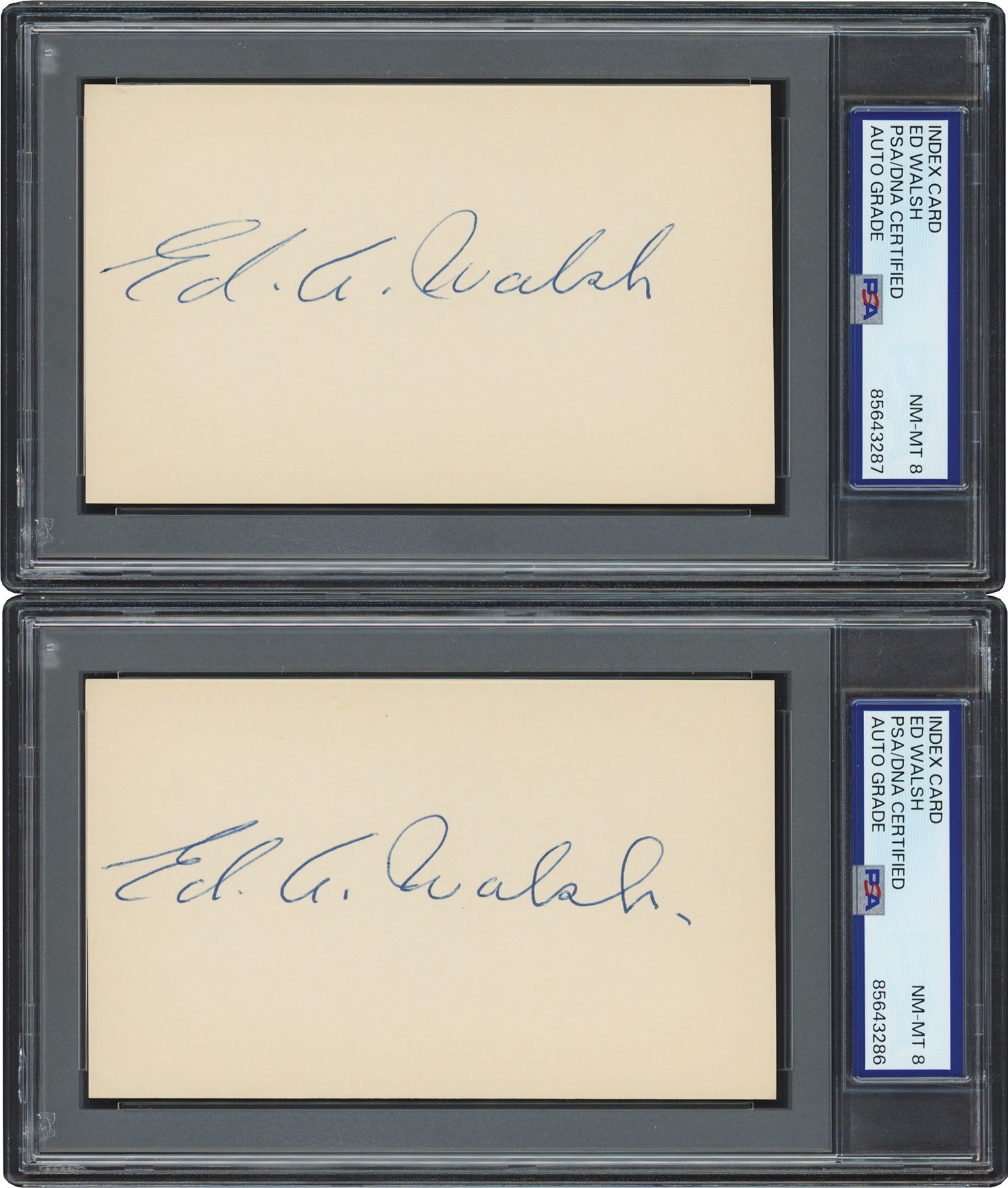 Lot # 478: Two Ed Walsh Signed Index Cards (Both PSA NM-MT 8)
