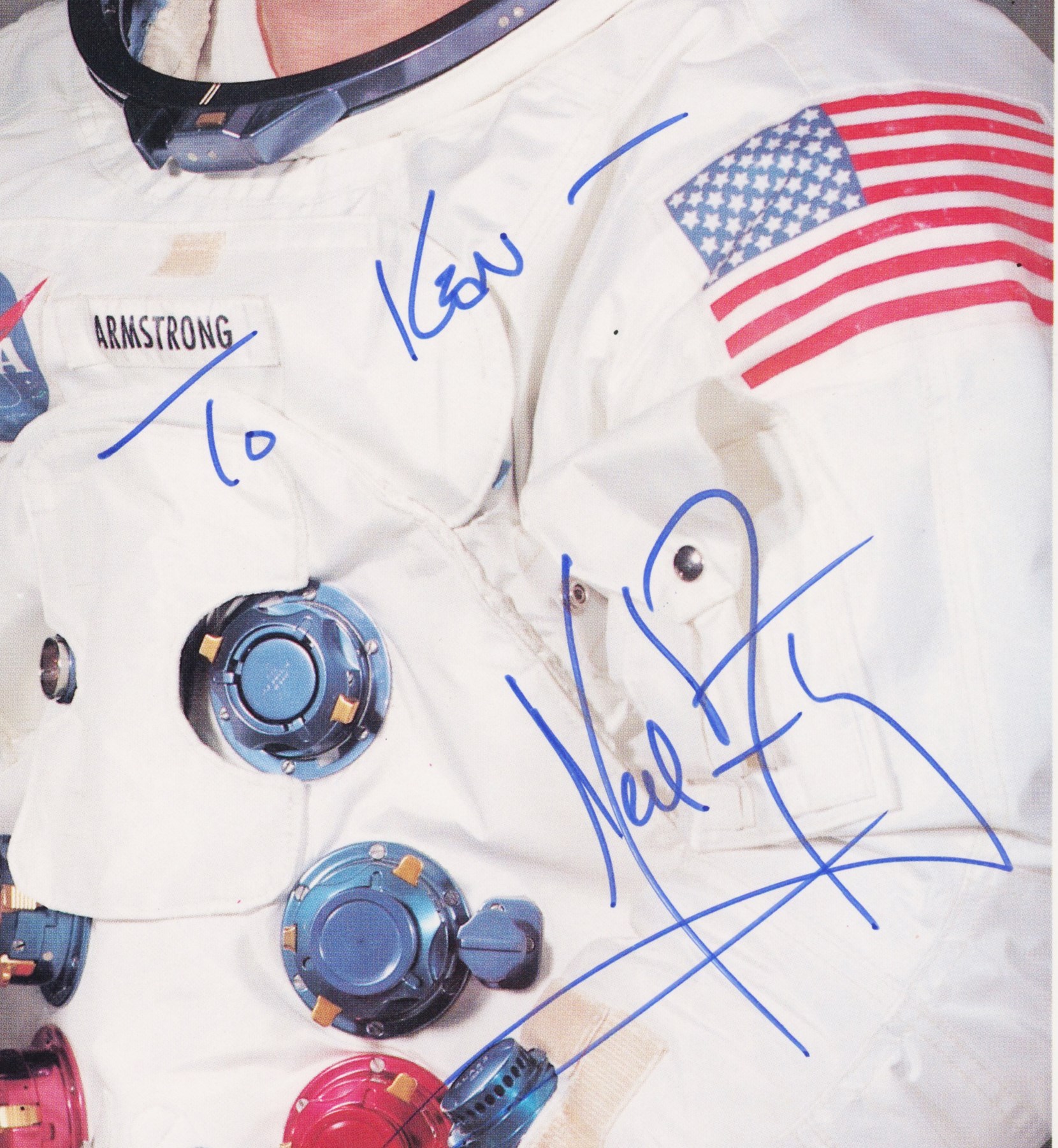The first person to walk on the moon was astronaut Neil Armstrong, when he stepped on the moon at 2:56 UTC on July 2, 1969. Offered is a signed and inscribed color photo of Armstrong in his NASA landing gear. Armstrong had an interest in flight before he even attended grammar school, and he became a licensed pilot at age 16, before he obtained a driver's license. Armstrong attended Purdue University and was a Navy aircraft carrier pilot seeing combat duty during the Korean Conflict. In 1962, Armstrong was one of the astronauts selected in NASA's second-ever group. He was chosen to be the command pilot for the Apollo 11 Mission. After landing on the moon, in front of 530 million worldwide viewers on television, Armstrong took the first human step on the moon, stating words he had written: "That's one small step for man, one giant leap for mankind." There is still controversy over whether Armstrong added the indirect article "a" before the word man. He had planned to say "a man", but some persons believe he failed to say the "a", and others say he uttered the "a", but it was drowned out by noise.