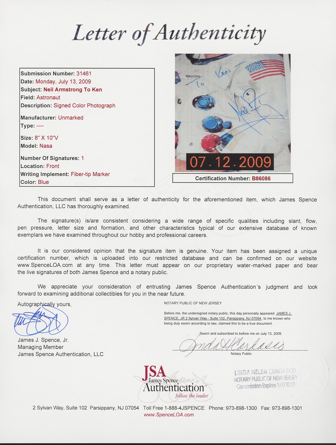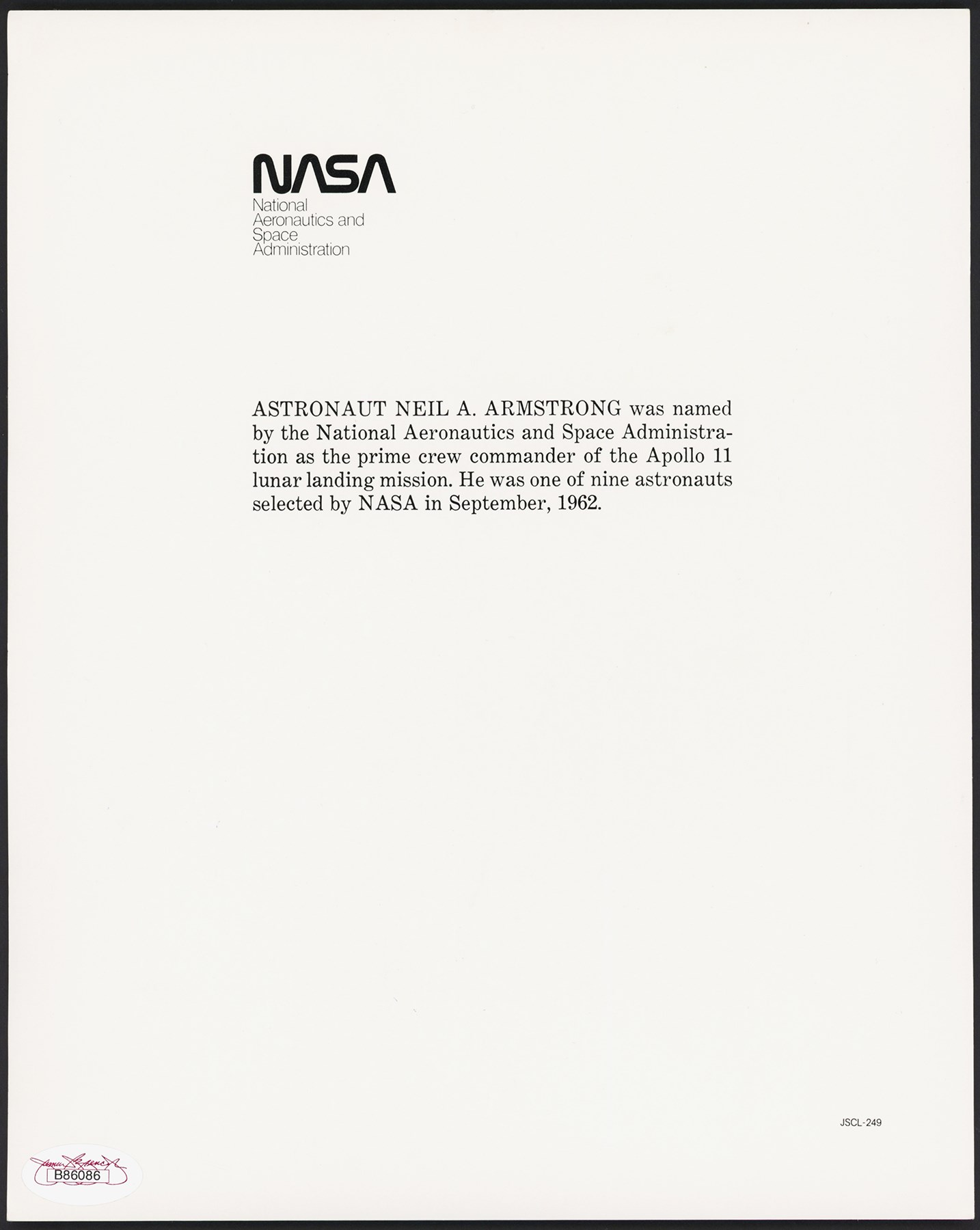 The offered photo measures 8x10". Using a fiber-tip blue marker, Armstrong boldly inscribed and signed the photo, writing on the front: "To Neil - Neal Armstrong." The offering comes with a JSA LOA for the signature (Cert. Number B86086). The signed photo is in EXCELLENT condition. Around 1993, Armstrong found that his freely given autographs were being sold online, and he essentially stopped giving autographs. He lived until 2012, but autographs from his later years are extremely limited.