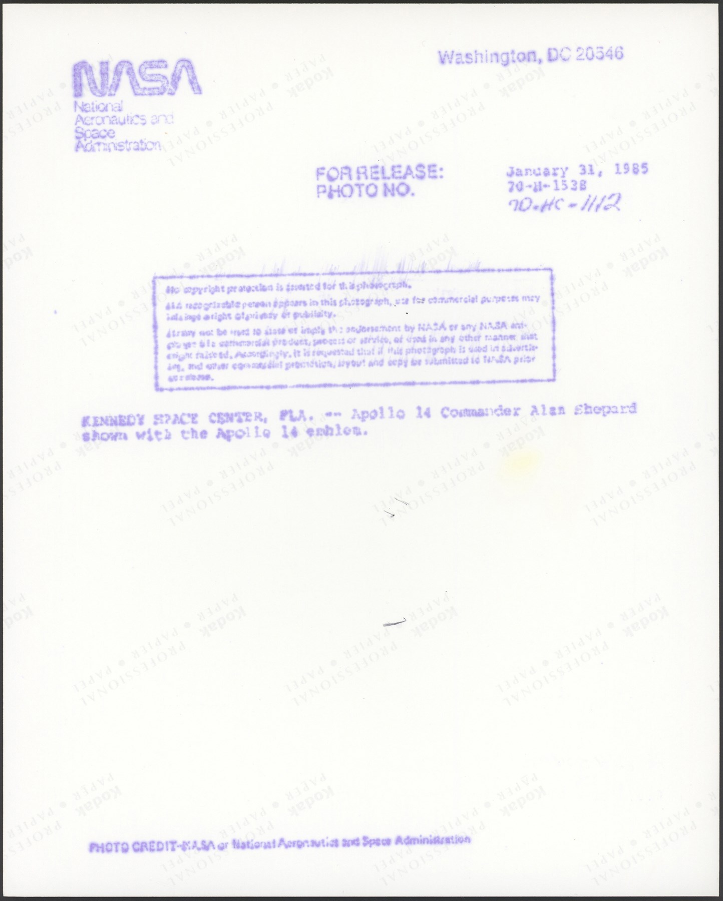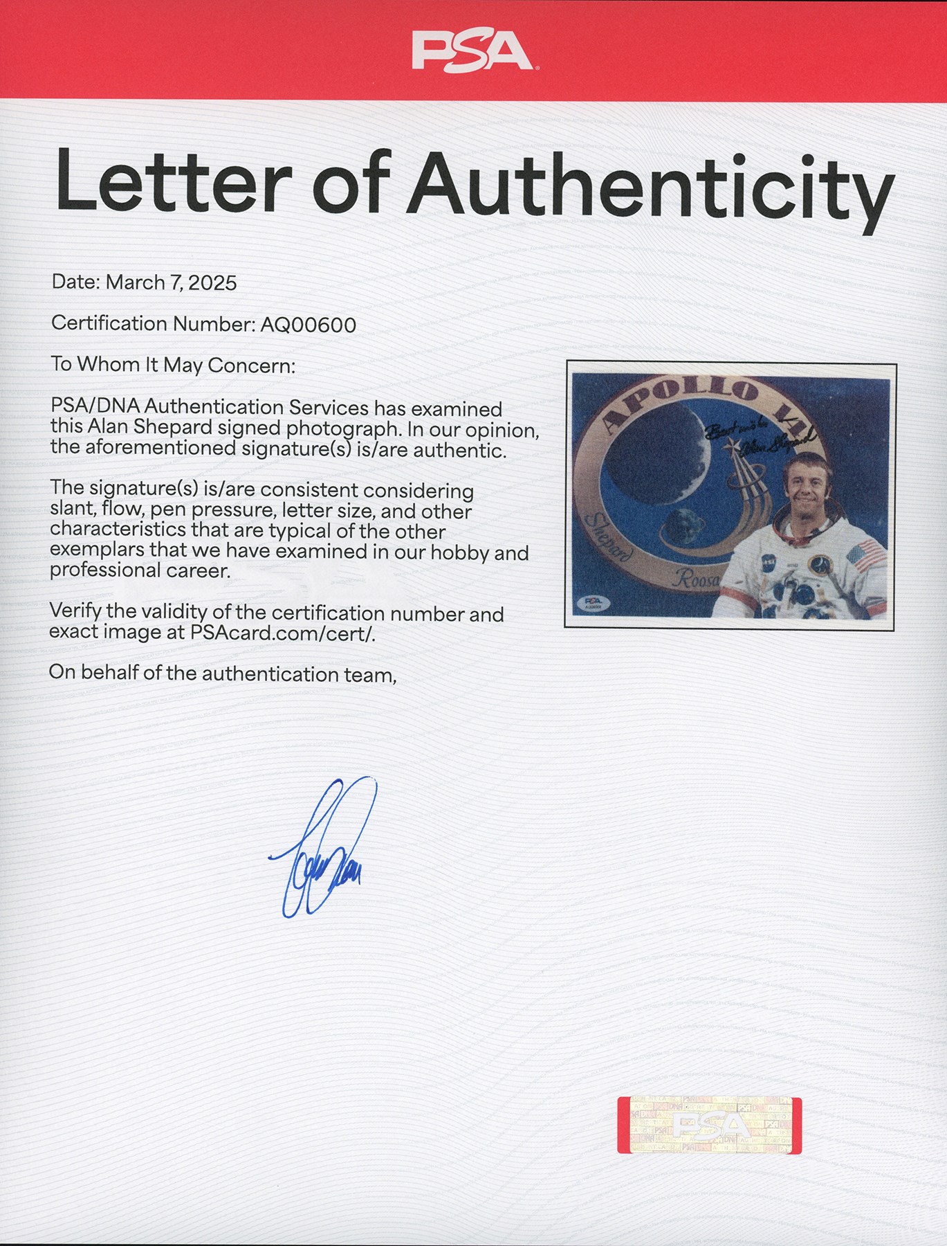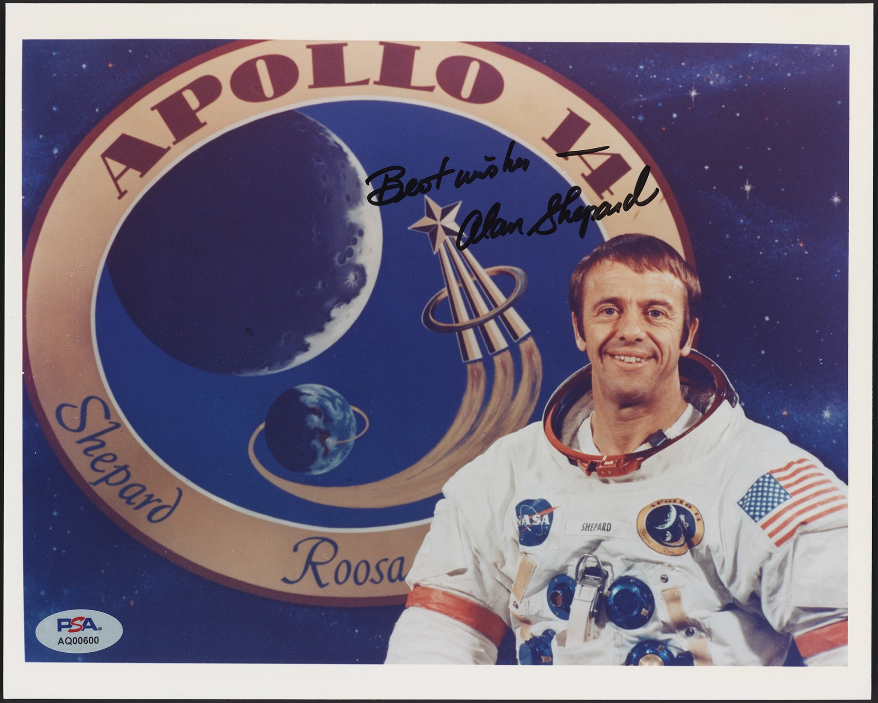 The offering comes with a PSA LOA (CERT. NUMBER: AQ00600) for the signed photograph that measures approx. 8x10". Using bold script from a black marker, Shepard inscribed and signed the photo as, "Best wishes - Alan Shepard." The signed photograph reads, in part, "APOLLO 14/Shepard Roosa." On back, the photo has a NASA stamp, a stamped date of "January 31, 1985" and a suggested slug line, which reads, "KENNEDY SPACE CENTER, FLA. - Apollo 14 Commander Alan Shepard shown with the Apollo 14 emblem." The offering is in EXCELLENT condition.