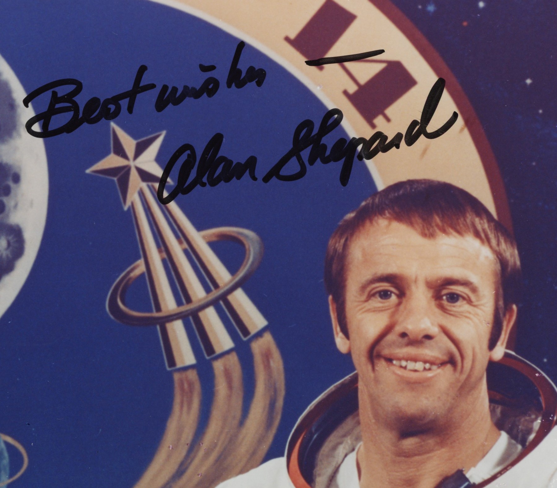 Presented is a signed color photograph of American Astronaut Alan Shepard. Alan Shepard was one of the original astronauts selected for NASA's Mercury Program, and on May 5, 1961, the Naval Academy graduate was the first American astronaut, and the second person overall, to reach space. Daring adventures ran in his family: He was a descendant of Mayflower passenger Richard Warren. Shepard was the pilot of Freedom 7, and as the first American in outer space, he reached an altitude of 101.2 nautical miles in his suborbital trajectory. On his return from space, he was picked up by a Navy ship n the Atlantic Ocean. Shepard had a good sense of humor, and when a reporter asked him what he thought about in the space capsule while waiting for the rocket to blast off, he replied, "The fact that every part of this ship (rocket) was built by the lowest bidder." Shepard was celebrated in ticker tape parades in Washington, New York, and Los Angeles. Among his many honors were a NASA Distinguished Service Medal, and a Distinguished Flying Cross. Years later, Shepard commanded the Apollo 14 moon landing.