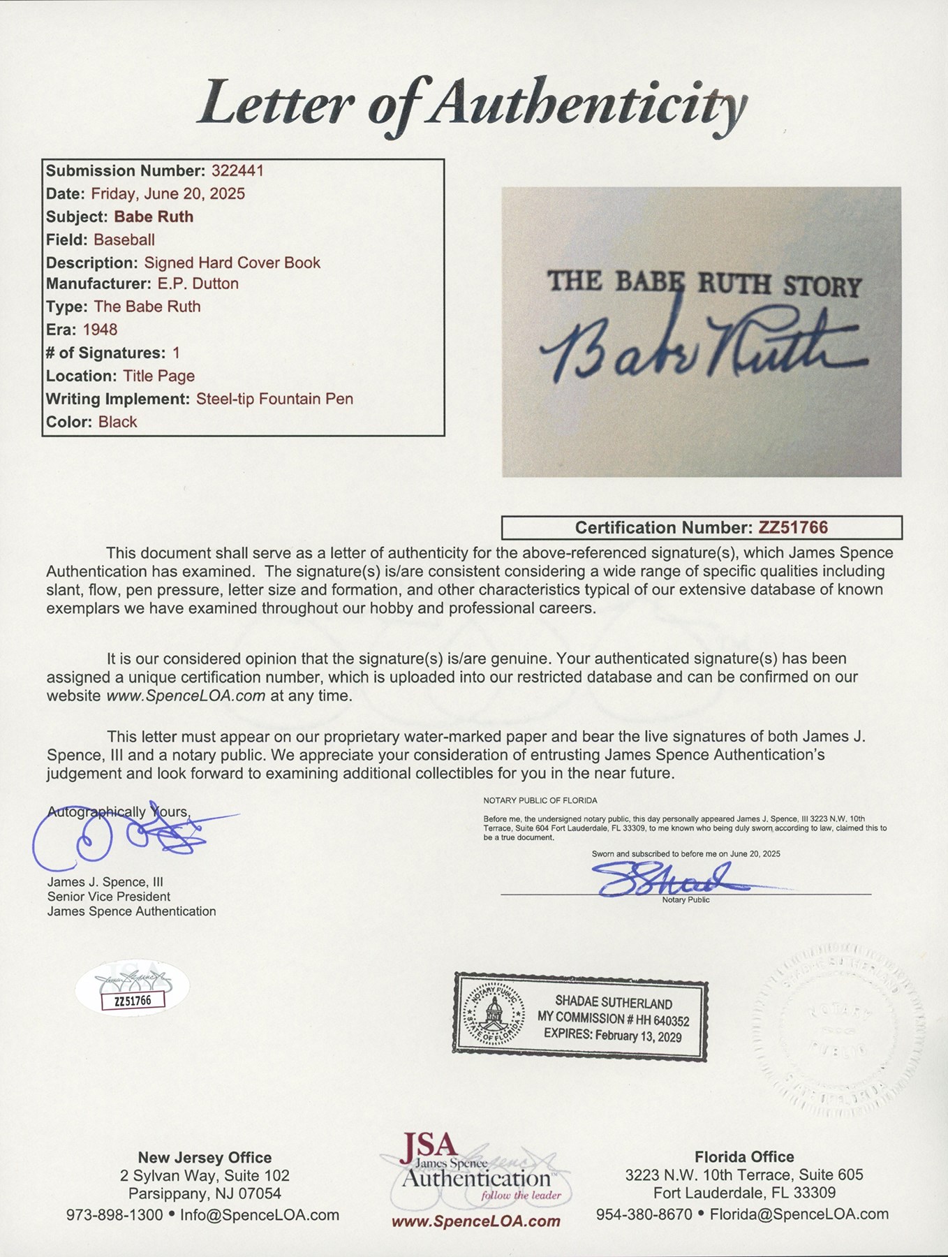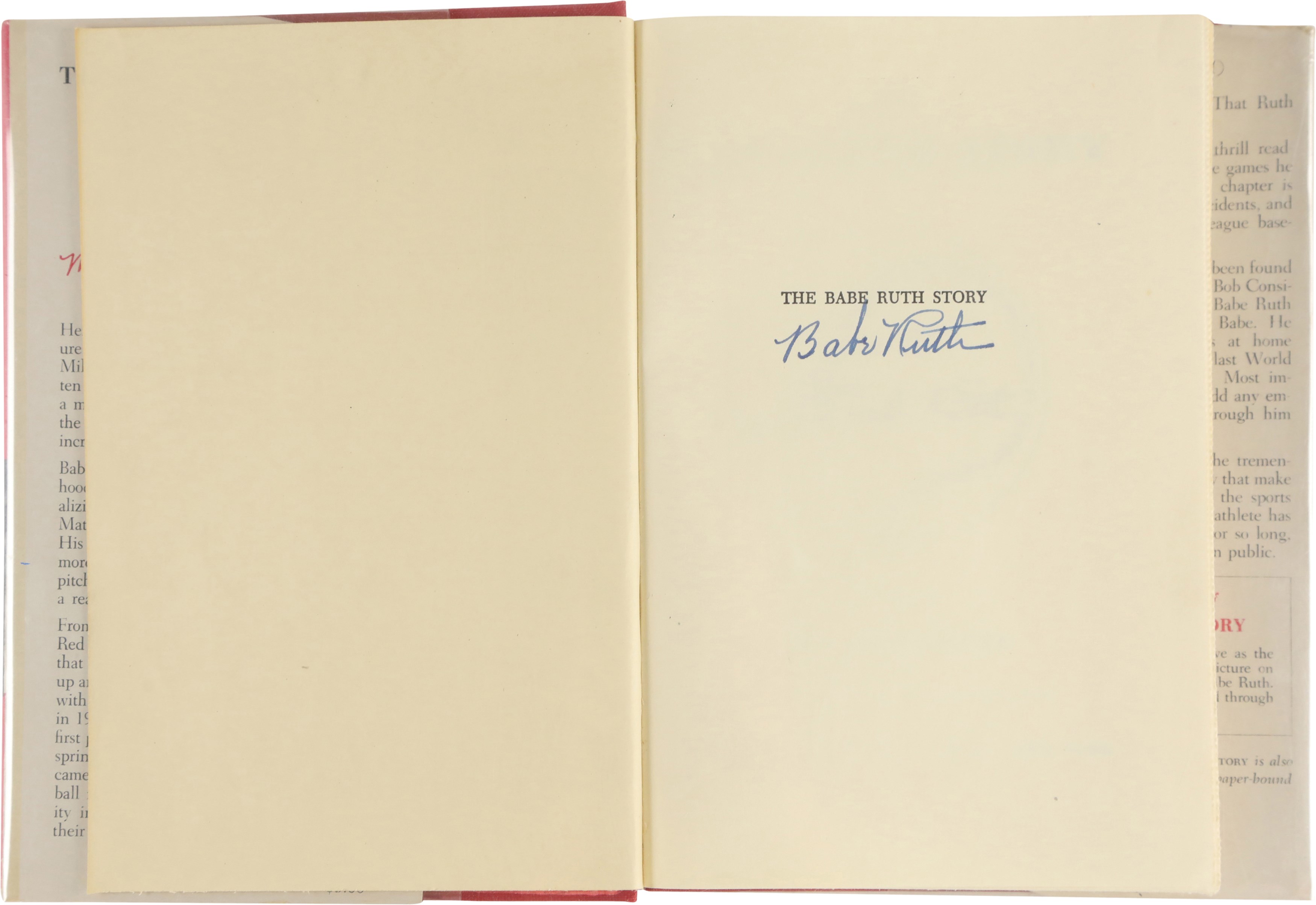 "The Babe Ruth Story" autobiography signed by Ruth. Printed in 1948 by E. P. Dutton & Co., Inc., "The Babe Ruth Story" is a 6x8.25", 250 page hardcover book. Ruth signed the title page in blue ink, just beneath the typed title of the book. The book is in very good condition and includes the original dust jacket. Includes a full LOA from PSA.