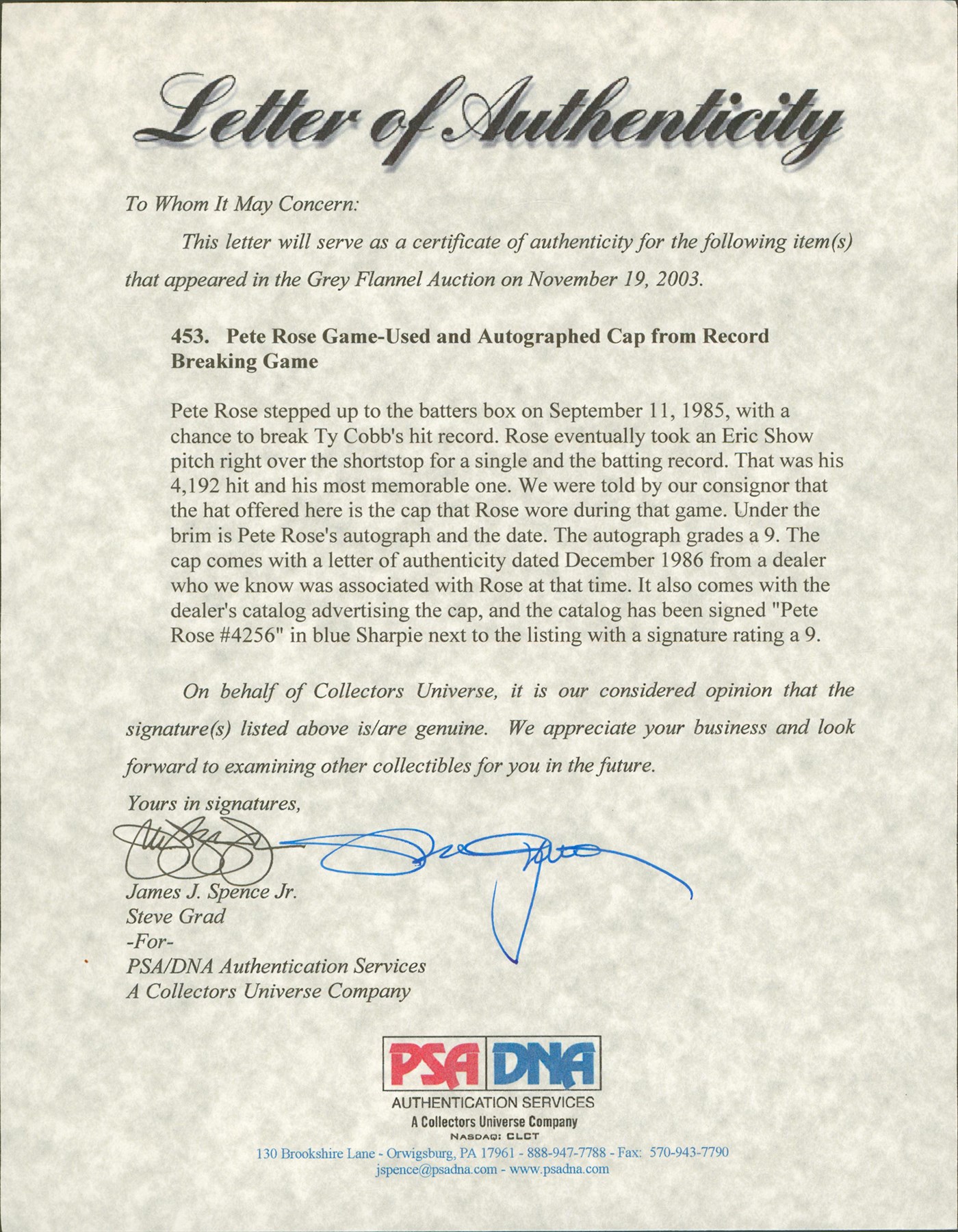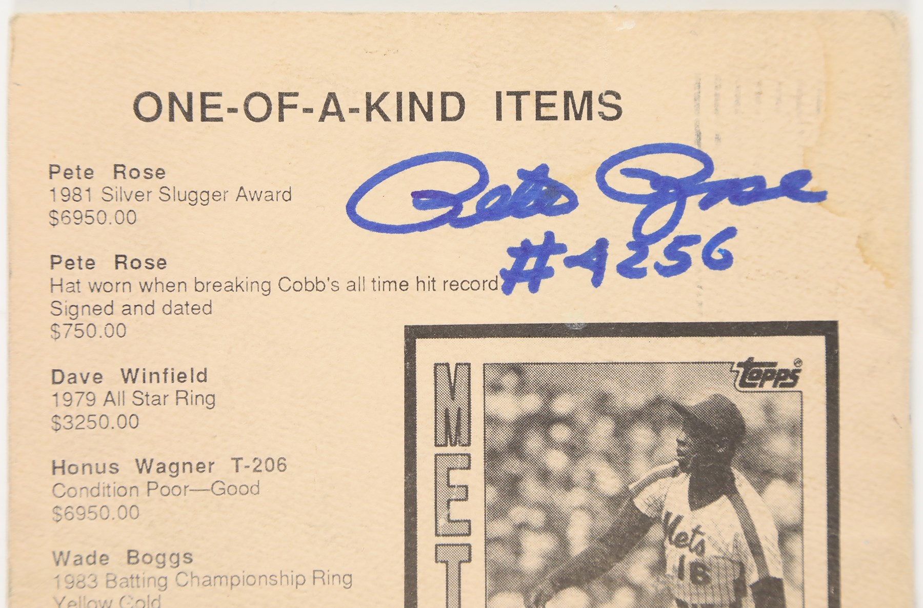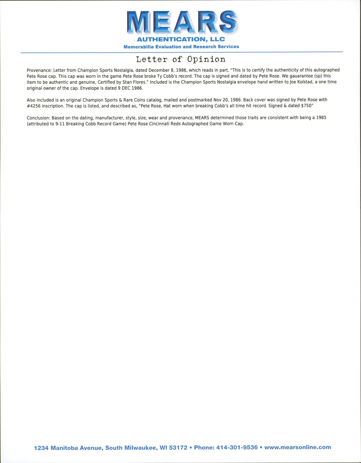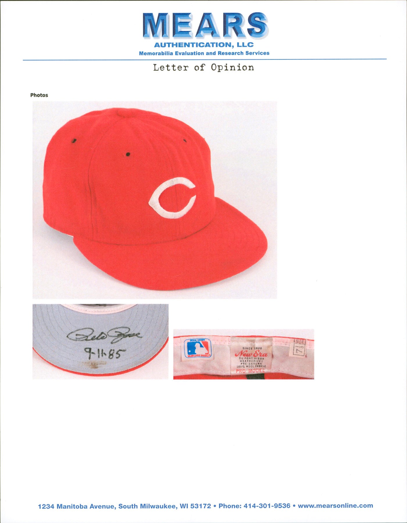 Pete Rose wore this hat on September 11, 1985 at Riverfront Stadium, during the game in which he broke Ty Cobb's all-time hit record. Rose autographed the underside of the brim and included "9-11-85" under his name. The hat shows moderate signs of use, and has a dirt stain on the underside of the brim. The hat has been authenticated by MEARS, and a full LOA is included. A PSA LOA is included too, which verifies the authenticity of the signature. This hat was originally offered for sale in 1986 by a store called "Champion Sports & Rare Coins," in California. An original catalog from the store included, and it has been signed by Rose. Rose added "#4256" with his signature. Rose signed his name on the page that includes this listing for this hat. The listing reads, "Pete Rose: Hat worn when breaking Cobb's all time hit record."