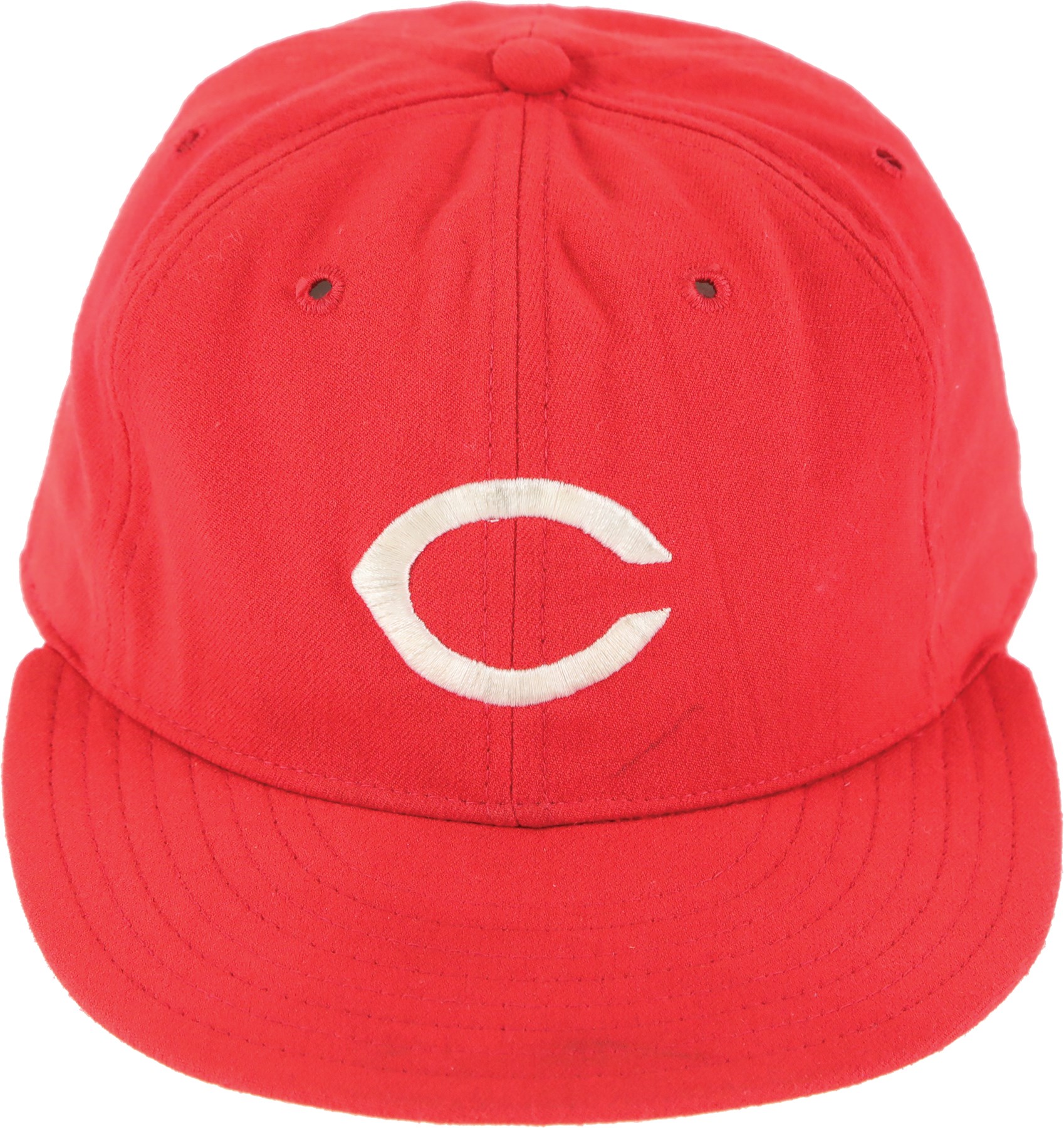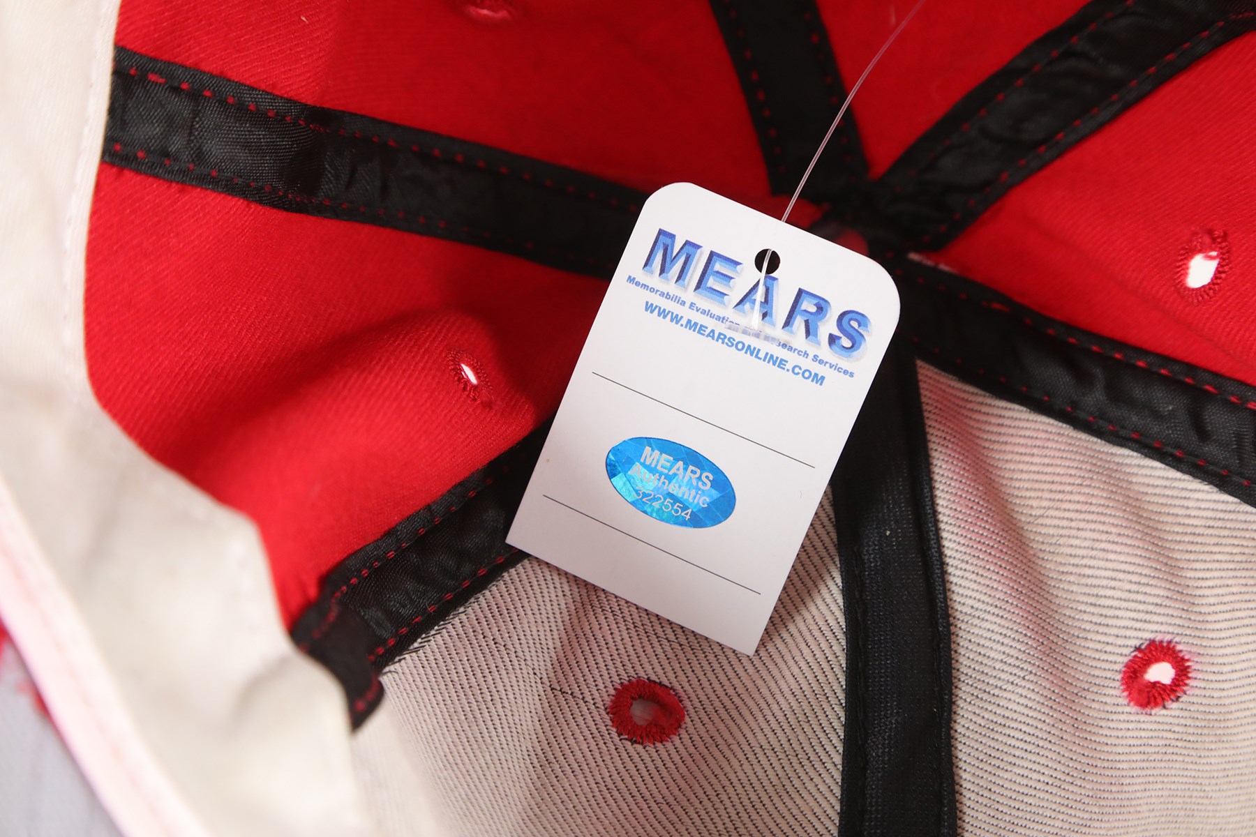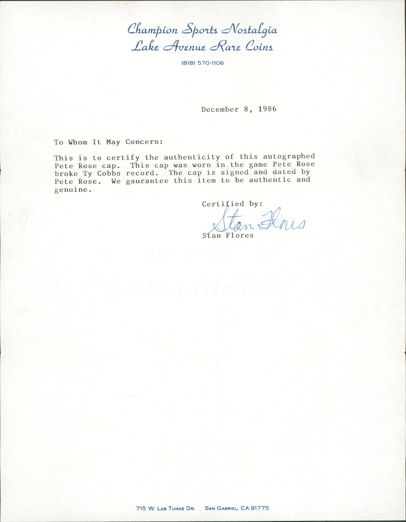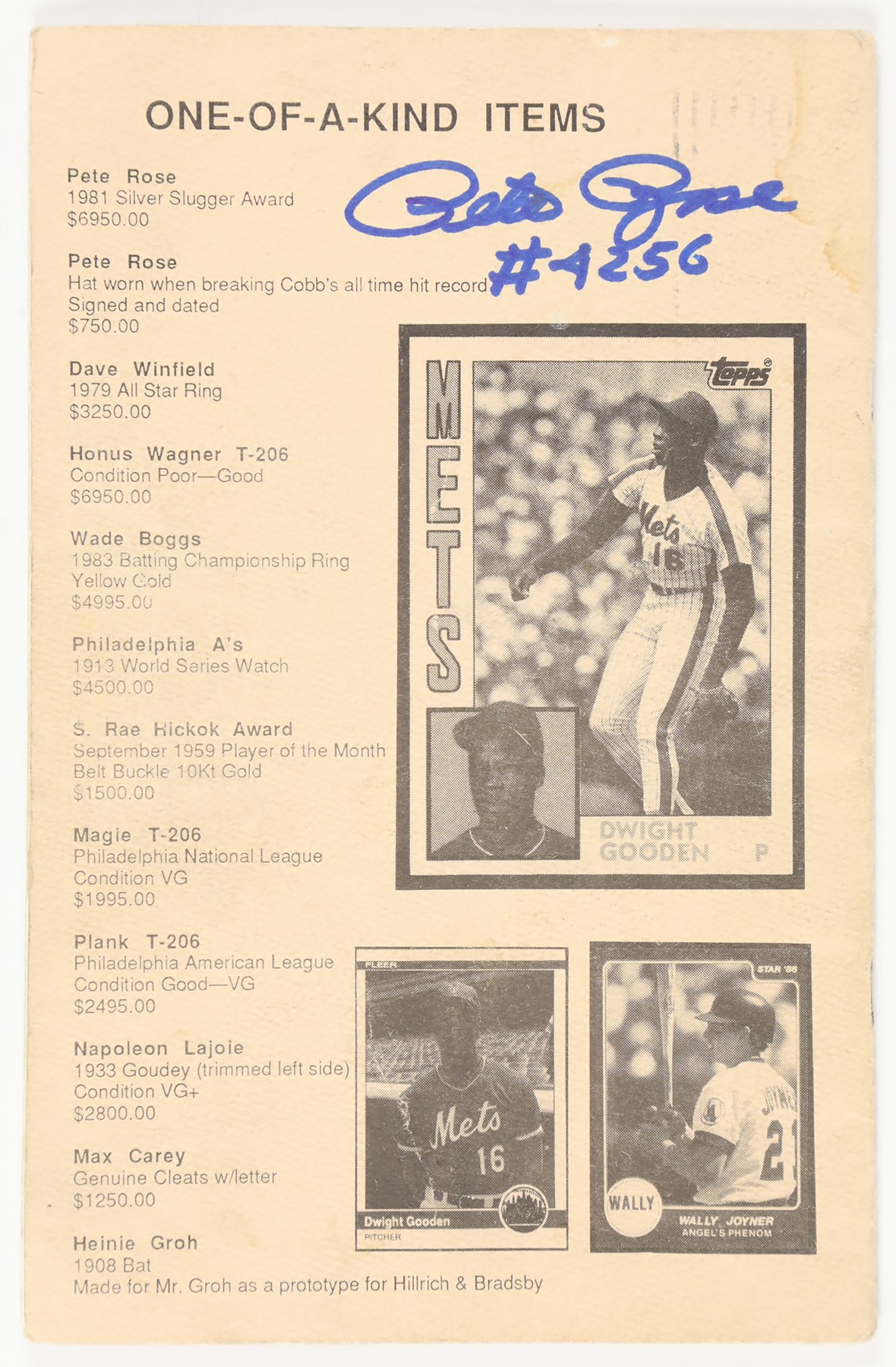 Pete Rose wore this hat on September 11, 1985 at Riverfront Stadium, during the game in which he broke Ty Cobb's all-time hit record. Rose autographed the underside of the brim and included "9-11-85" under his name. The hat shows moderate signs of use, and has a dirt stain on the underside of the brim. The hat has been authenticated by MEARS, and a full LOA is included. A PSA LOA is included too, which verifies the authenticity of the signature. This hat was originally offered for sale in 1986 by a store called "Champion Sports & Rare Coins," in California. An original catalog from the store included, and it has been signed by Rose. Rose added "#4256" with his signature. Rose signed his name on the page that includes this listing for this hat. The listing reads, "Pete Rose: Hat worn when breaking Cobb's all time hit record."