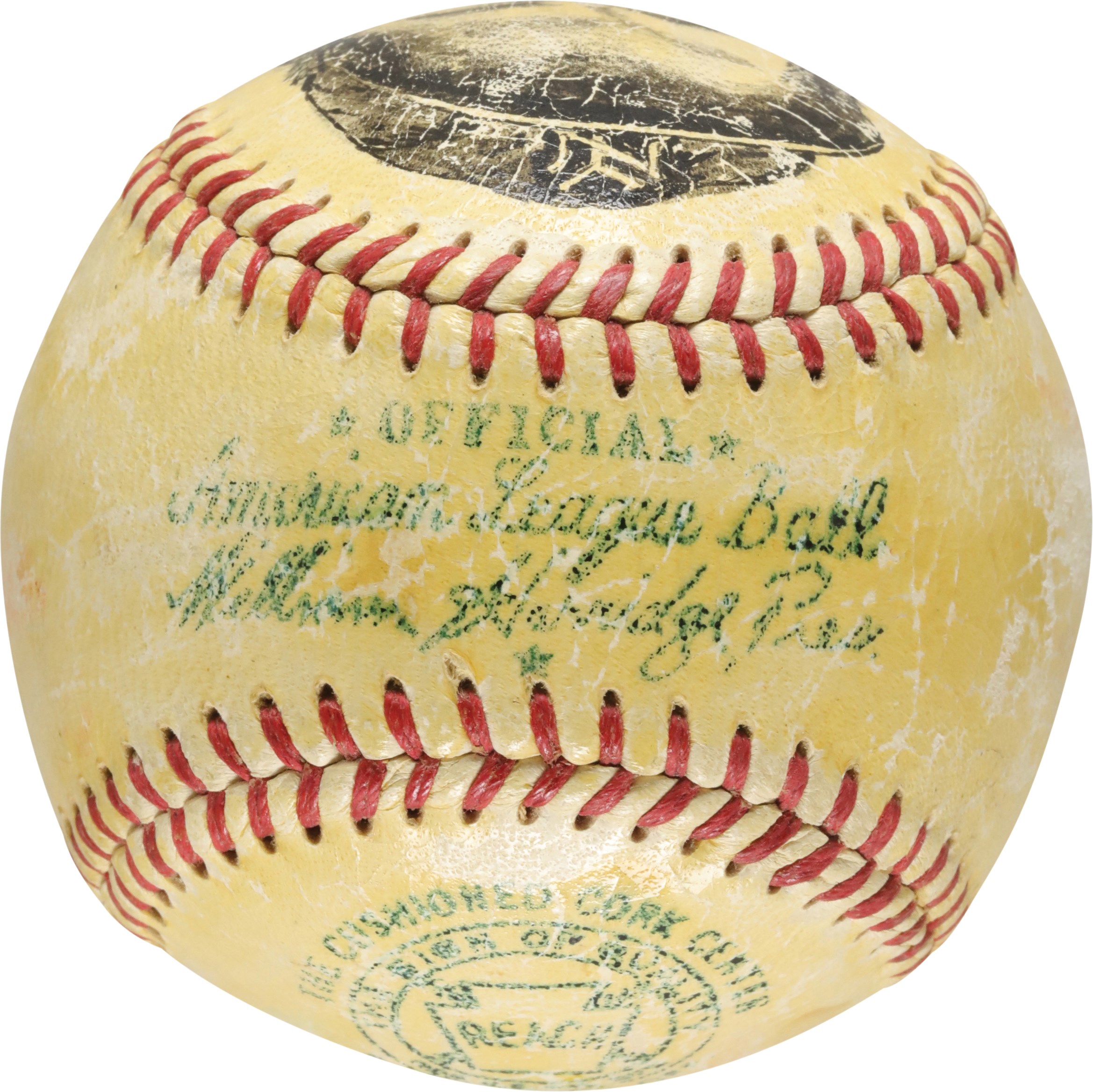Babe Ruth hand-drawn portrait baseball by Doc Werner. This Official American League (Harridge) baseball features a hand-drawn black and white portrait of Babe Ruth on the side panel. "NEW YORK" is written under the portrait, and artist Doc Werner printed his name on the sweet spot. Werner wrote "THE BABE," GEORGE HERMAN RUTH," and "BOSTON/NEW YORK AL, BOSTON, NL, 1915-1935" on the side panels of the ball. Werner was a folk artist who was best known for making hand-painted portrait baseballs in the 1950s.