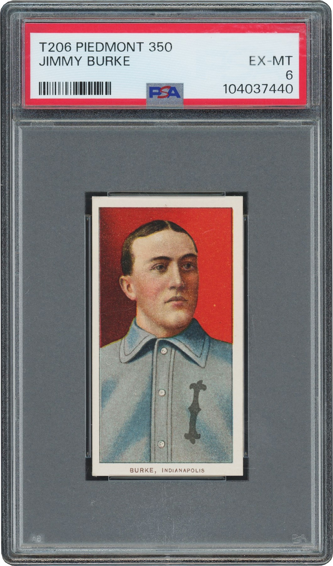 1909-11 T206 Jimmy Burke-Indianapolis-Piedmont 350 card. The card has been graded and encapsulated by PSA EX-MT 6. It has a colorful image of Burke set against a deep red background. The borders remain white while the edges appear smooth. Centering is slightly off left to right and top to bottom. The top left corner exhibits light wear while the remaining corners are harp. The reverse is bright and clean.
