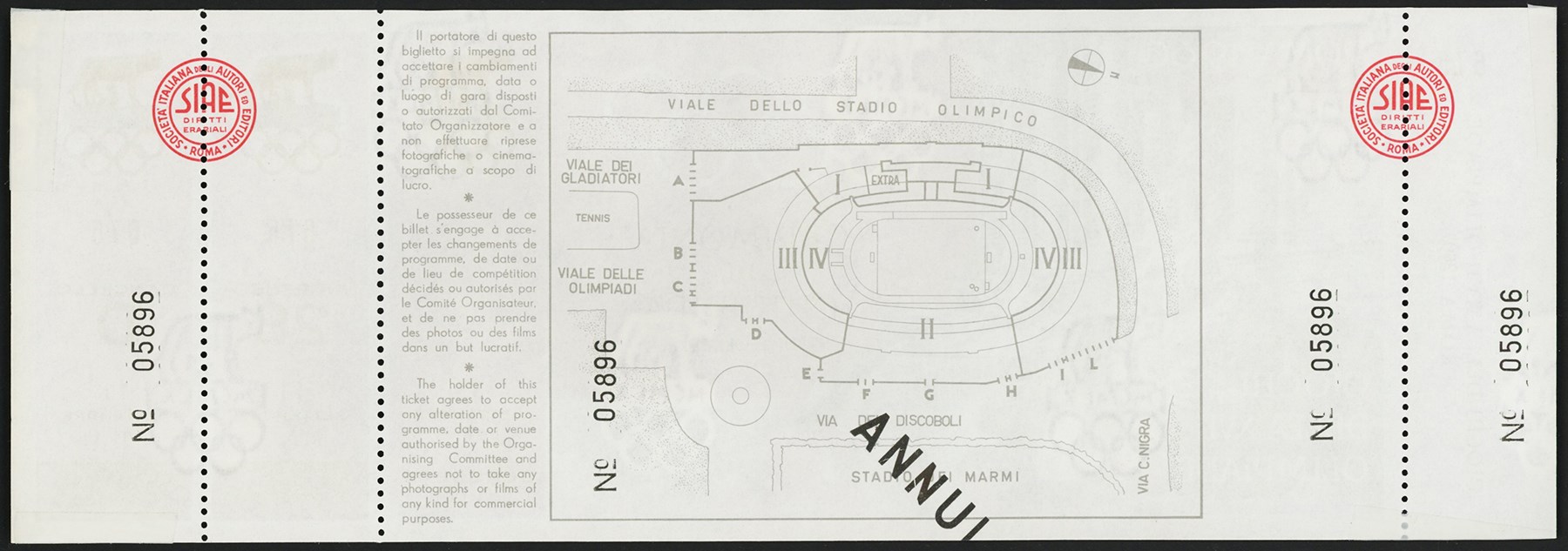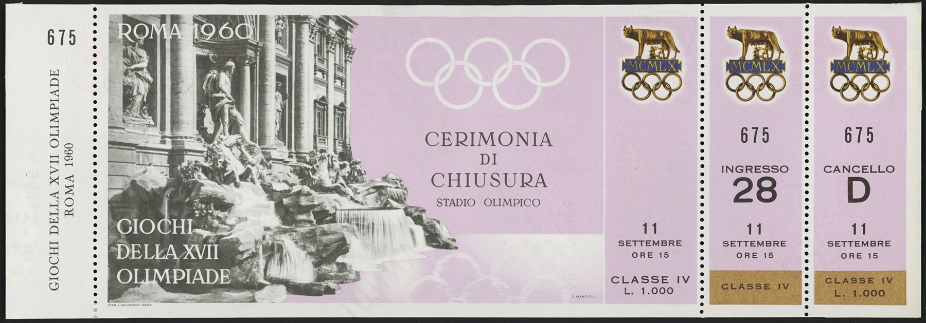 Full ticket for the opening ceremony to the 1960 Summer Olympics held in Rome, Italy, on September 11, 1960. Ticket measures approximately 10.75x3.75". Some Scotch tape noticed on the back edges from previous display. Highlights for the United States at the 1960 Summer Olympics were Rafer Johnson winning a Gold Medal in the decathlon, Wilma Rudolph winning three Gold Medals in sprint events, and Cassius Clay (Muhammad Ali) winning a Gold Medal in the light-heavyweight boxing division.