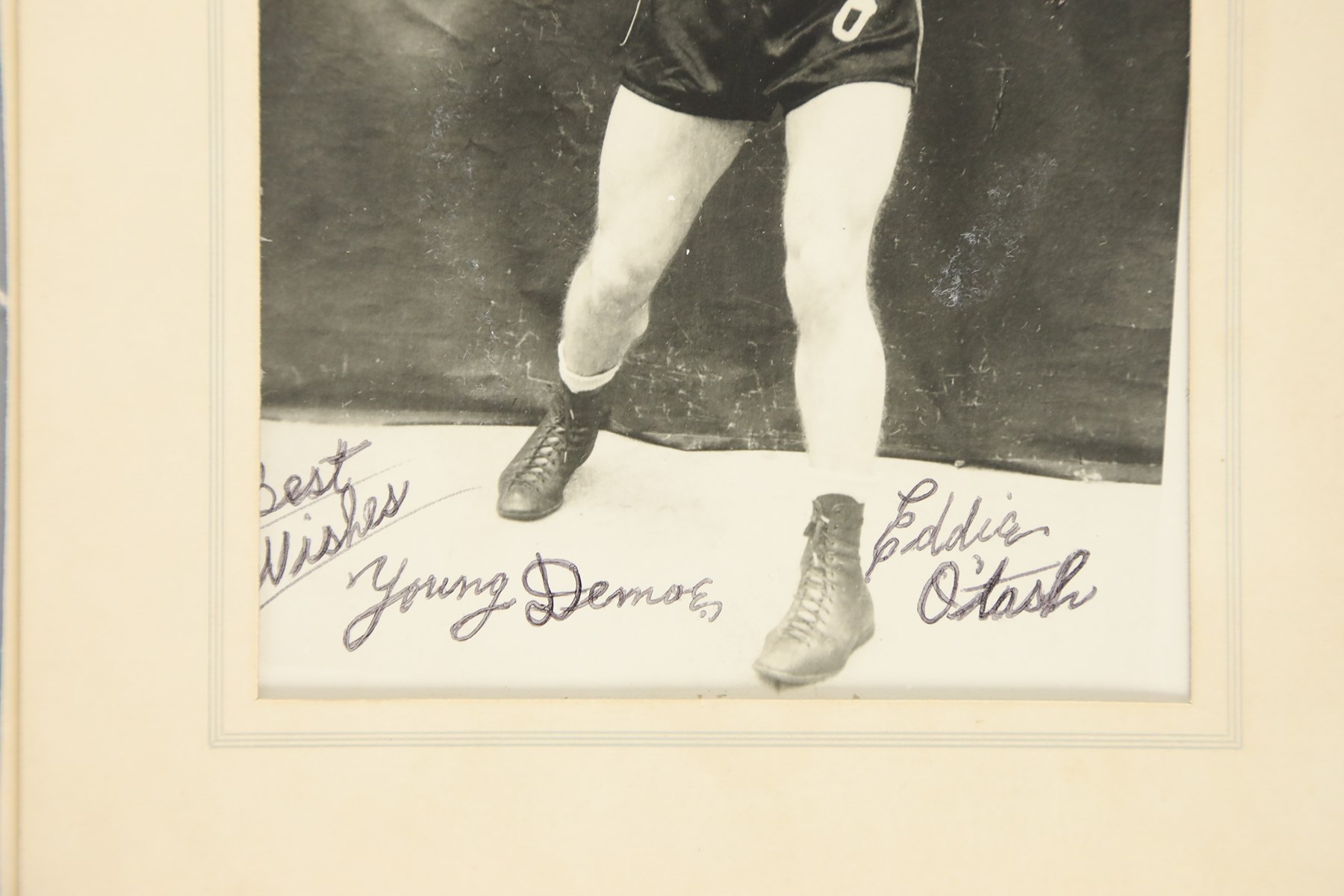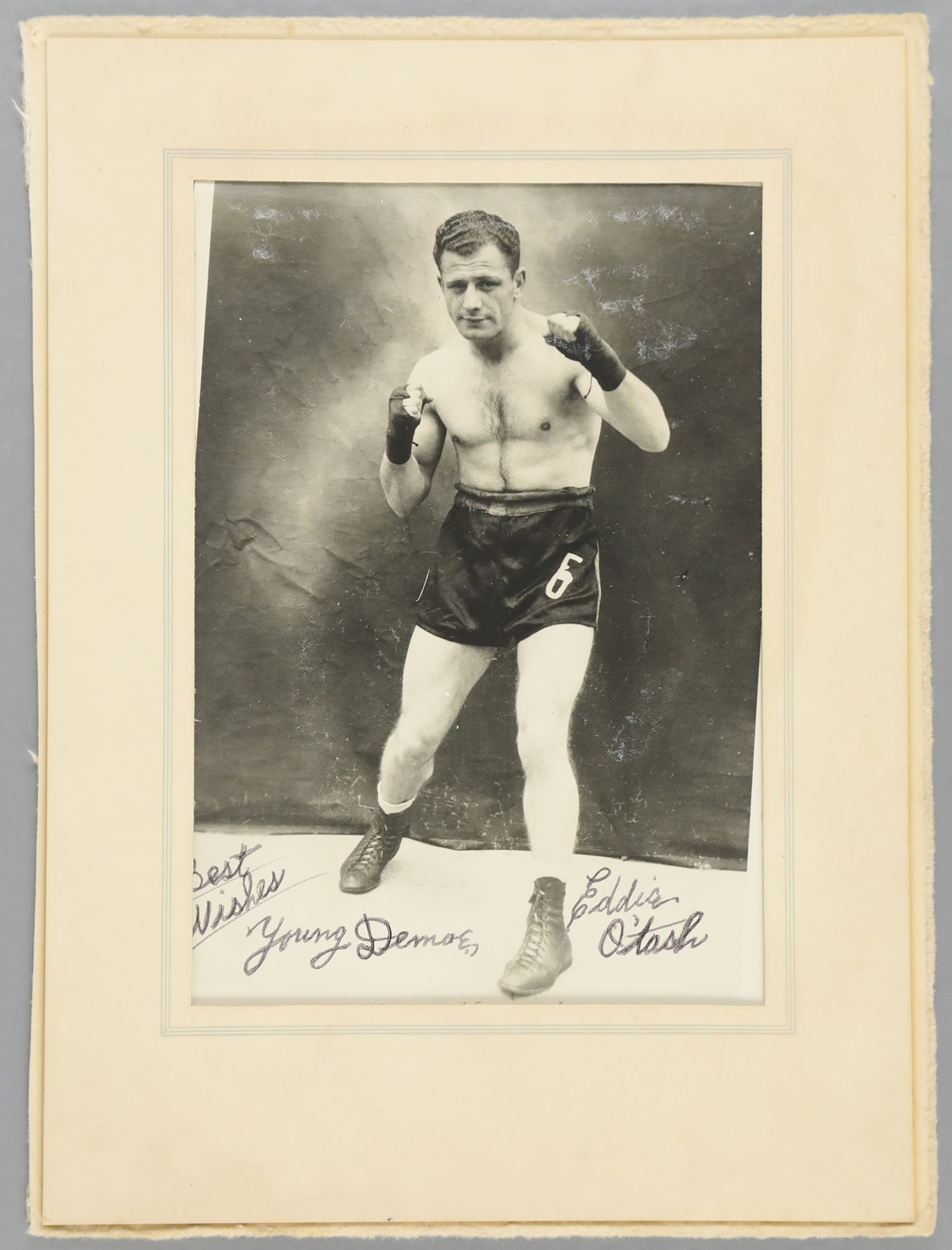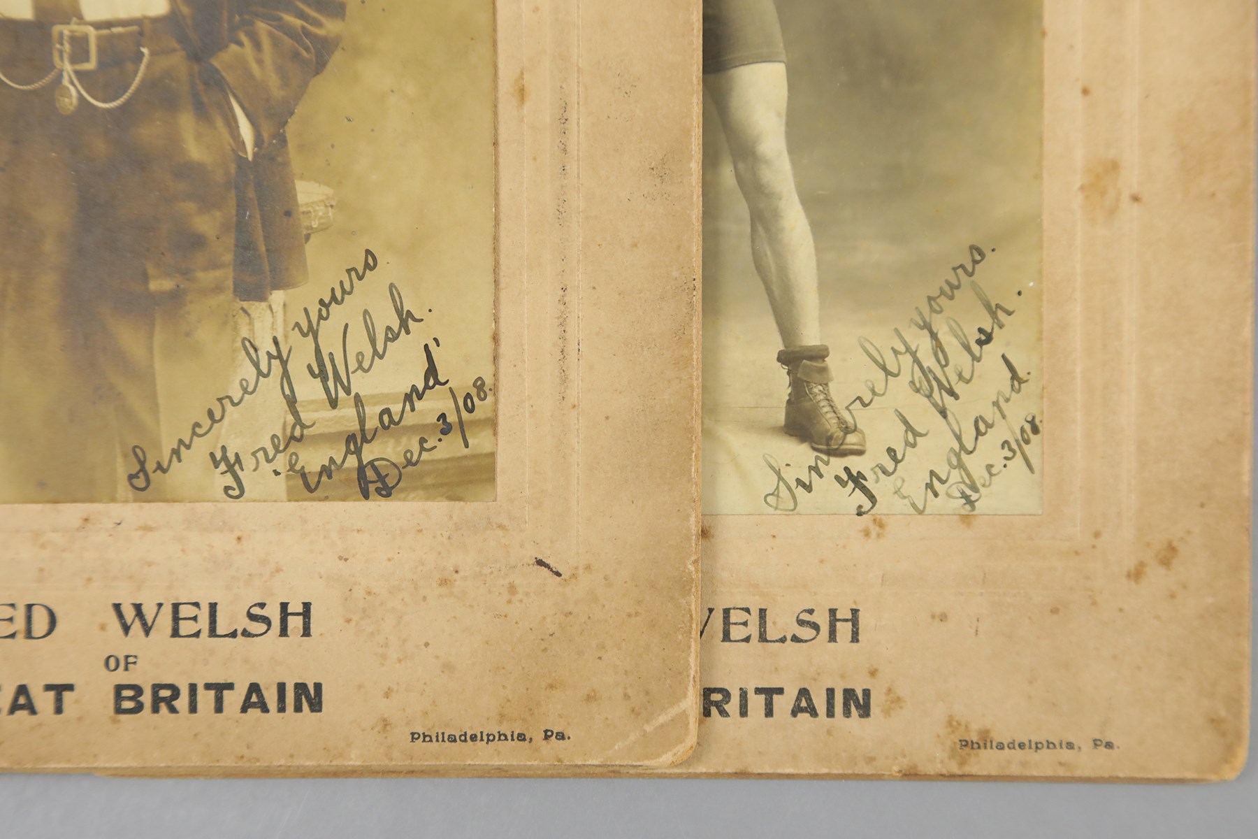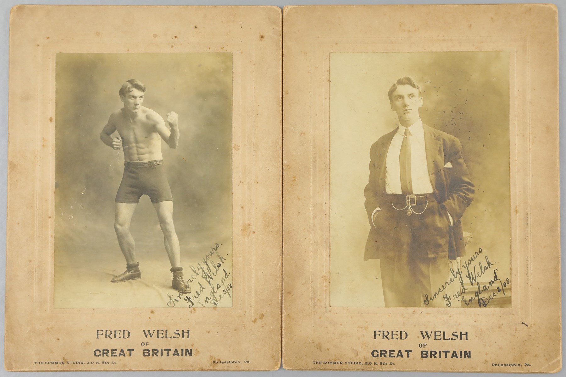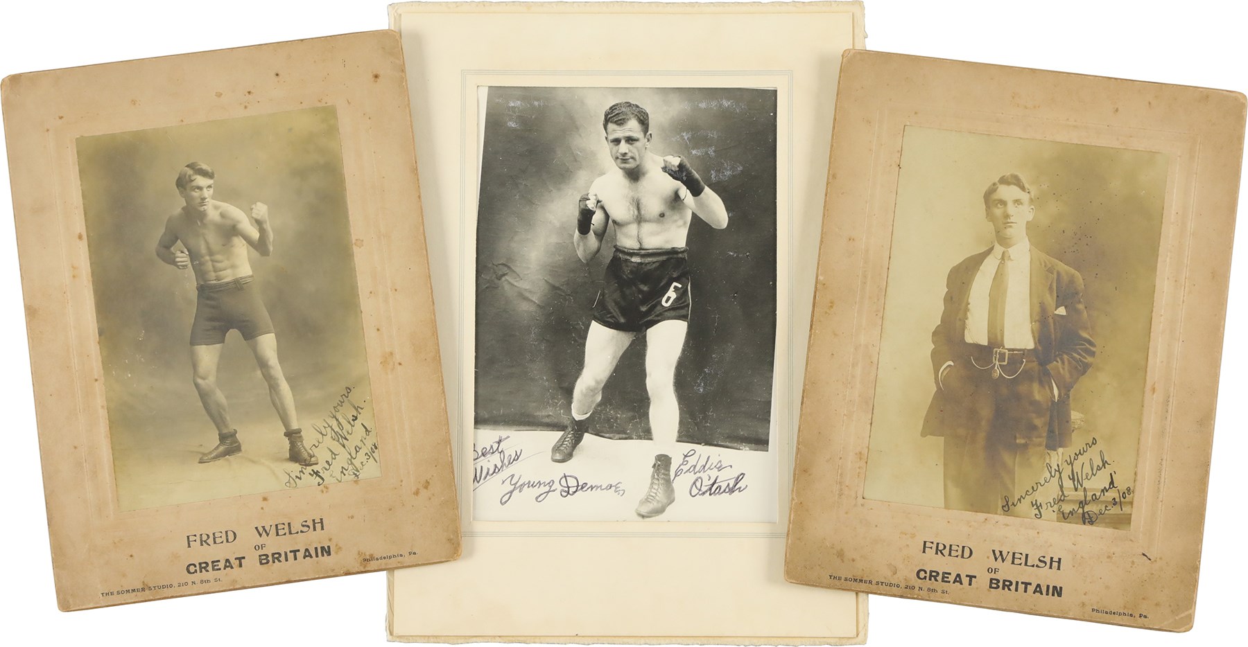 1908 Fred Welsh signed cabinet photos (2). The photos are 3.875x5.5," and they have been attached to a 6x8" mat. One of the photos shows Welsh in a suit, and the other in his boxing stance. Welsh signed both of the photos, "Sincerely yours, Fred Welsh, 'England' Dec. 3/08." Welsh won over 100 fights and was inducted into the International Boxing Hall of Fame in 1997. Also included in the lot is a signed photo of Eddie O'Tash. The 4.5x6.5" photo is matted in a 7x9.5" mat. The signature reads, "Best Wishes, Young Demoe, Eddie O'Tash." The signature and inscription appear to have been traced over.