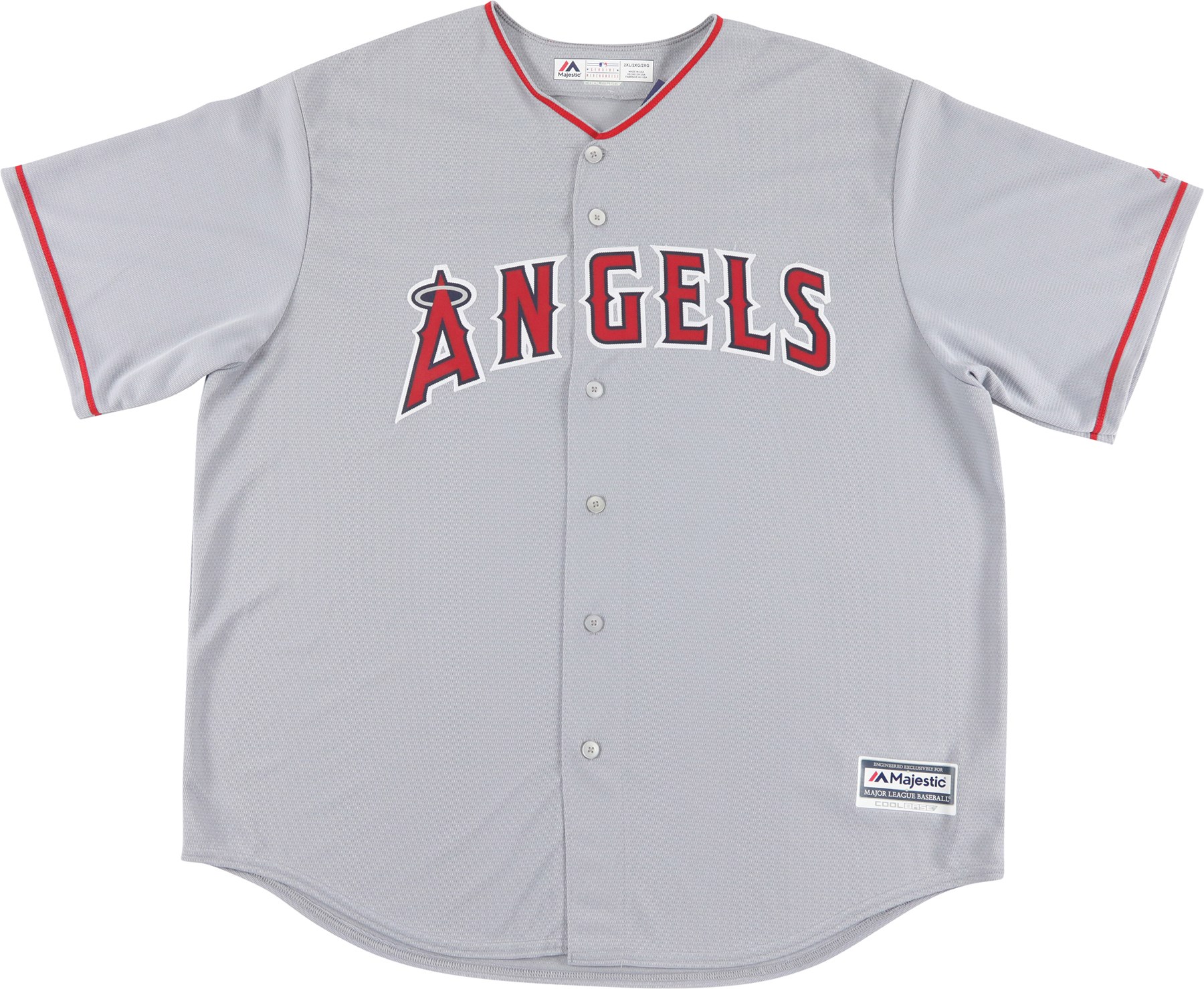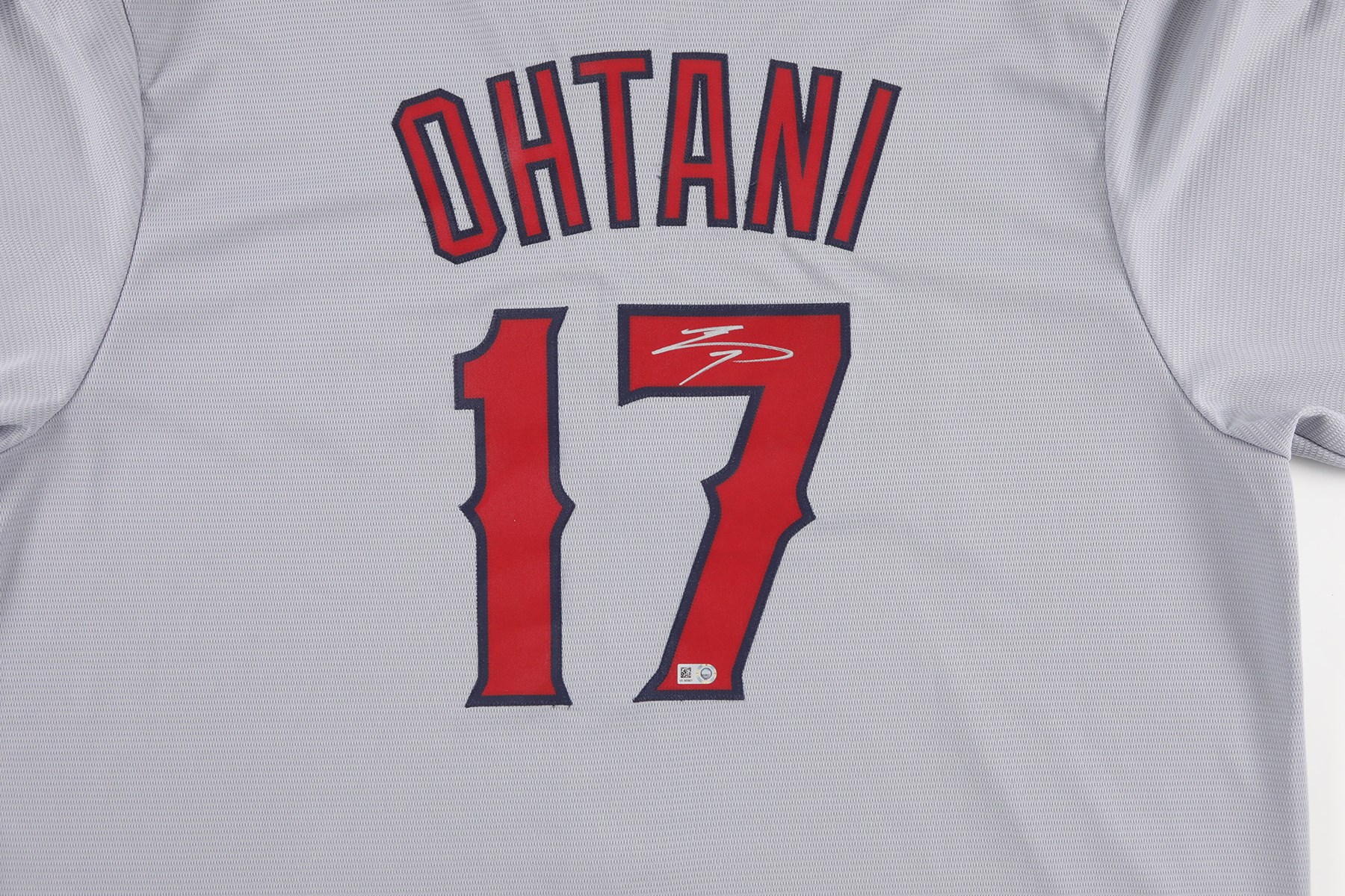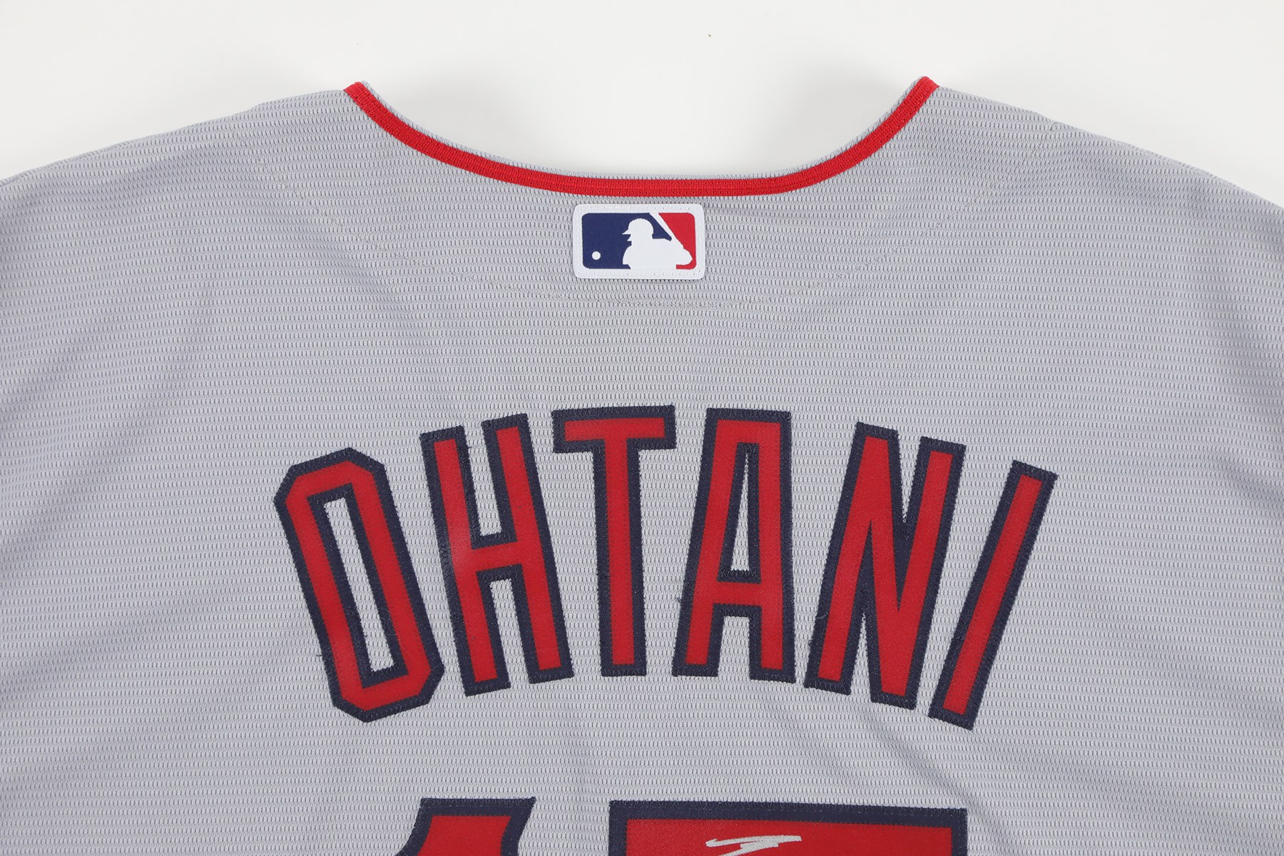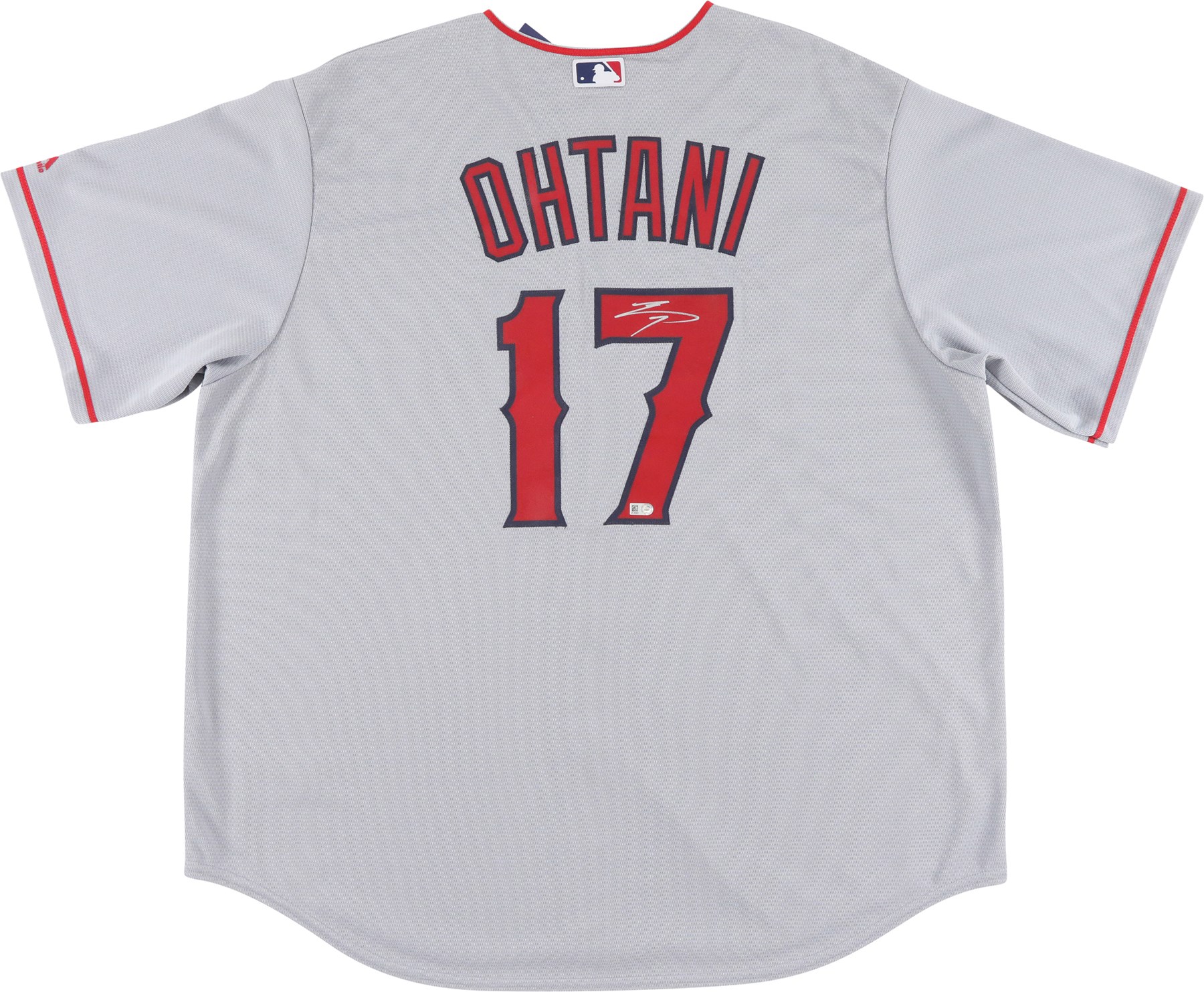 The offered signed, gray jersey has three tags in the collar: A Majestic Manufacturer's tag; MLB Genuine Merchandise; A Made in USA tag showing size "2XL". Across the chest is "ANGELS" in sewn-on red letters with midnight blue and white trim. The left sleeve has a Majestic tag. Below the above-named tags is an affixed "COOL BASE" tag. Six clear buttons run vertically down the front. On the back, outside collar is a a sewn-0n MLB logo. Below the back collar logo is "OHTANI", in sewn-on block letters with midnight blue trim. Below the name is "17", in red sewn-on numerals, with midnight blue trim. Ohtani signed the top of the numeral "7" in his number "17", using a silver marker. At the bottom of the aforementioned "7" is affixed an MLB hologram (VS 363807). The offered signed Ohtani jersey has never been worn, and it is in EXCELLENT condition. With Ohtani in the running for the best two-way player of all-time, an Shohei Ohtani signed jersey will become a prized collectible.