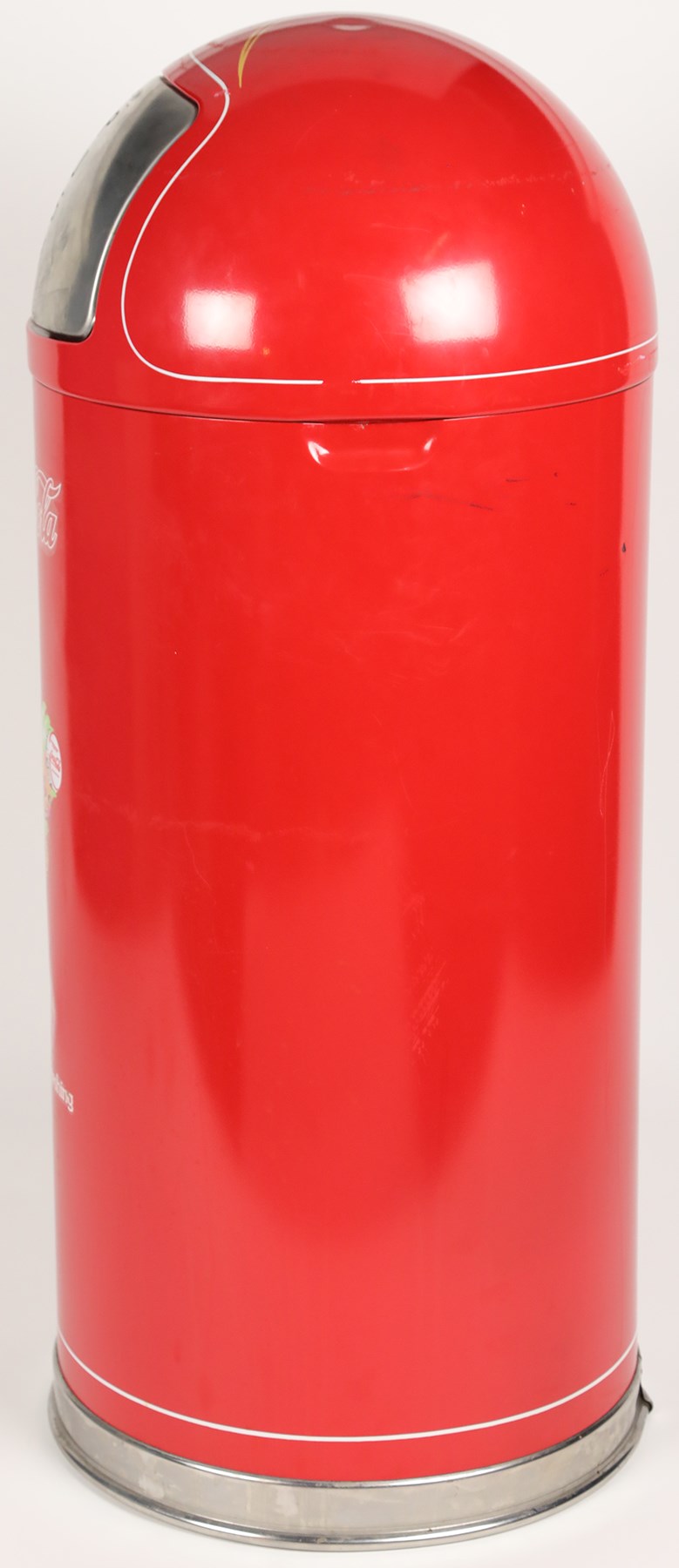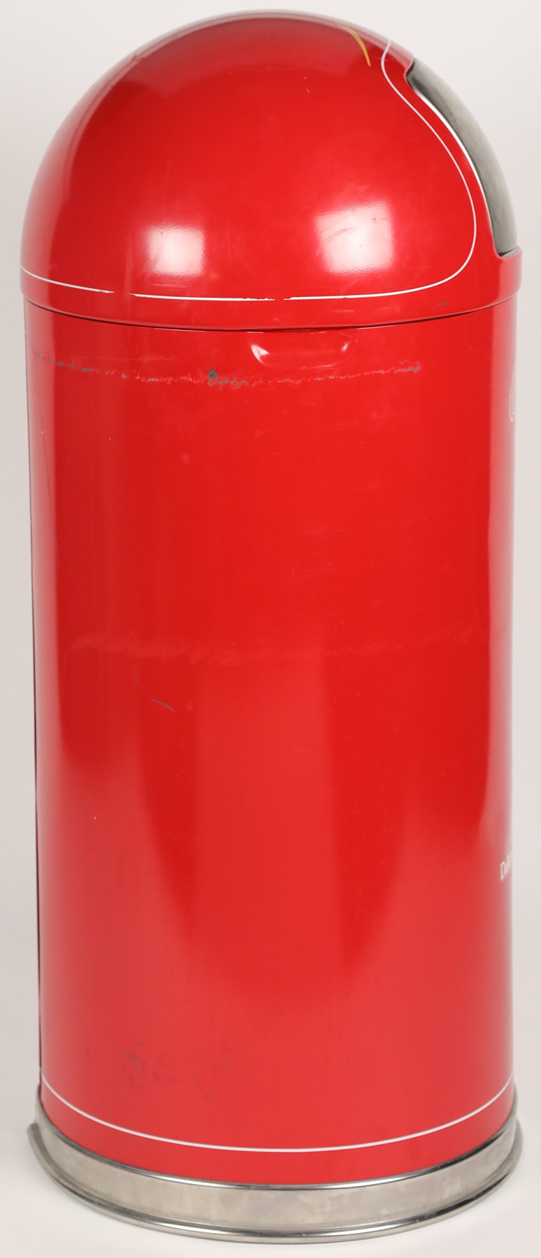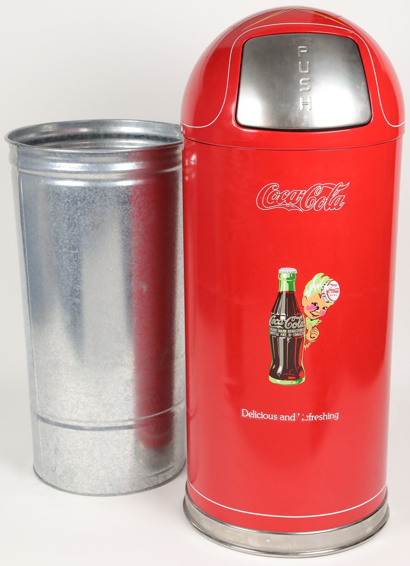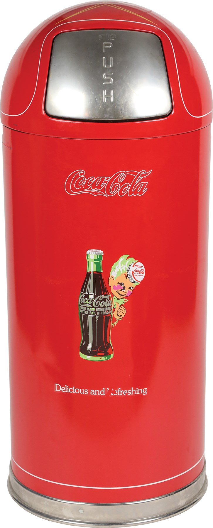 The offered trash can actually pops some good eye appeal. Mostly in Coca-Cola red, the offered can is anything but a typically drab garbage receptacle. On the front, the can reads "Coca-Cola" in its trademarked Spencerian script. There is an approximately 8" colorful Coca-Cola bottle image on front as well as an appealing, stylized image of what could be a smiling, drug store soda jerk. The trash can is really two cans in one. The outer colorful can encloses an inner, silver metallic can that actually holds the trash, while the outer can serves as a radiant Coca-Cola advertisement. The outer can has a height of approx. 36" and a diameter of approx. 16". The inner can, which can be removed, has a height of about 26.5" and a diameter of 12" at the bottom and 13.75" at the top. To allow deposits of trash, there is a working, silver-colored, swinging "door" in fine condition The outer can shows some use. There are scratch marks, some over 12" in length, and there is paint loss at various places, some abrasions, some paint repairs and small stains. The aforementioned imperfections do not substantially affect the visual appeal of the can, as the defects essentially show the can as used, but not to the extent of lessening its colorful appeal. The Coca-Cola trash can, including its inner can, weighs 18 pounds. The can would enhance any sports collection and be a fun addition to any man cave.