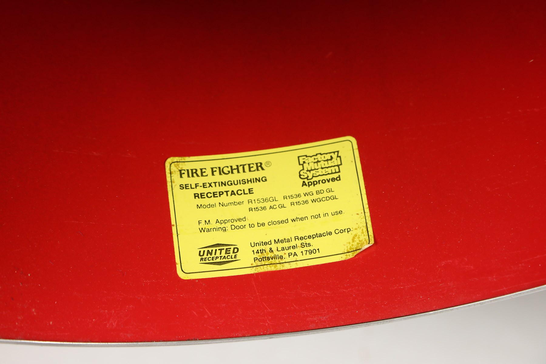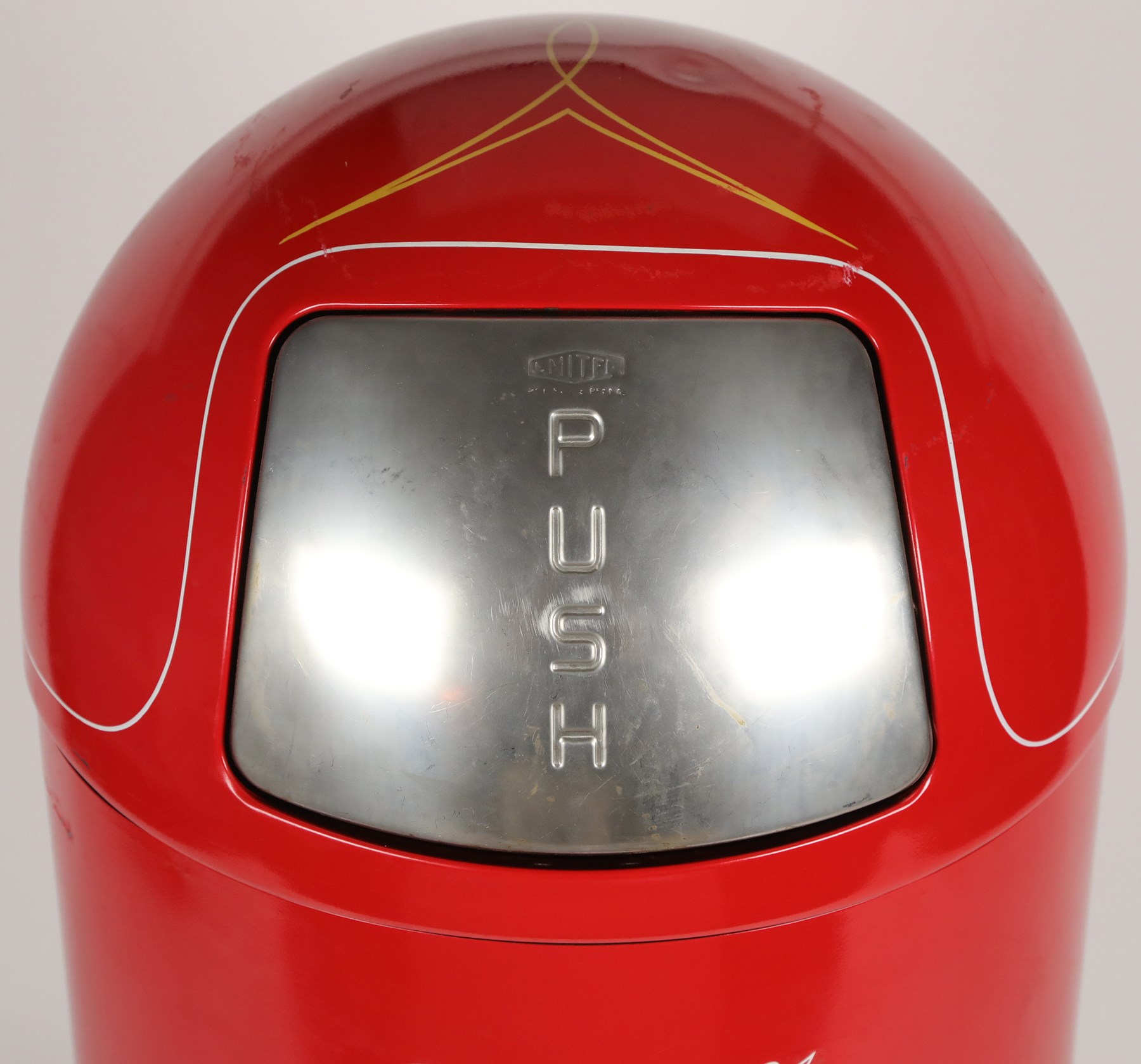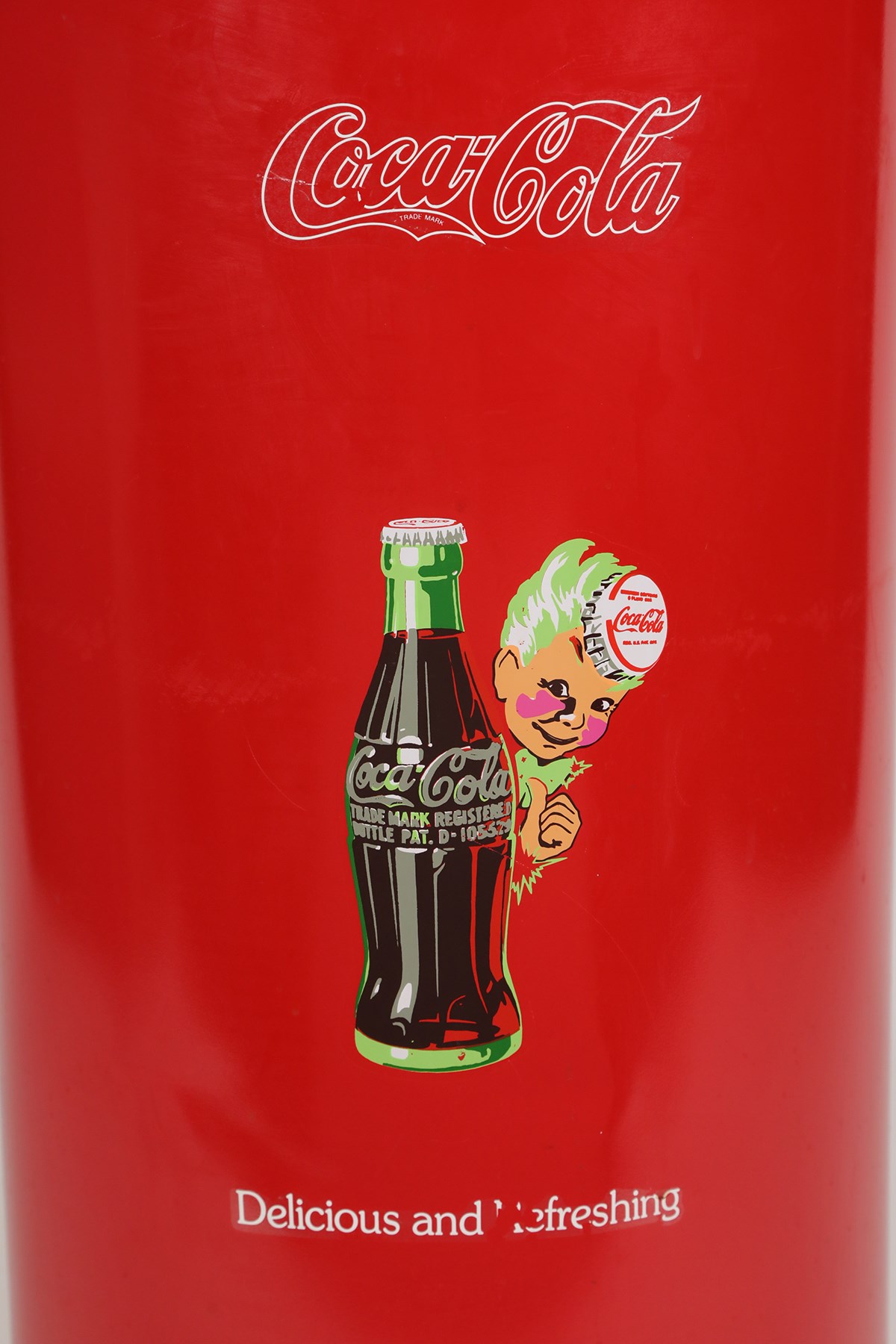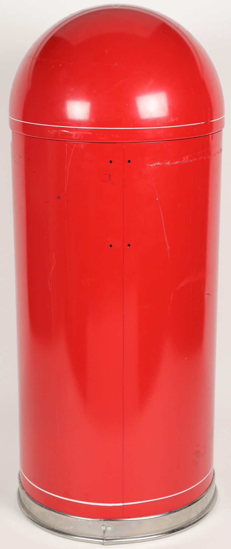 The offered trash can actually pops some good eye appeal. Mostly in Coca-Cola red, the offered can is anything but a typically drab garbage receptacle. On the front, the can reads "Coca-Cola" in its trademarked Spencerian script. There is an approximately 8" colorful Coca-Cola bottle image on front as well as an appealing, stylized image of what could be a smiling, drug store soda jerk. The trash can is really two cans in one. The outer colorful can encloses an inner, silver metallic can that actually holds the trash, while the outer can serves as a radiant Coca-Cola advertisement. The outer can has a height of approx. 36" and a diameter of approx. 16". The inner can, which can be removed, has a height of about 26.5" and a diameter of 12" at the bottom and 13.75" at the top. To allow deposits of trash, there is a working, silver-colored, swinging "door" in fine condition The outer can shows some use. There are scratch marks, some over 12" in length, and there is paint loss at various places, some abrasions, some paint repairs and small stains. The aforementioned imperfections do not substantially affect the visual appeal of the can, as the defects essentially show the can as used, but not to the extent of lessening its colorful appeal. The Coca-Cola trash can, including its inner can, weighs 18 pounds. The can would enhance any sports collection and be a fun addition to any man cave.