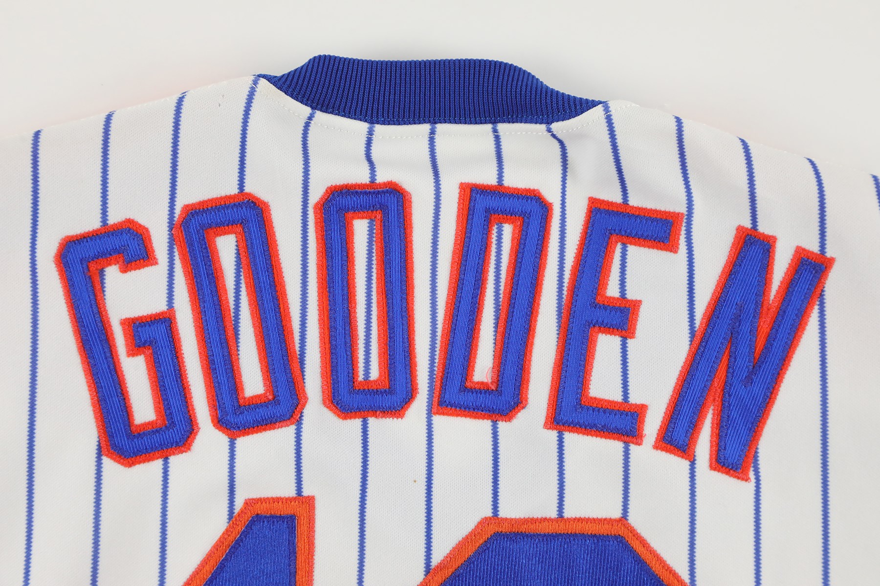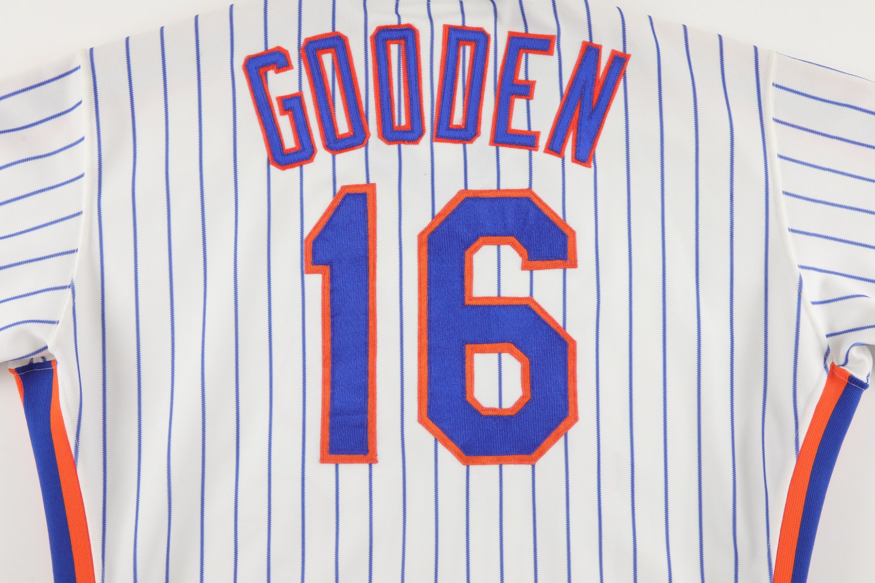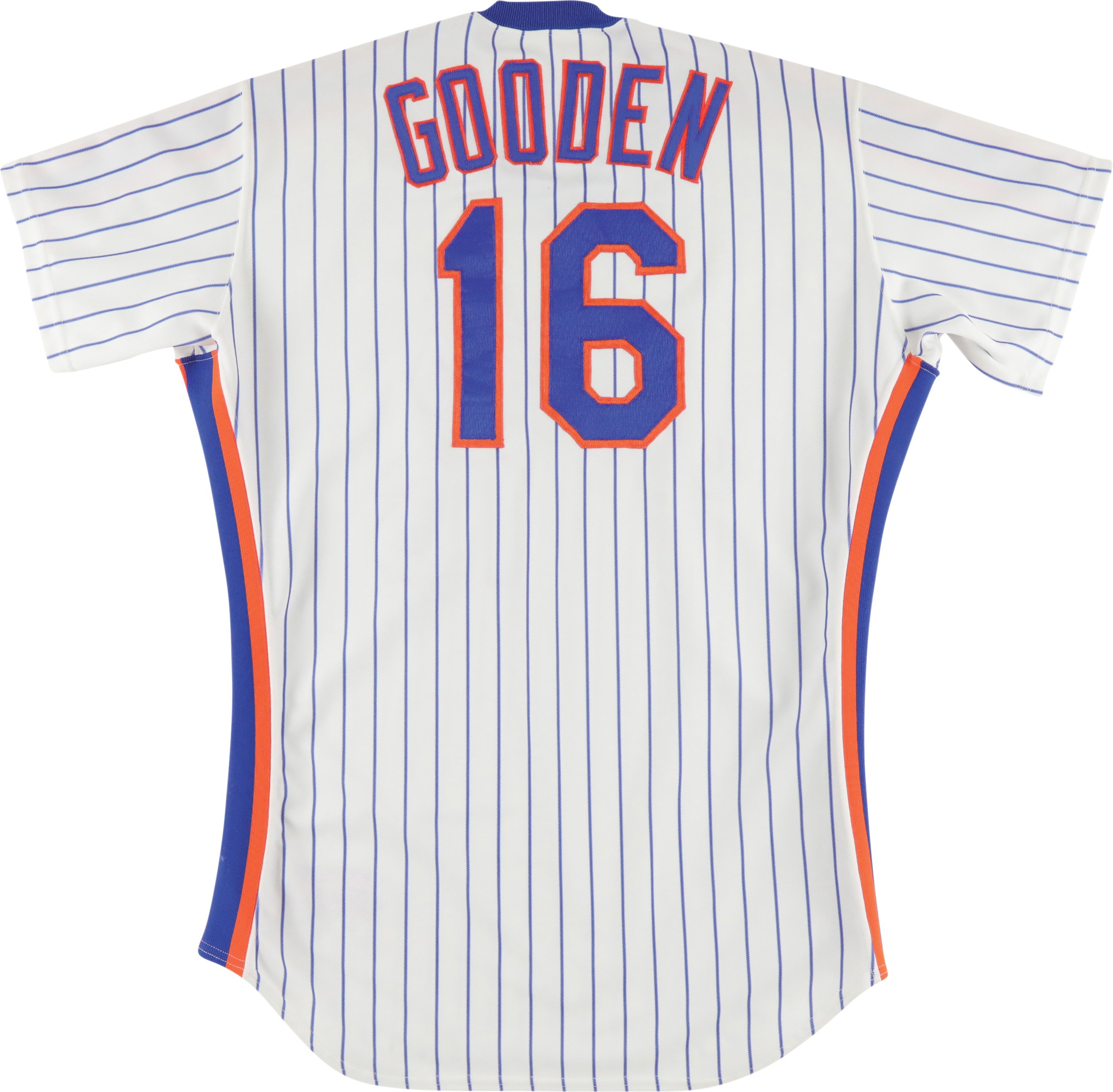 New York Mets home jersey worn by pitcher Dwight Gooden during the 1987 season. The white knit pinstripe jersey is lettered "Mets" across the front and features the number "16" on the left breast and reverse. The name "Gooden" is lettered on the reverse, directly above the number. Located on the interior left front tail are a "Rawlings 44" label, a flag tag reading "Set 2 1987," and tag reading ""2 Inch Extra Length." Below the manufacturer's tag is a white strip tag bearing  the year, set number, and uniform number: "87 2 16." The jersey is original as issued and displays moderate wear.