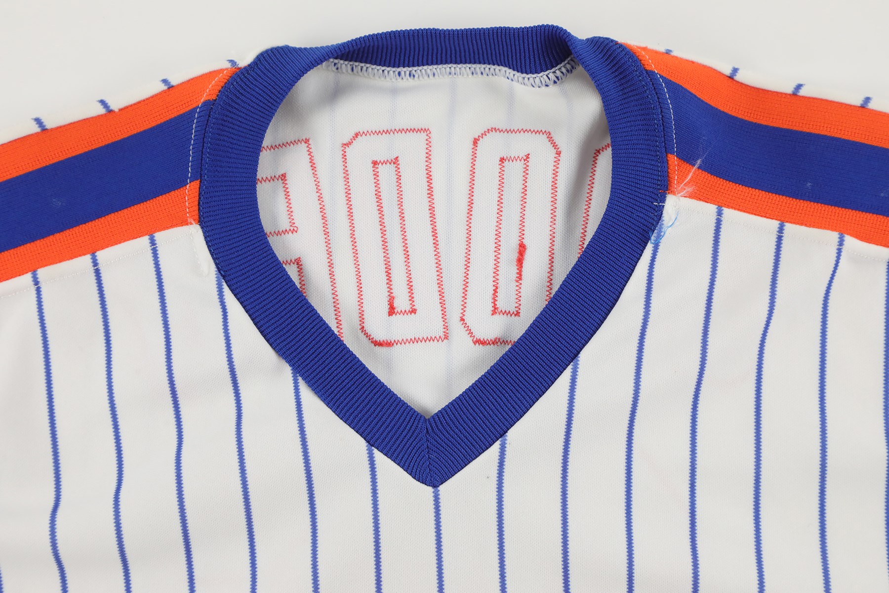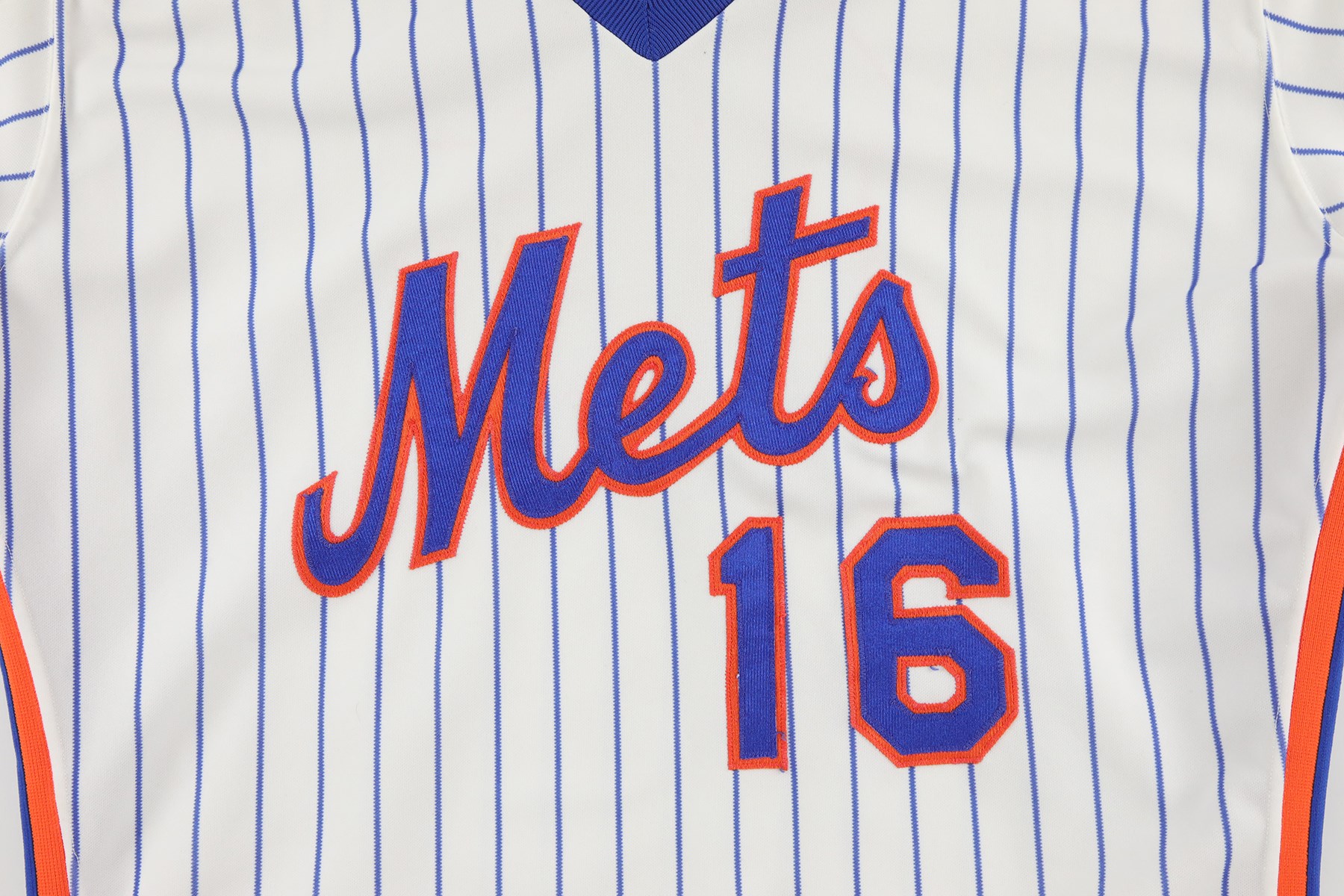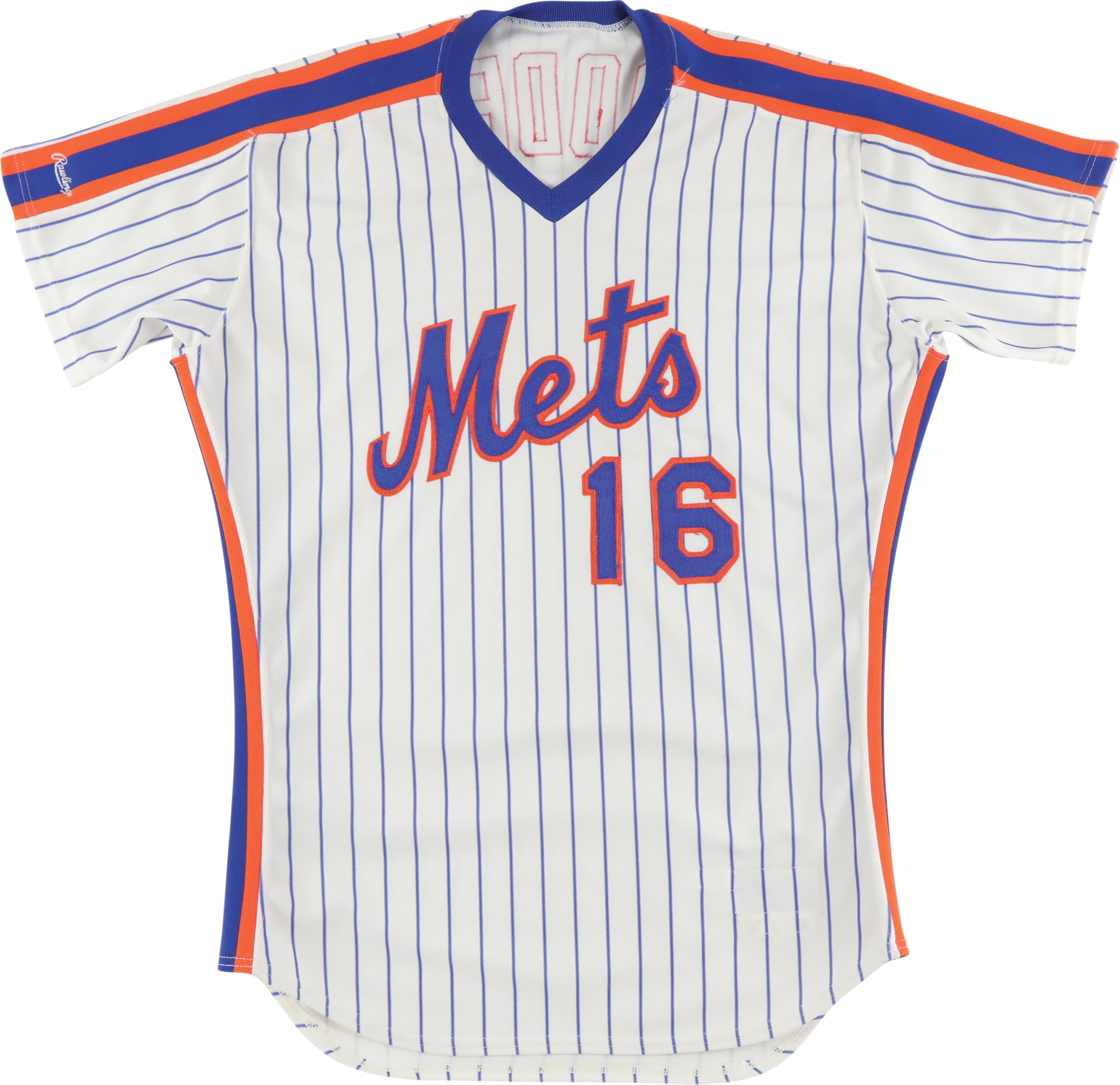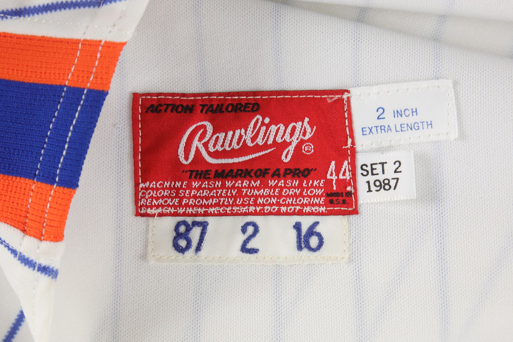 New York Mets home jersey worn by pitcher Dwight Gooden during the 1987 season. The white knit pinstripe jersey is lettered "Mets" across the front and features the number "16" on the left breast and reverse. The name "Gooden" is lettered on the reverse, directly above the number. Located on the interior left front tail are a "Rawlings 44" label, a flag tag reading "Set 2 1987," and tag reading ""2 Inch Extra Length." Below the manufacturer's tag is a white strip tag bearing  the year, set number, and uniform number: "87 2 16." The jersey is original as issued and displays moderate wear.