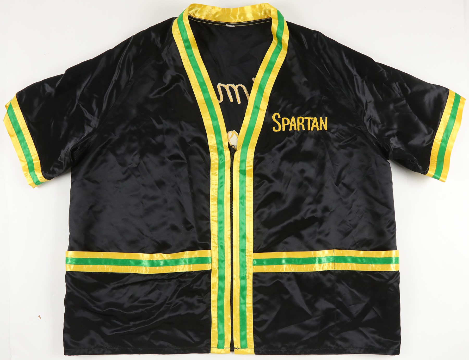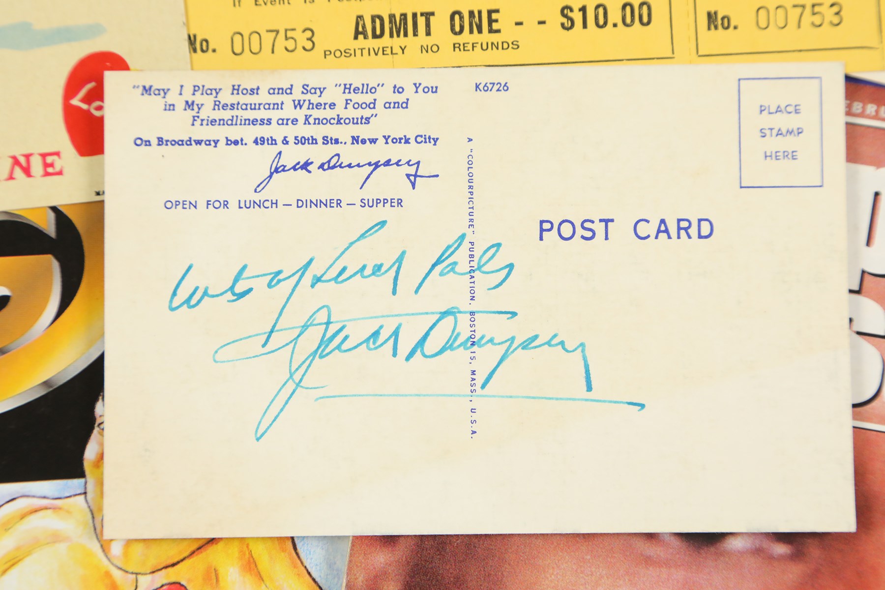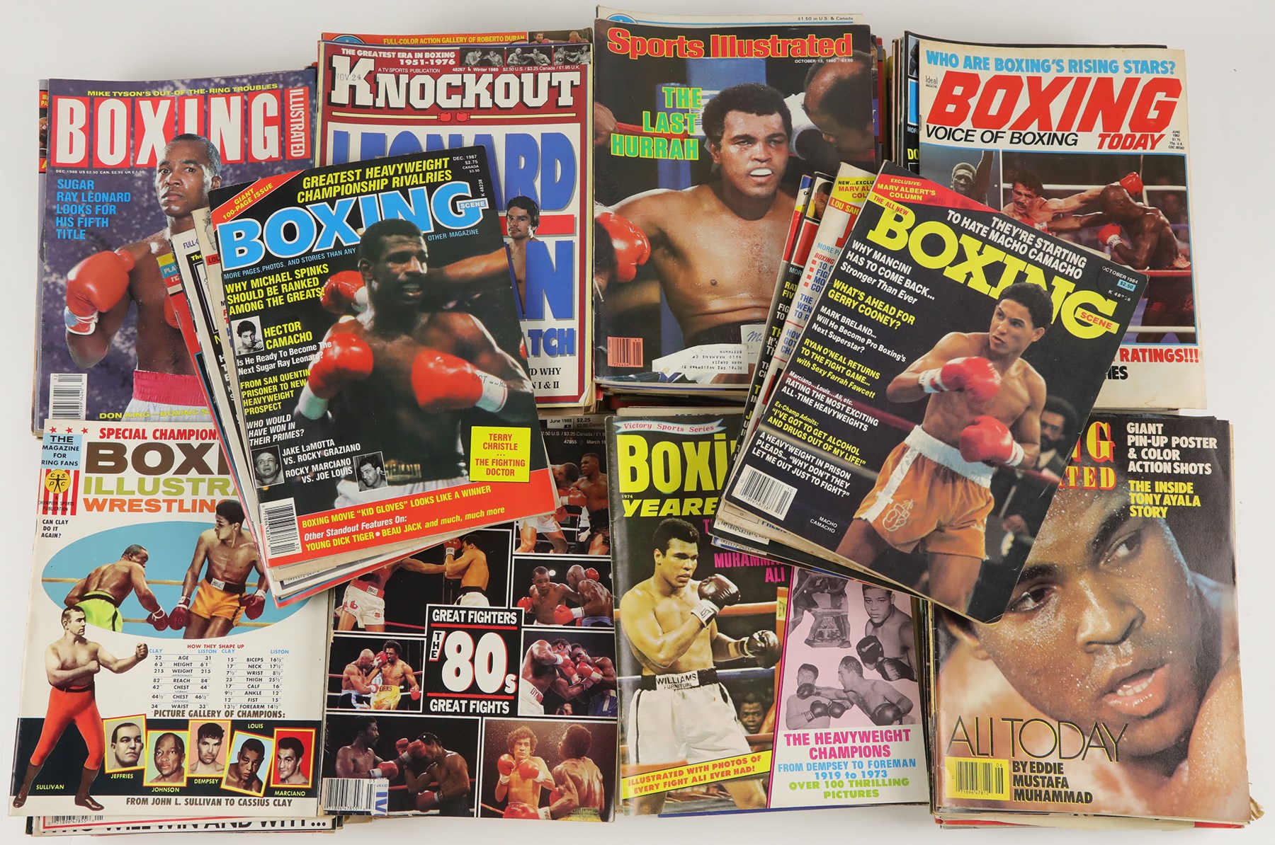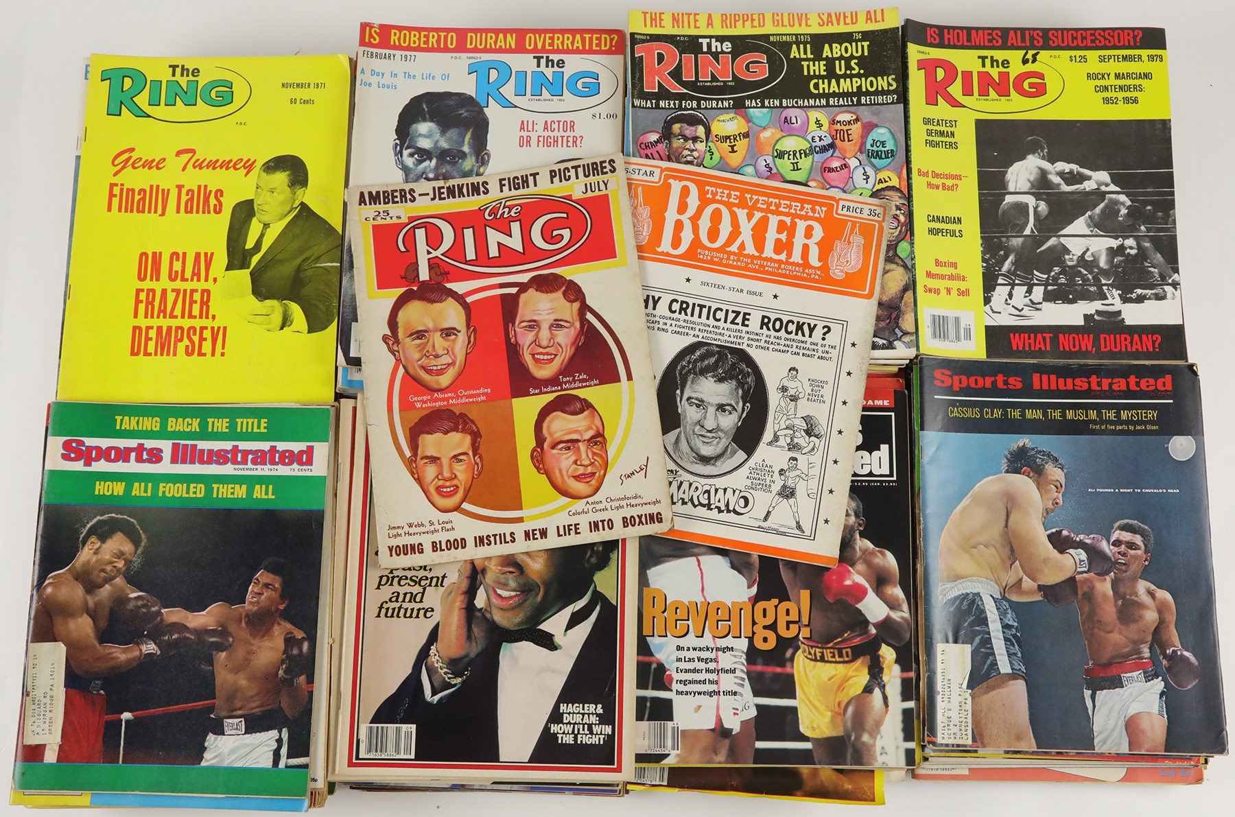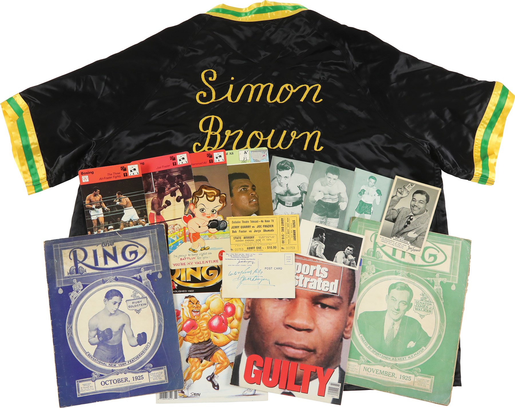 This publication collection, numbering approximately 500, consists mainly of boxing magazines spanning the years 1970 to 2000, plus three 1920s Ring magazines and two 1940s-era magazines. Included are Sports Illustrated issues featuring boxers on the cover. The remainder of the collection consists of several miscellaneous boxing-related items, including a "Simon Brown" cornermen's jacket, a Tyson/Holyfield II boxing poster (22x17"), three boxing Exhibit cards (LaMotta, Basilio, and DeMarco), a Joe Louis Chesterfield promotional card, a vintage boxing Valentines Day card, a closed-circuit television ticket for the 1974 fight between Joe Frazier and Jerry Quarry, and a Jack Dempsey restaurant postcard (the postcard is signed by Dempsey on the reverse, but the signature has not been certified by any third-party authentication company). The condition ranges from Poor to Excellent, averaging Good.