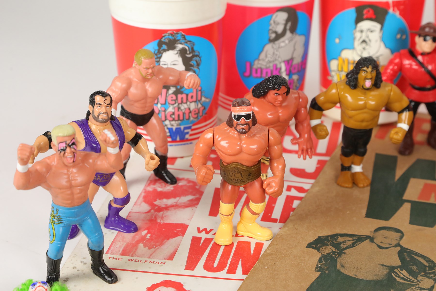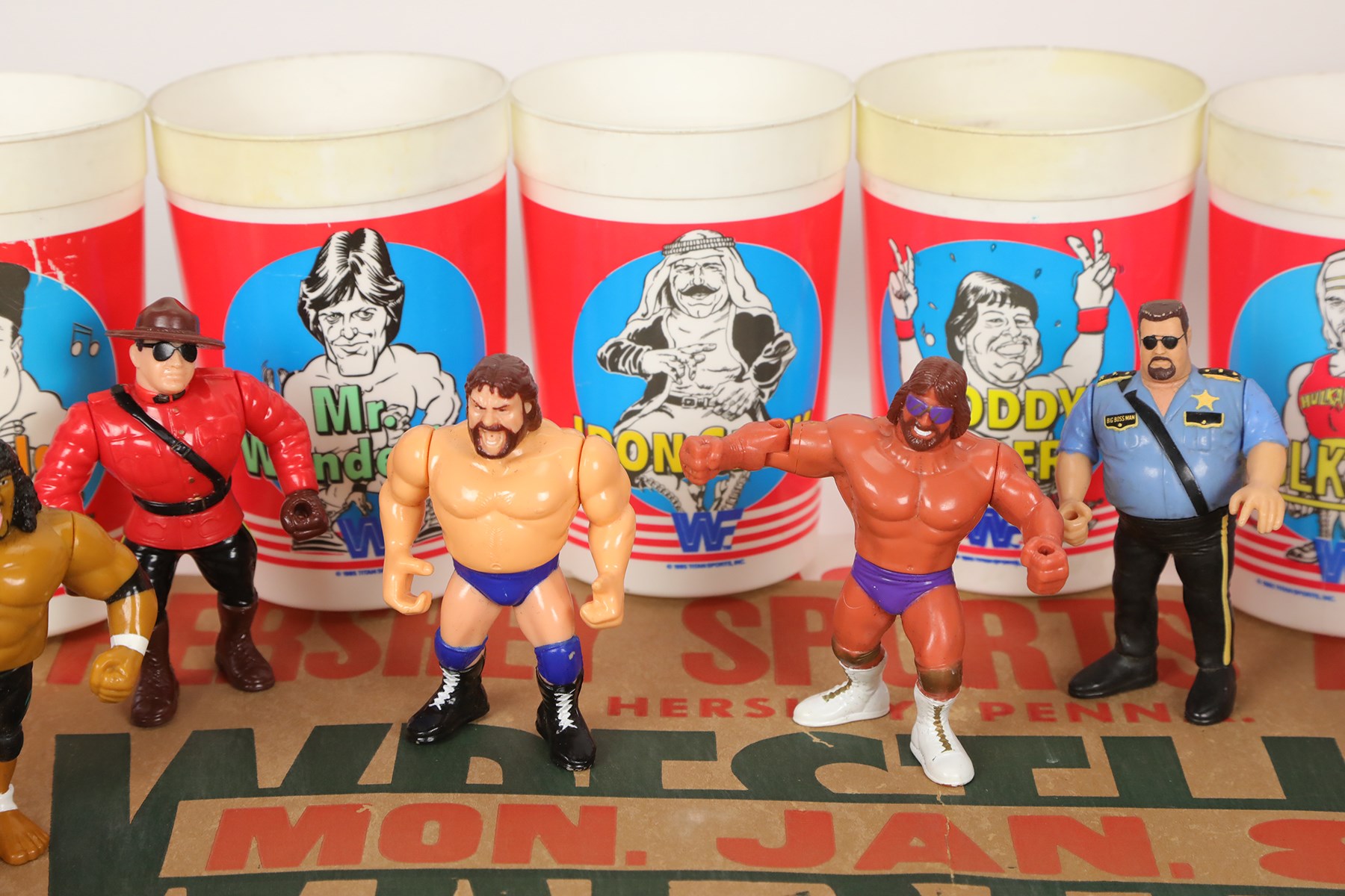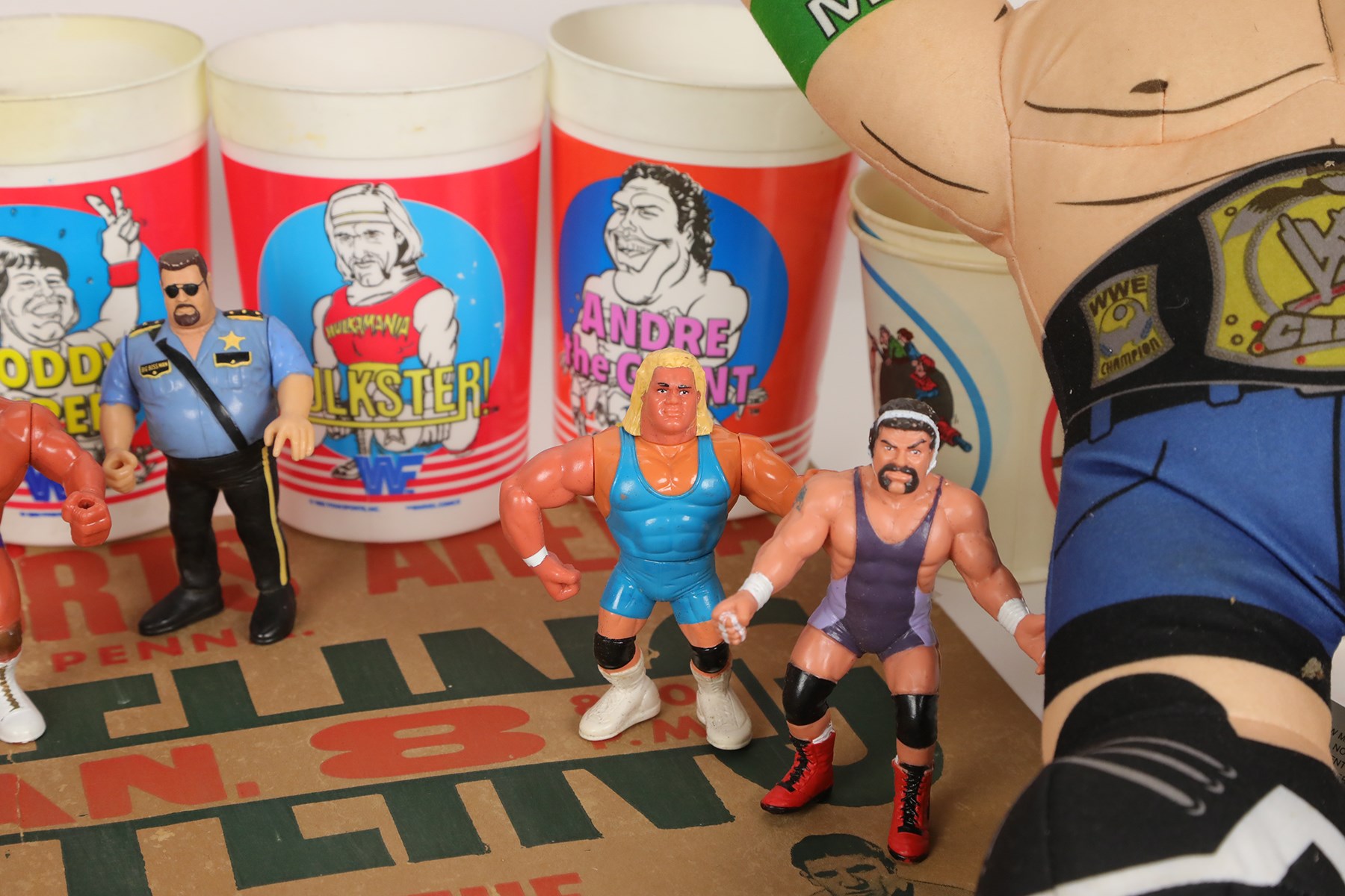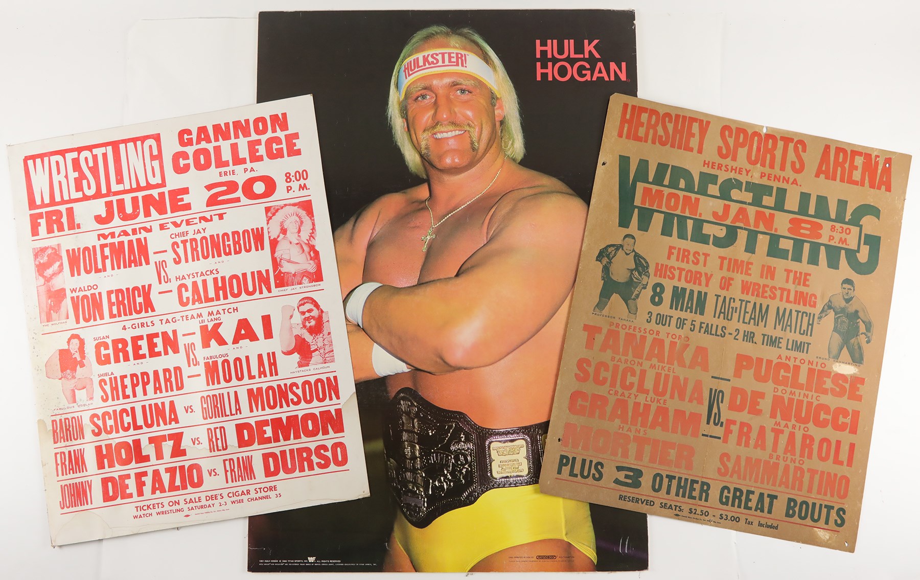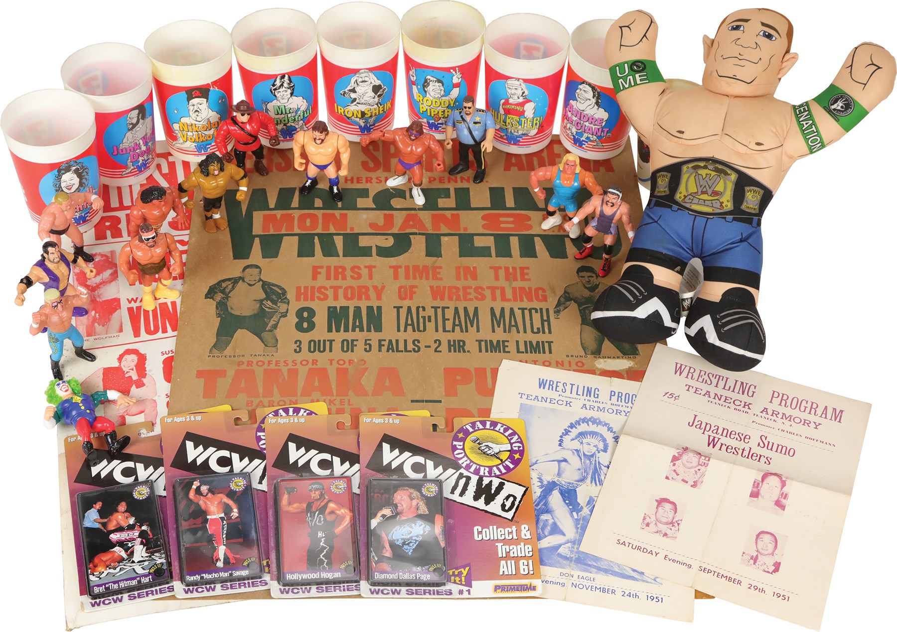 Strong Wrestling memento collection is loaded with some real rarities Brother!! Highlights include Hulk Hogan mounted poster (27x39"); Bruno Sammartino poster (22x28"); Chief Jay Strongbow poster (22x28"); WWF Wrestling proof w/Hulk Hogan (21x26"); wrestling doll; 7-Eleven Big Gulp cups (11); WCW/NWP Talking Portrait (4); box of Hasbro wrestling figures (30+); Mostly 1970s-90s Wrestling Publications (250+); and WWF & WCW Photocard Albums w/cards (2). The size and/or weight of this lot will necessitate an increased shipping charge.