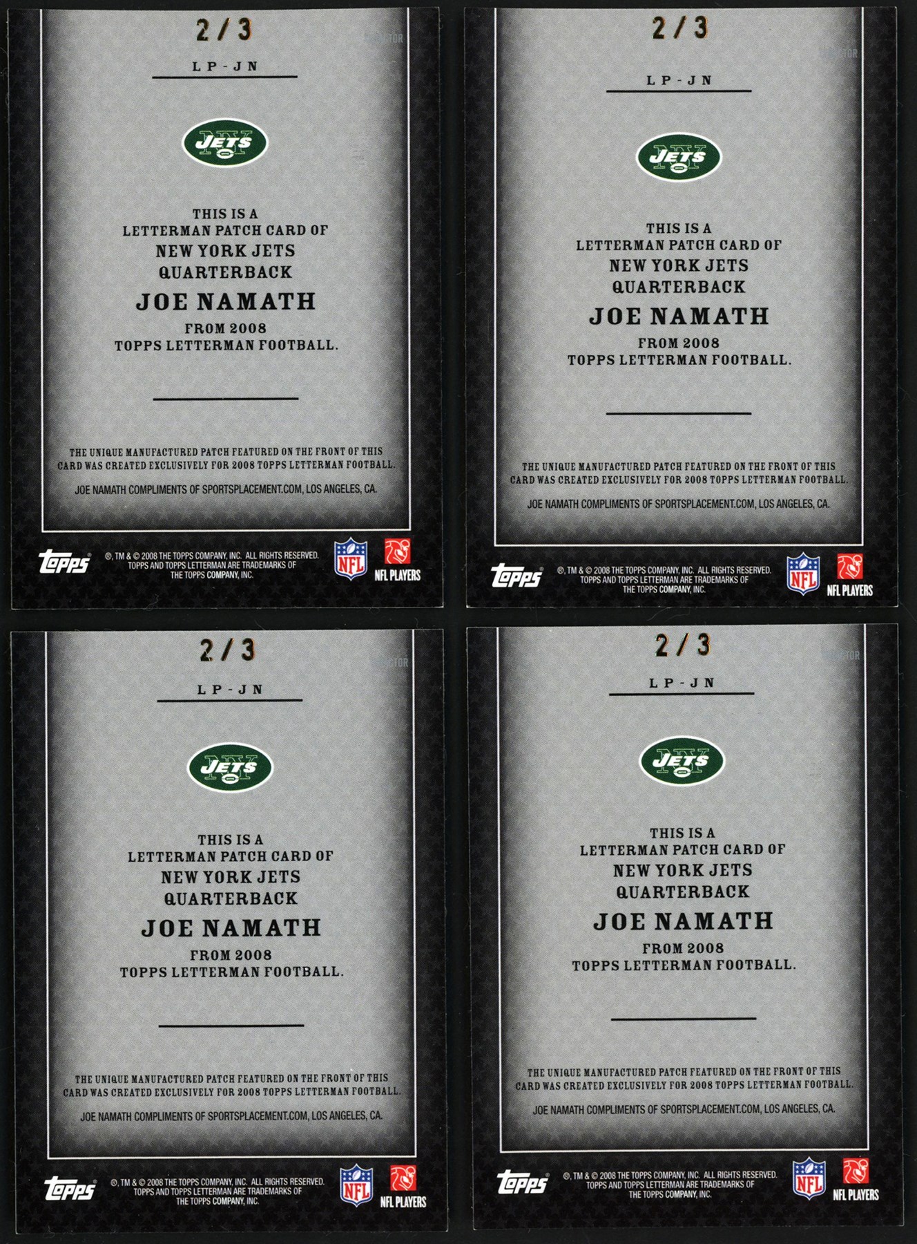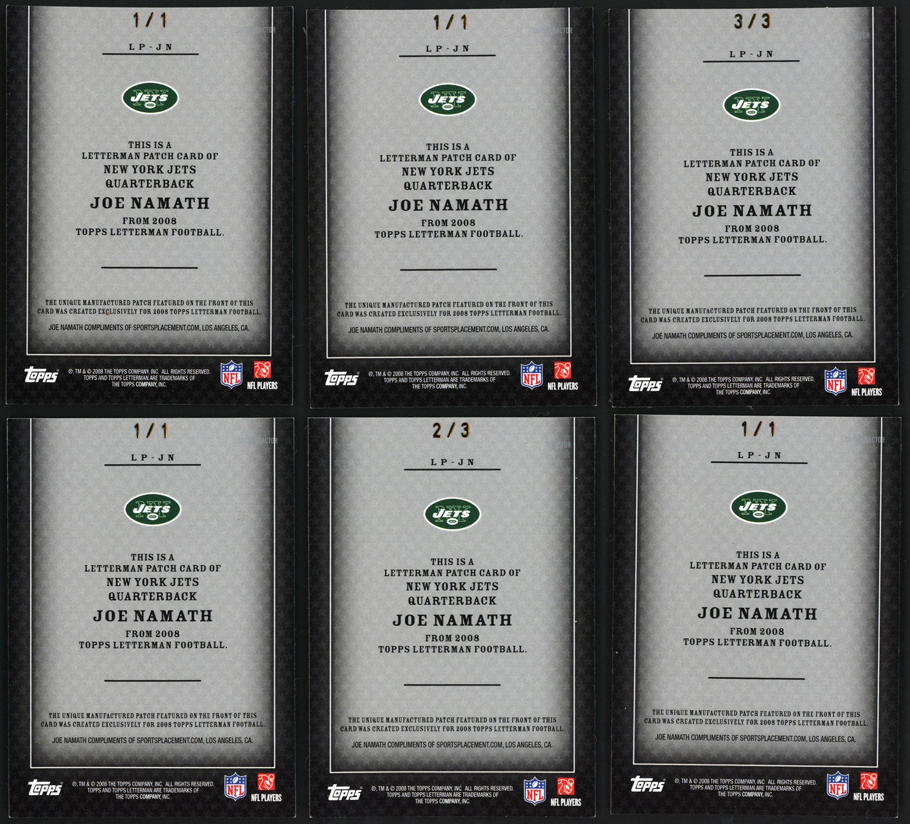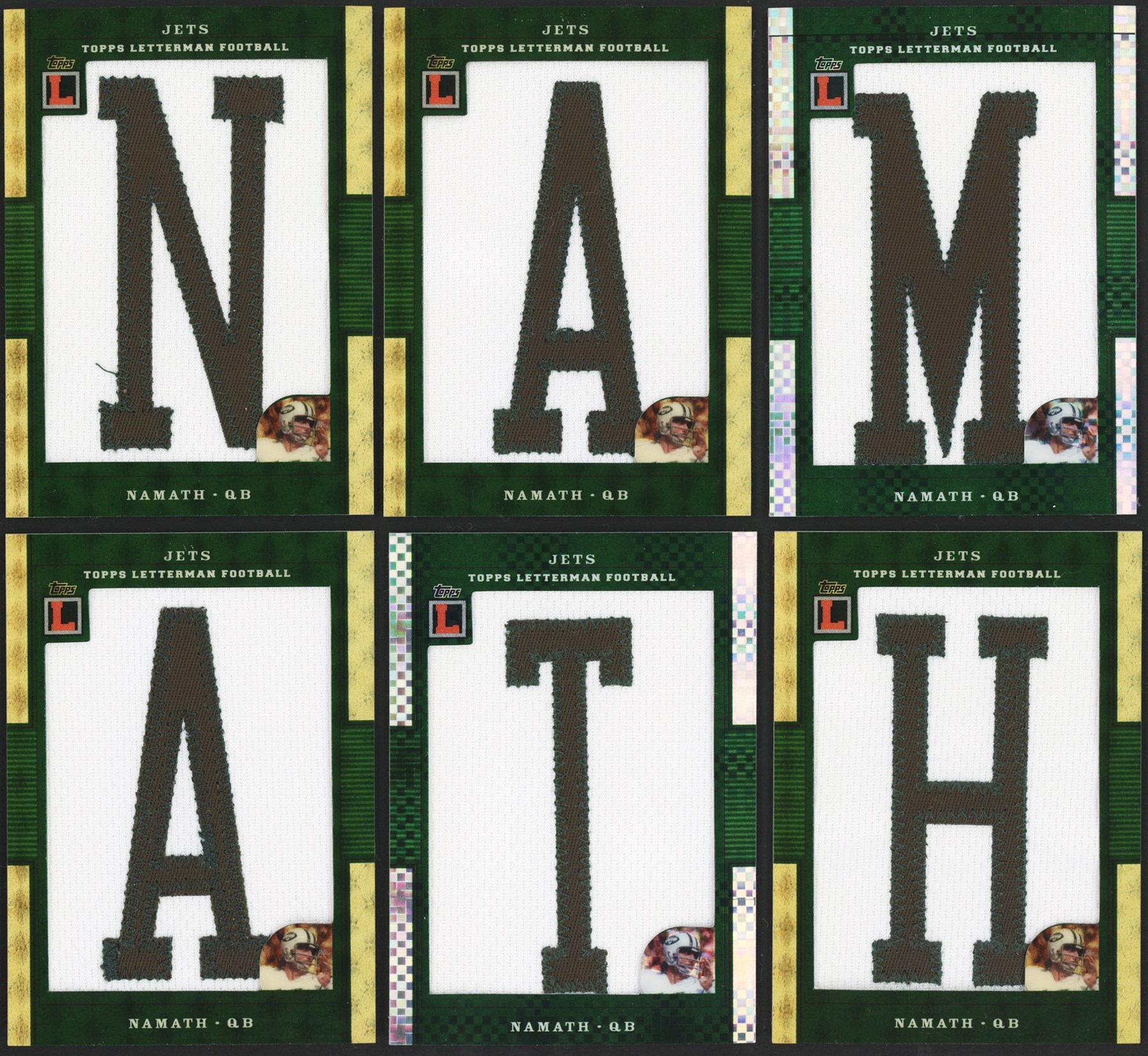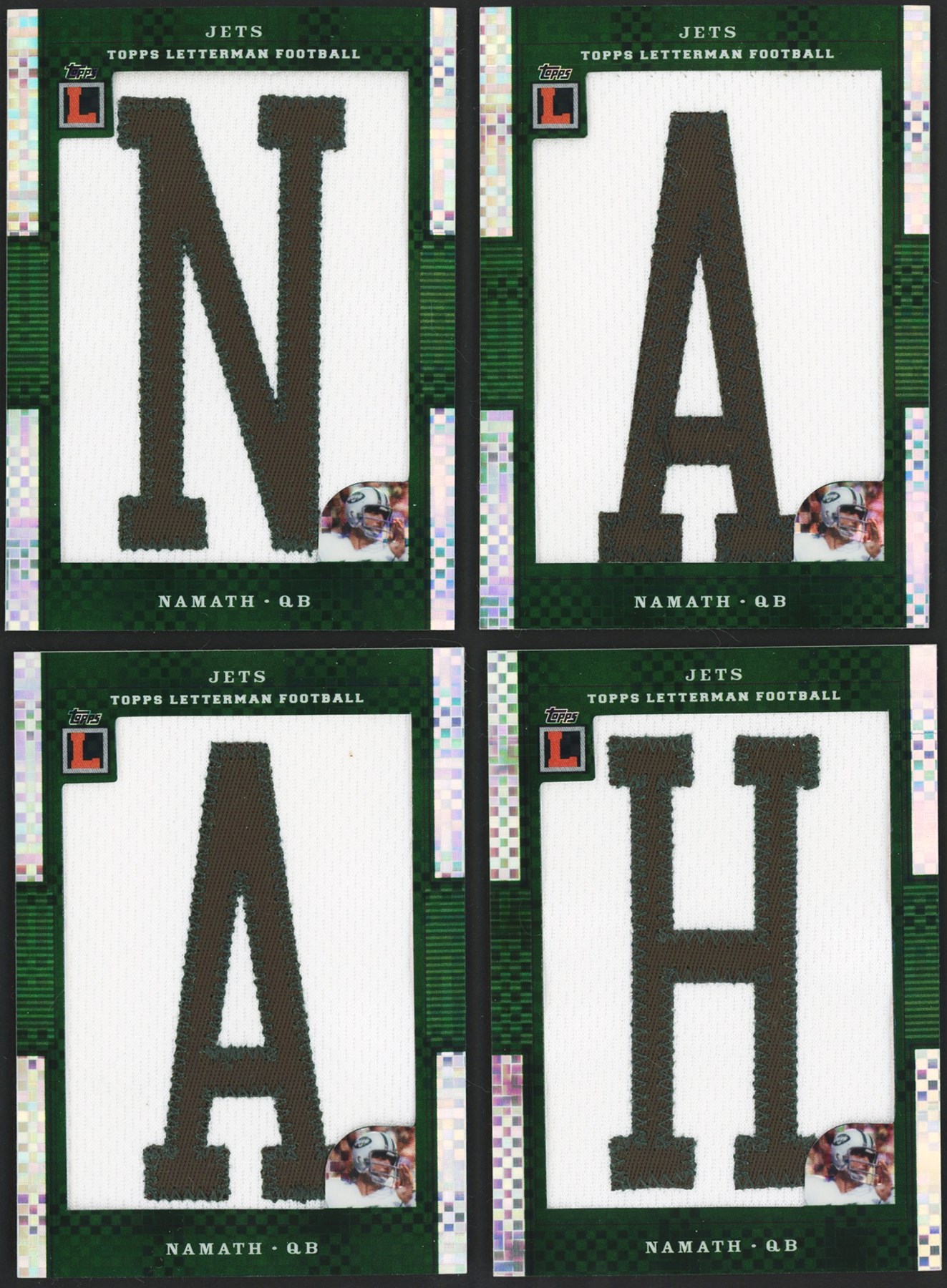 This lot features a collection of (10) 2008 Topps Letterman Joe Namath Nameplate Patch cards. Highlights include (4) Superfractor #1/1s with "N"; "A"; "A"; and "H"; and (6) X-Fractors #/3 with: "N"; "A"; "M"; "A'; "T"; "H".
