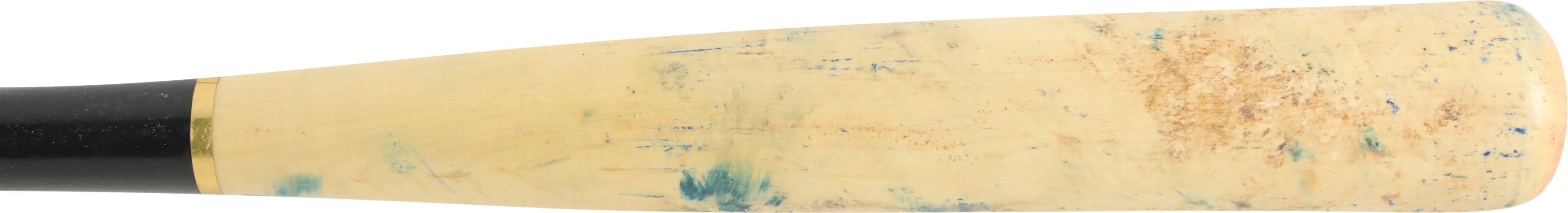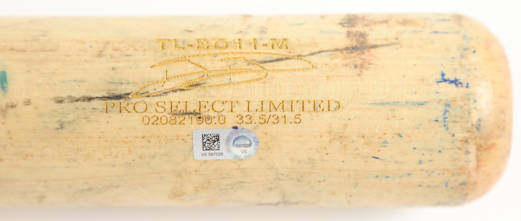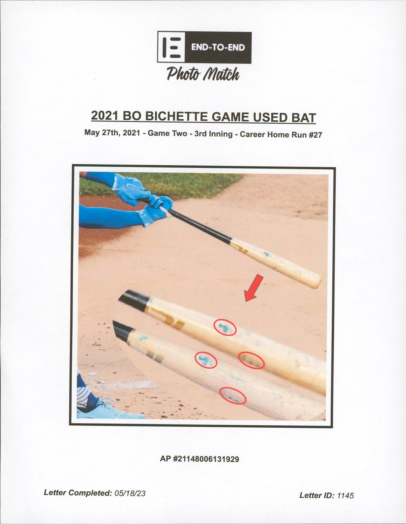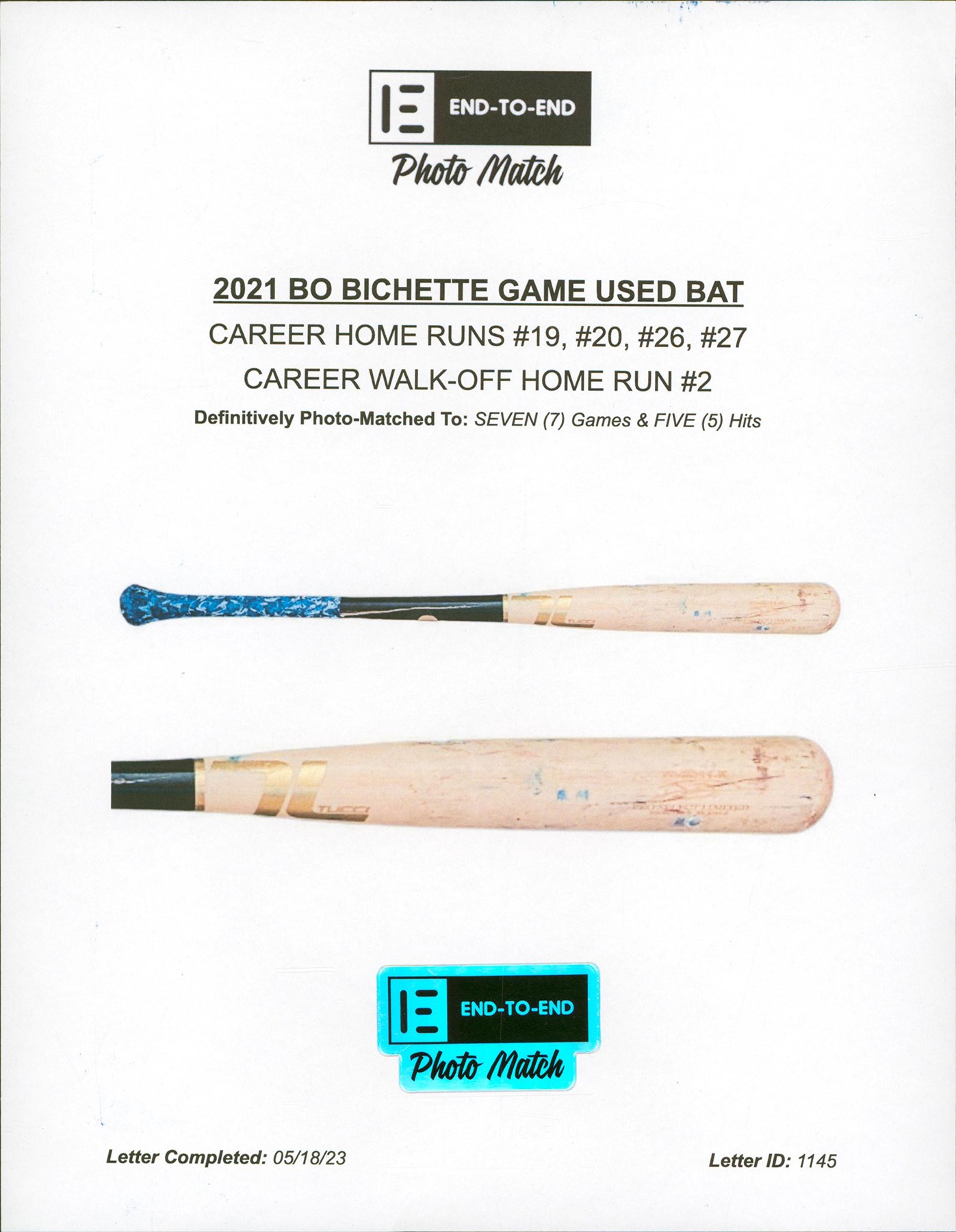 2021 Bo Bichette game used bat used to hit career home runs, 19, 20, 26, and 27. Bichette used this tan and black 33.5", 31.5 oz. Tucci, TL-B011-M model bat for seven games. During the games, Bichette stepped up to the plate 29 times and had 8 hits, including 4 home runs. He hit two home runs on April 14, 2021 (19th and 20th of career), and he hit two more home runs (26th and 27th of career) on May 27, 2021. The 20th home run was also the second career walk off home run of Bichette's career. All of the home runs have been photo-matched, and a full LOA from End-To-End is included. In addition, a MLB hologram sticker (#VS597026) is attached to the bat. The bat shows heavy signs of use and the handle is cracked. The handle of the bat is custom taped, and number 11 is stamped on the knob
