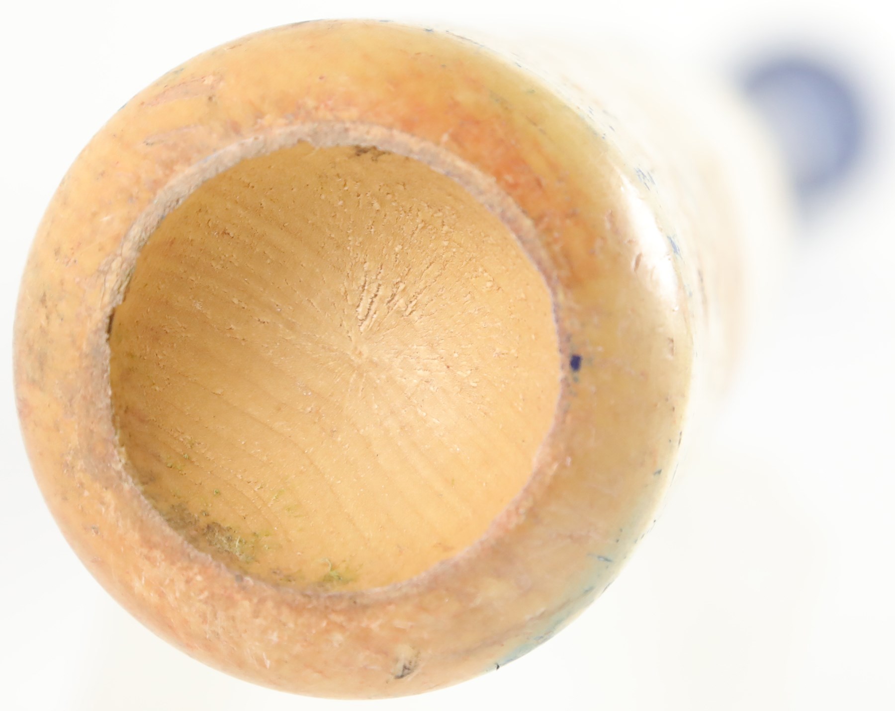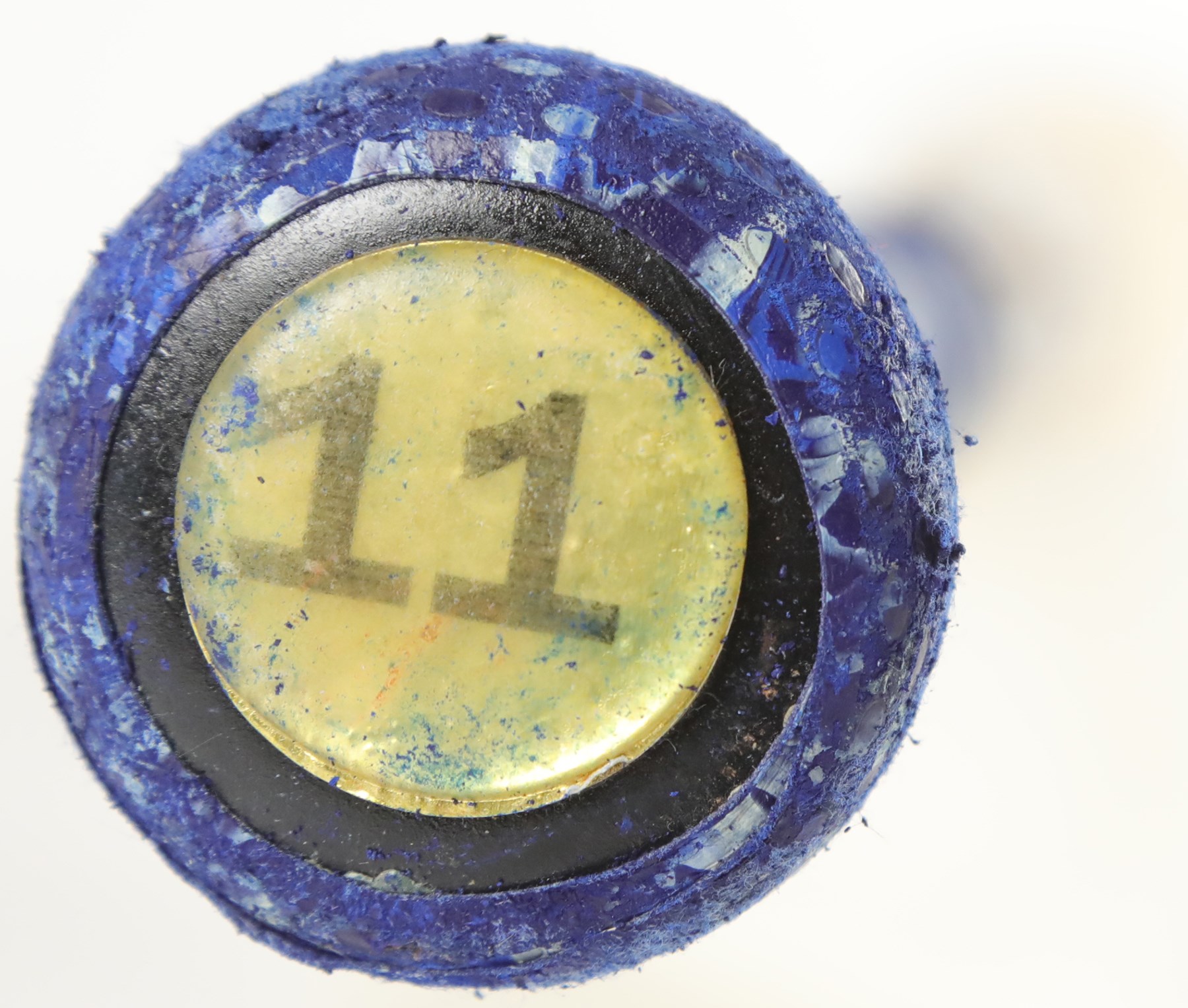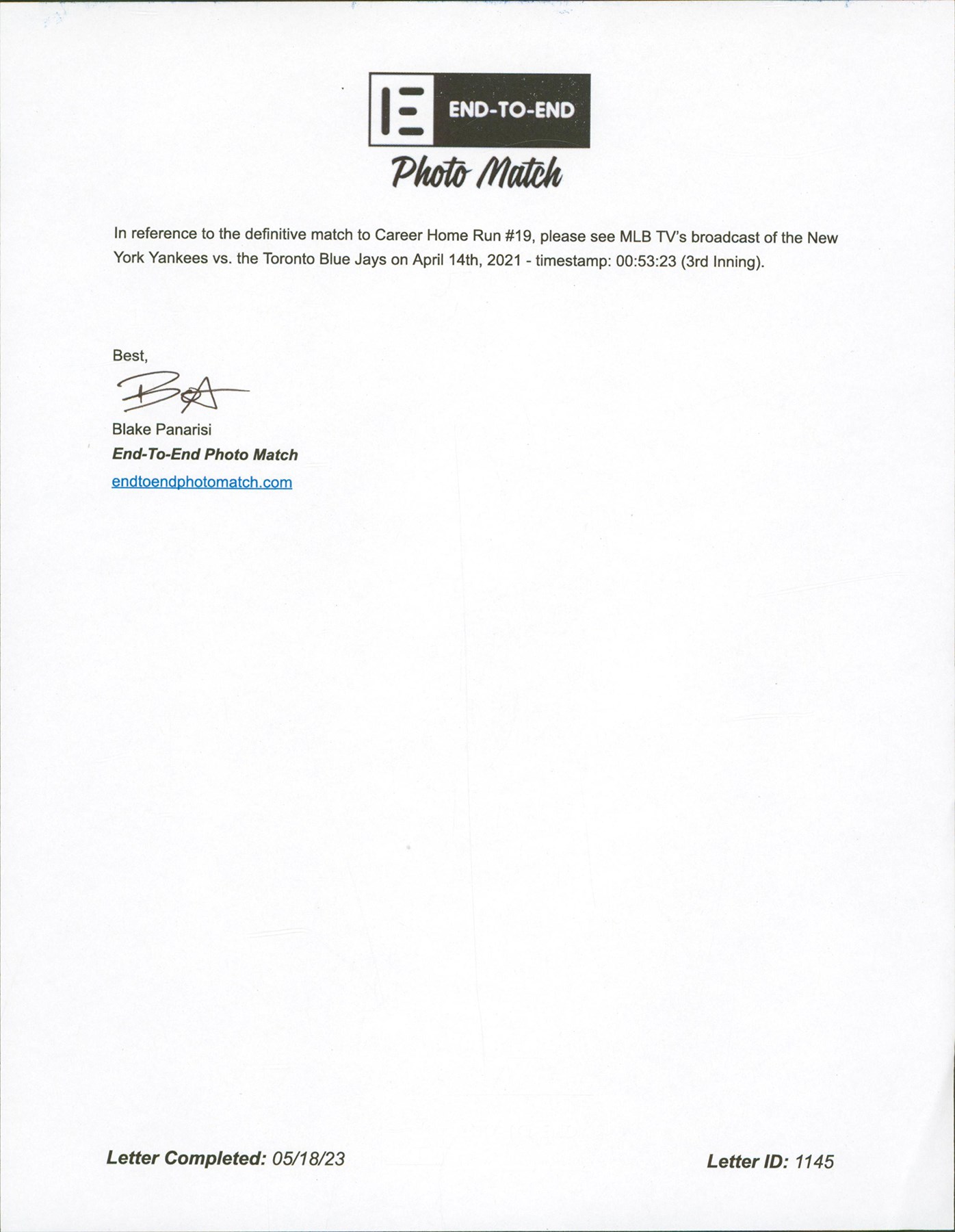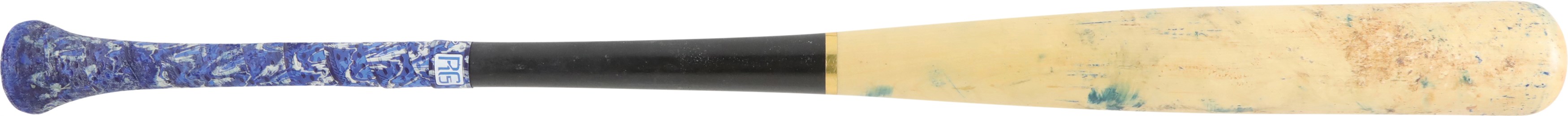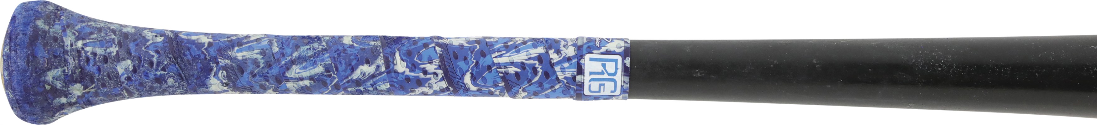 2021 Bo Bichette game used bat used to hit career home runs, 19, 20, 26, and 27. Bichette used this tan and black 33.5", 31.5 oz. Tucci, TL-B011-M model bat for seven games. During the games, Bichette stepped up to the plate 29 times and had 8 hits, including 4 home runs. He hit two home runs on April 14, 2021 (19th and 20th of career), and he hit two more home runs (26th and 27th of career) on May 27, 2021. The 20th home run was also the second career walk off home run of Bichette's career. All of the home runs have been photo-matched, and a full LOA from End-To-End is included. In addition, a MLB hologram sticker (#VS597026) is attached to the bat. The bat shows heavy signs of use and the handle is cracked. The handle of the bat is custom taped, and number 11 is stamped on the knob