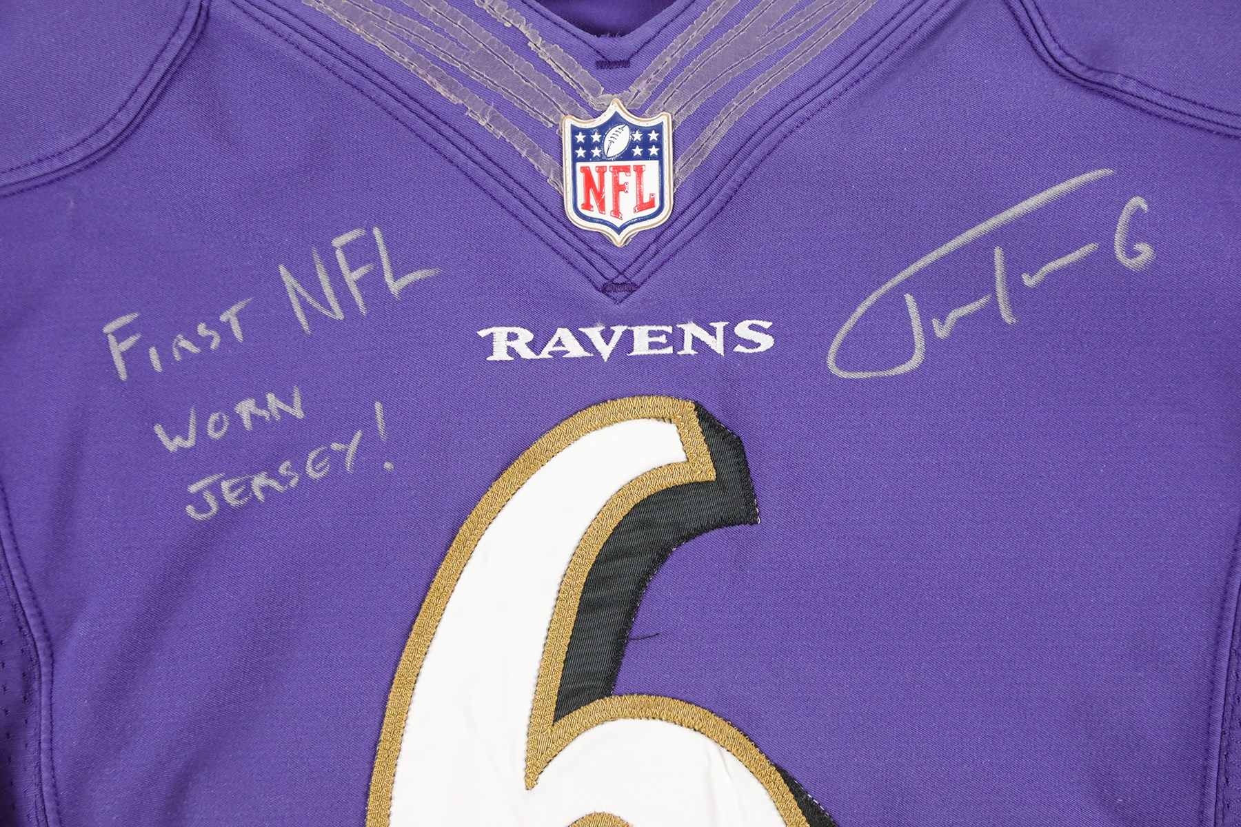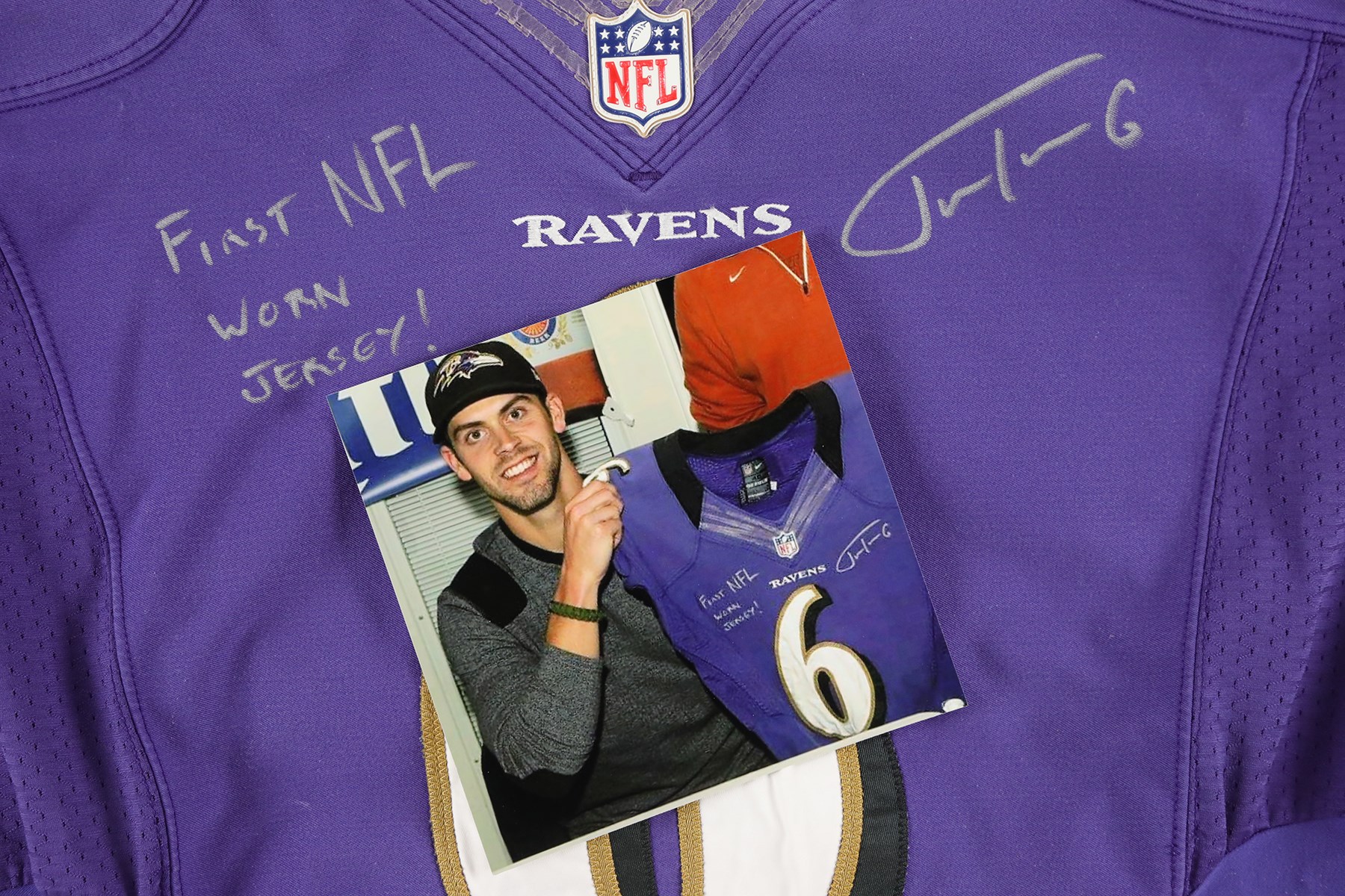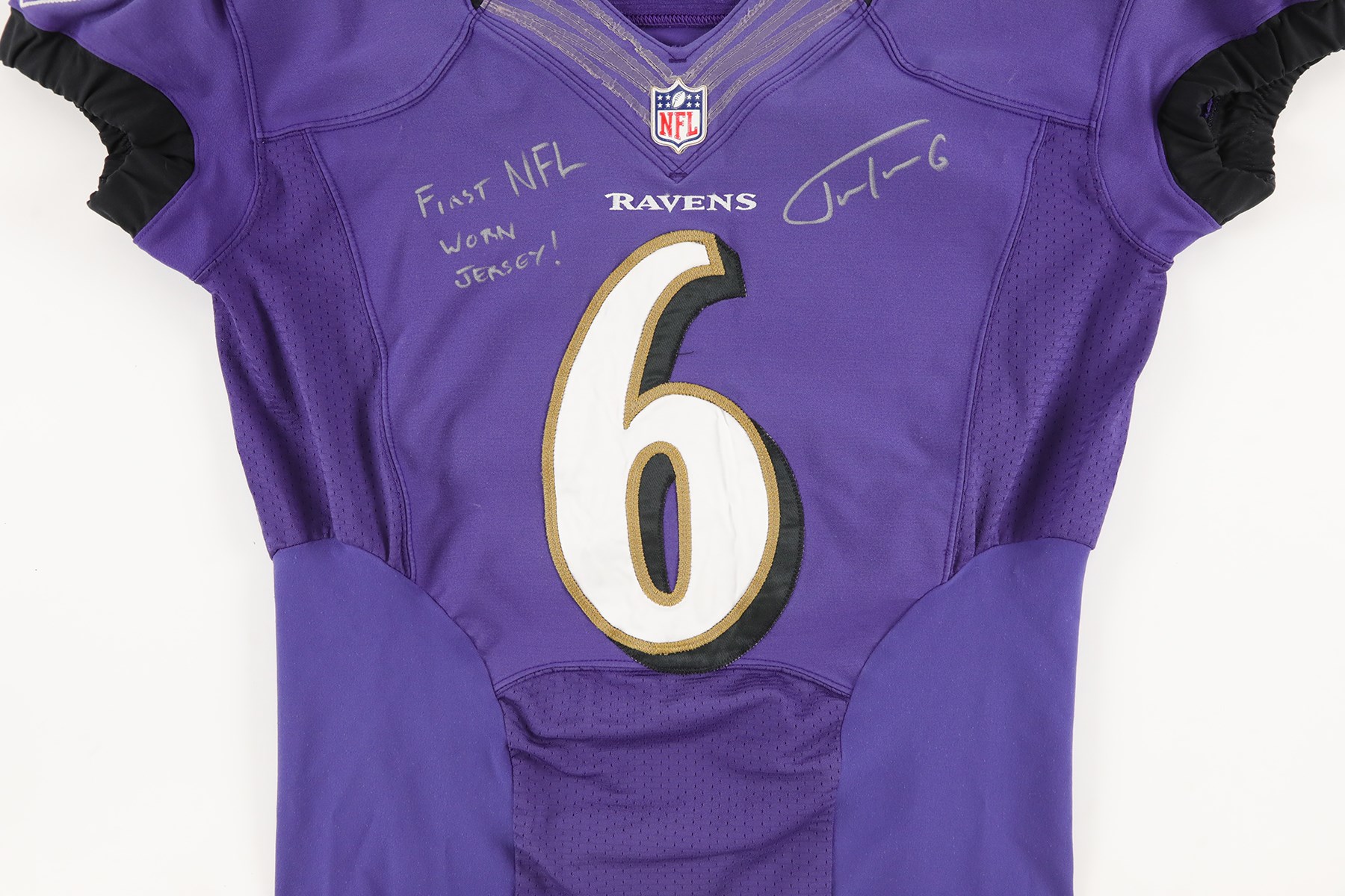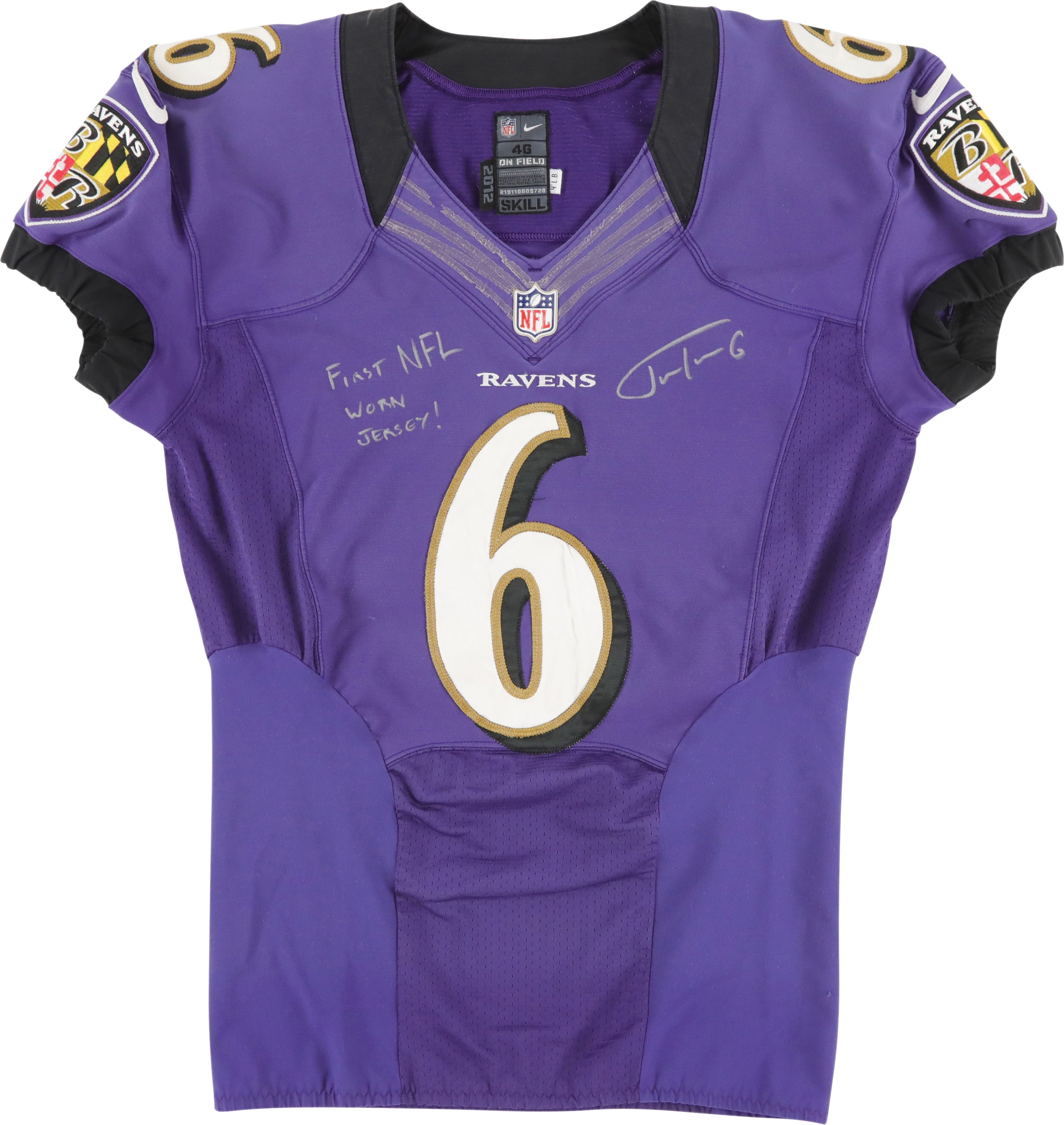 2012 Justin Tucker Baltimore Ravens 1st NFL career worn jersey. Before he was kicking his way into the record books, Tucker wore this number 6 jersey the first time he stepped into action during a NFL game. He wore this jersey during the 2012 preseason, and later switched to number 9 for the regular season. A size 46 tag is sewn into the inside back collar area of the jersey, and two smaller tags are attached. One reads "2012", and the other reads "4"L.B." Number 6 is sewn to the front, back, and shoulders. On the sleeves is the Ravens shield logo, and Nike swoosh logo. Tucker signed the front of the jersey with a silver Sharpie marker. He also wrote, "FIRST NFL WORN JERSEY!" Tucker played for the Ravens from 2012 to 2024. He holds several NFL records, including kicking a 66-yard field goal, the longest in NFL history. A 6x6" photo of Tucker holding this exact jersey is included.