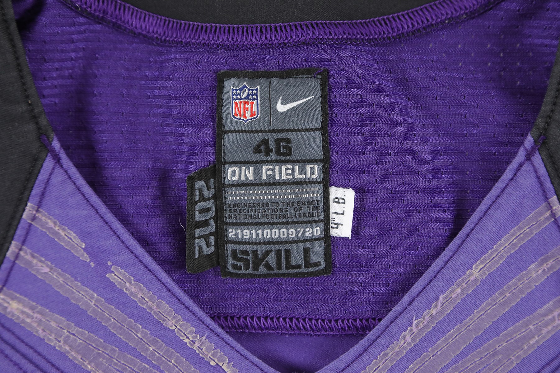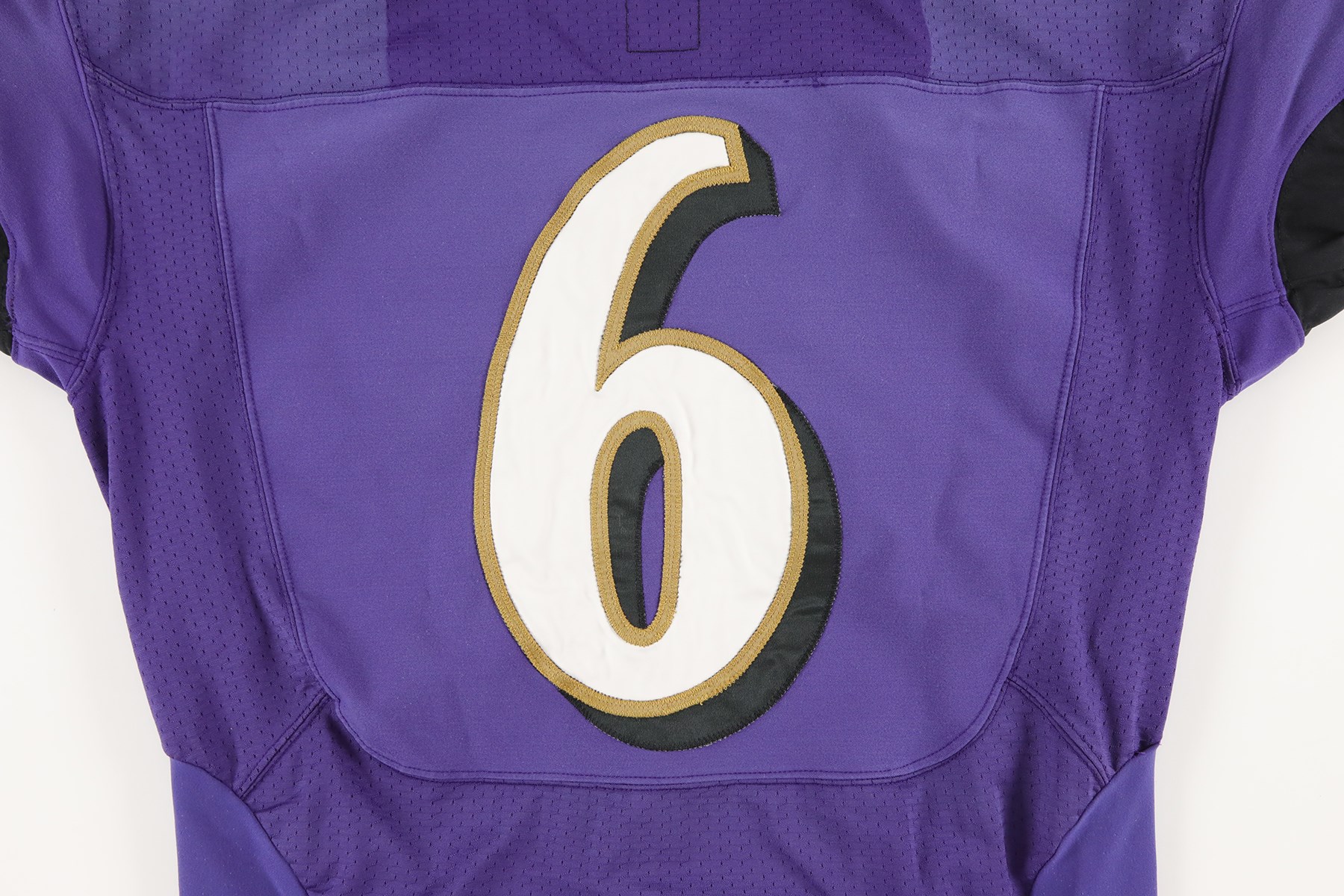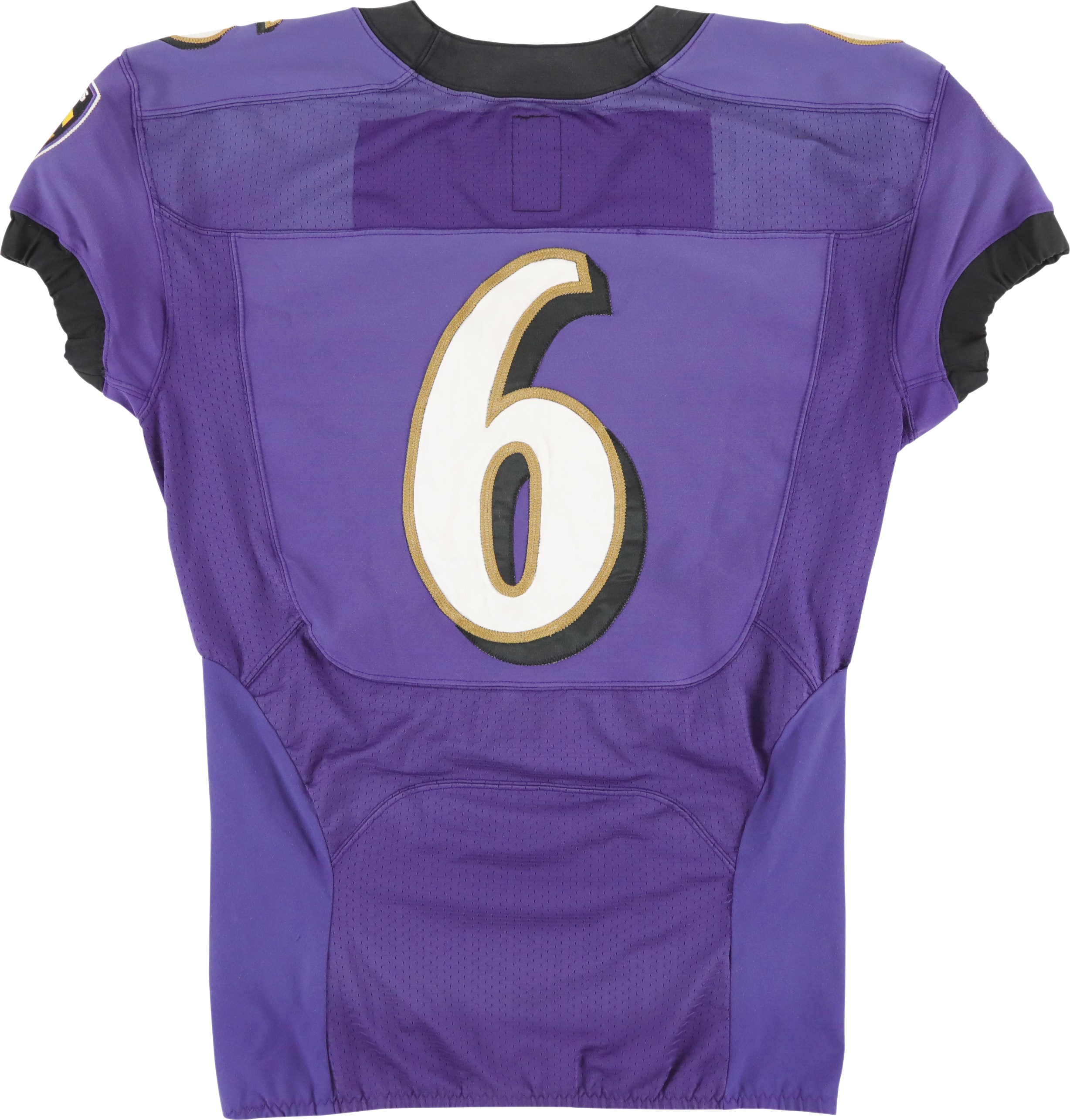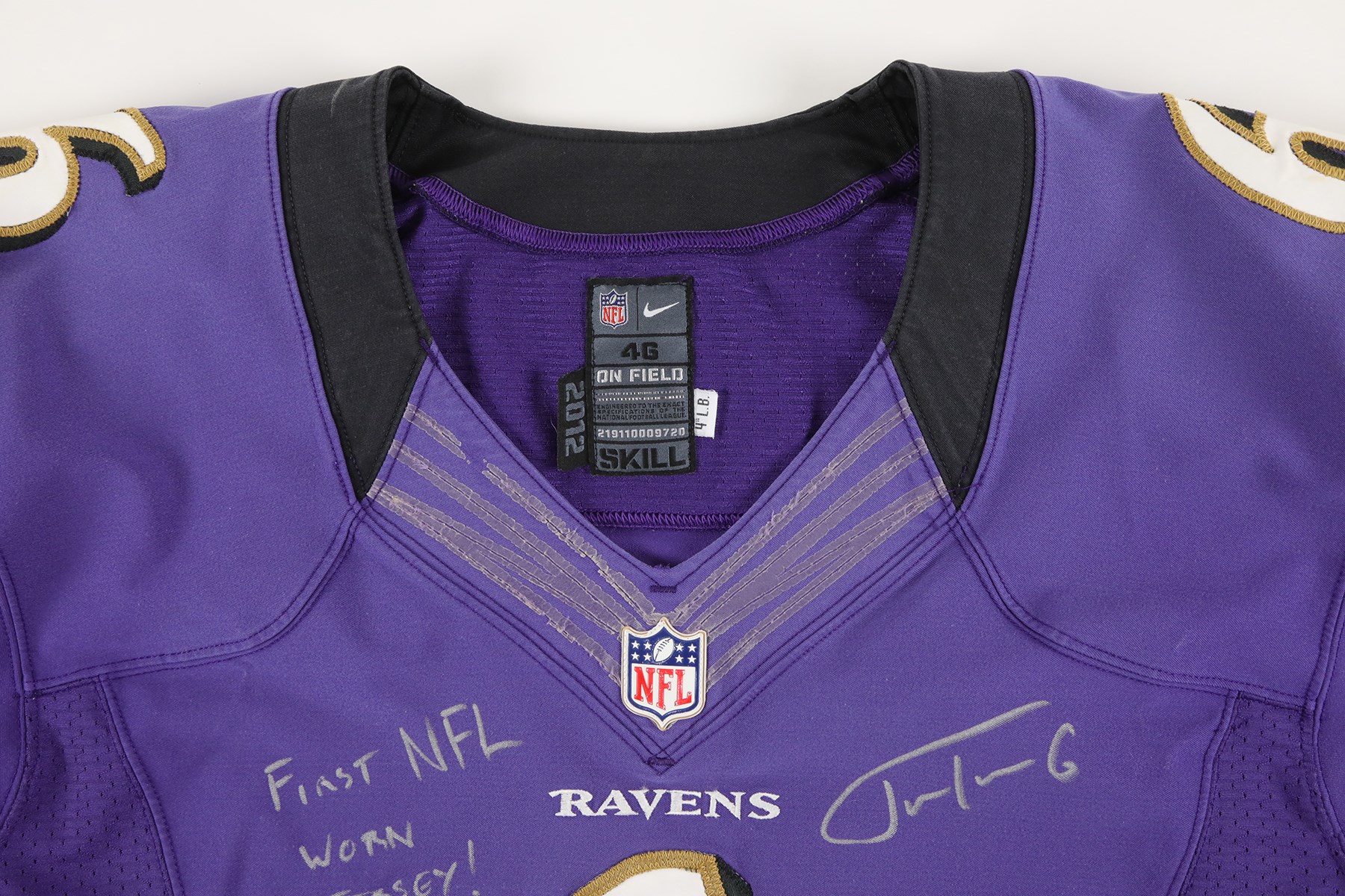 2012 Justin Tucker Baltimore Ravens 1st NFL career worn jersey. Before he was kicking his way into the record books, Tucker wore this number 6 jersey the first time he stepped into action during a NFL game. He wore this jersey during the 2012 preseason, and later switched to number 9 for the regular season. A size 46 tag is sewn into the inside back collar area of the jersey, and two smaller tags are attached. One reads "2012", and the other reads "4"L.B." Number 6 is sewn to the front, back, and shoulders. On the sleeves is the Ravens shield logo, and Nike swoosh logo. Tucker signed the front of the jersey with a silver Sharpie marker. He also wrote, "FIRST NFL WORN JERSEY!" Tucker played for the Ravens from 2012 to 2024. He holds several NFL records, including kicking a 66-yard field goal, the longest in NFL history. A 6x6" photo of Tucker holding this exact jersey is included.