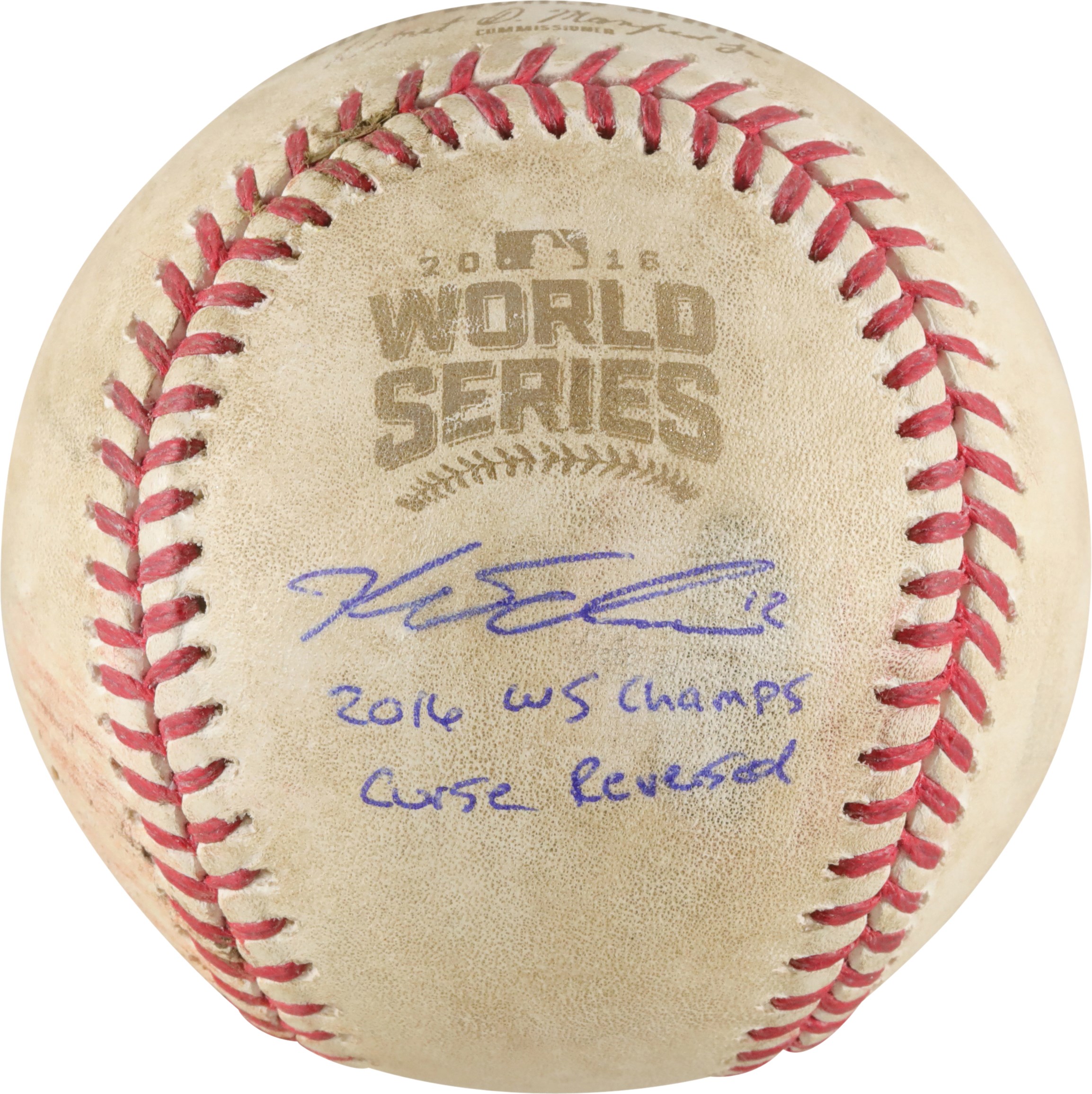 Kyle Schwarber signed and inscribed 2016 World Series Game 1, game used baseball. Schwarber signed this ball, just under the 2016 World Series logo. He added, "2016 WS Champs, Curse Reversed" below his name. This ball was pitched by Jonathan Lester, and fouled off by Francisco Lindor in the 5th inning of Game 1 of the 2016 World Series. The Cleveland Indians defeated the Chicago Cubs 6-0 in Game 1 at Progressive field in Cleveland. A MLB hologram sticker (JC 033213) and Beckett sticker (X33203) are attached to the ball.